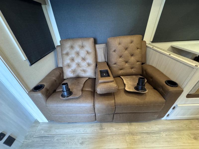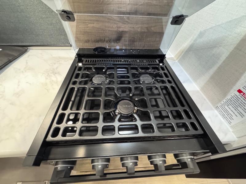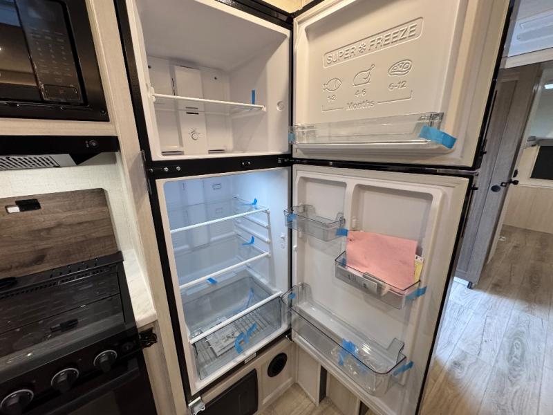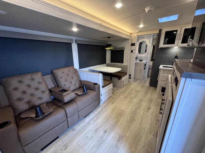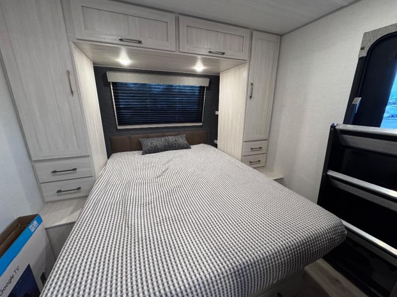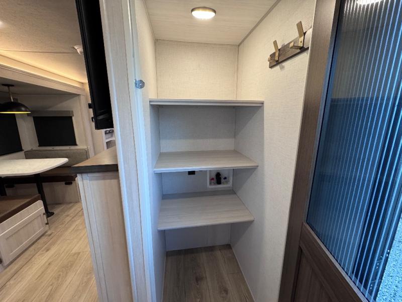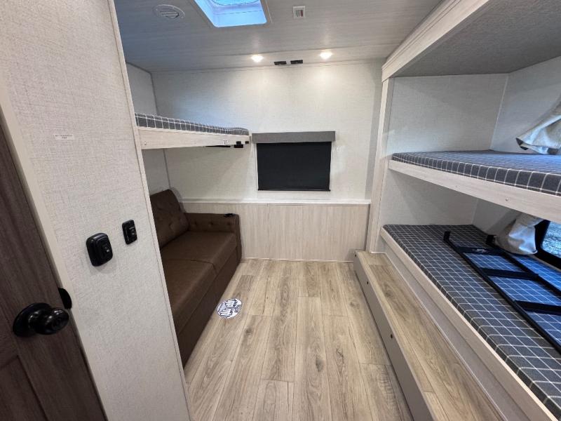 This travel trailer is perfect for larger groups or families since it can sleep up to ten people each night! There is a private bunkhouse with three bunks, a EZ-out sofa, plus storage space and a removable table! The front master bedroom is just as accommodating with its dual bedroom wardrobes, overhead cabinets, and quick access to the walk-through bath. The main living are will be a favorite hangout spot with a tri-fold sofa, a booth dinette, and an HD TV for movies. And a walk-in pantry with washer and dryer prep gives you the option to add these appliances. The chef of your group can cook meals in the fully-equipped kitchen, or head outdoors to cook on the outside kitchen. There is also a 21' electric awning here with LED lights for an inviting outdoor living space.
