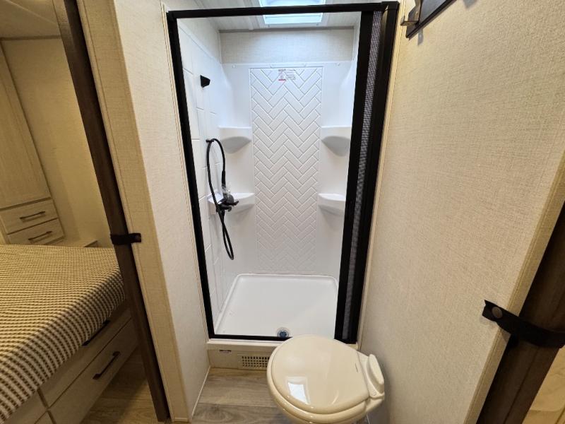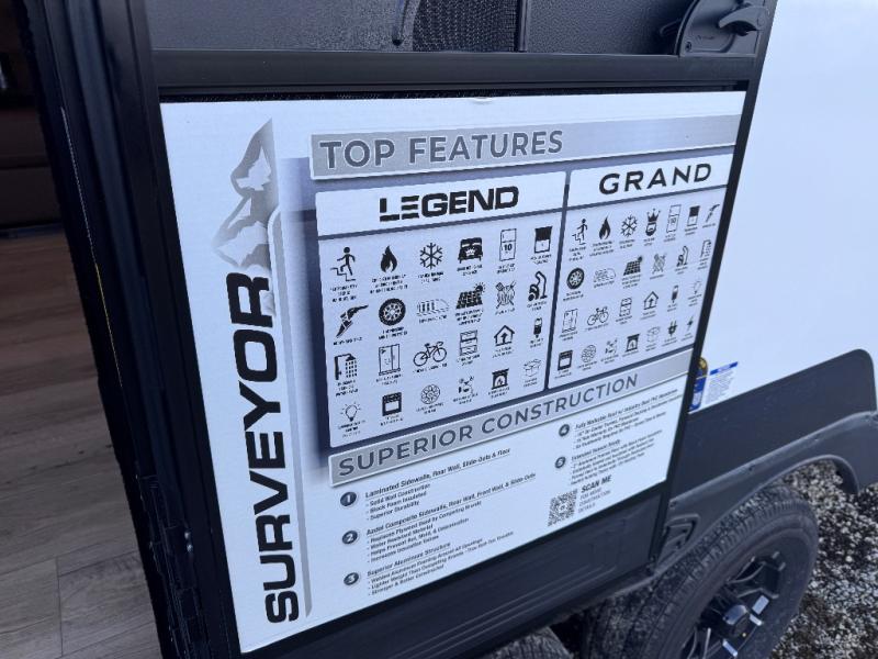 With any Surveyor Legend travel trailer by Forest River you will enjoy quality craftsmanship, convenient amenities, and at-home comforts. The Azdel composite walls provide a longer-lasting trailer, and the power tongue jack with a hitch light will get you back on the road in no-time. There are also Goodyear tires and a tire pressure monitoring system for hassle-free towing. Each model includes the Surveyor Legend Package that comes standard with oversized dinette storage access doors, front slam latch baggage doors, plus an automotive style tinted front windshield. You'll appreciate camping with a tankless water heater for endless hot showers, a 2" accessory hitch to bring bikes along, plus carpet-free interiors and a central vacuum system for easy clean up.
