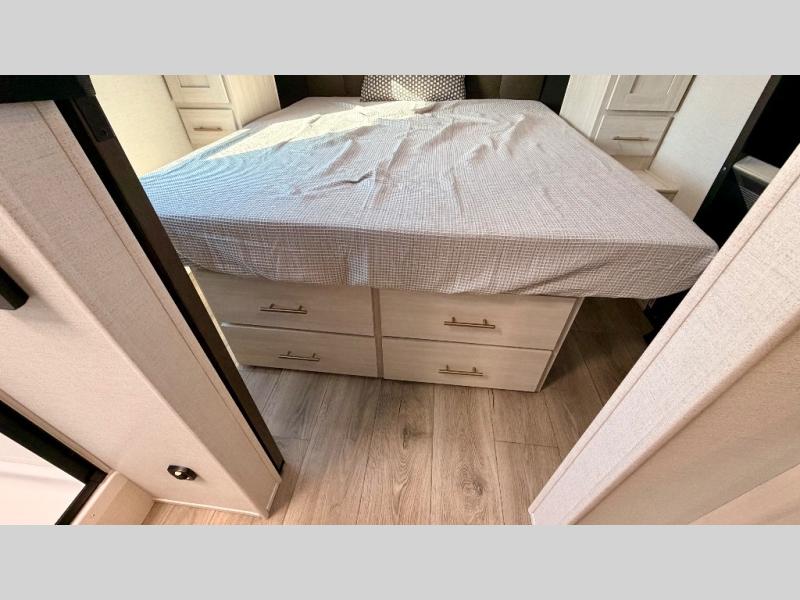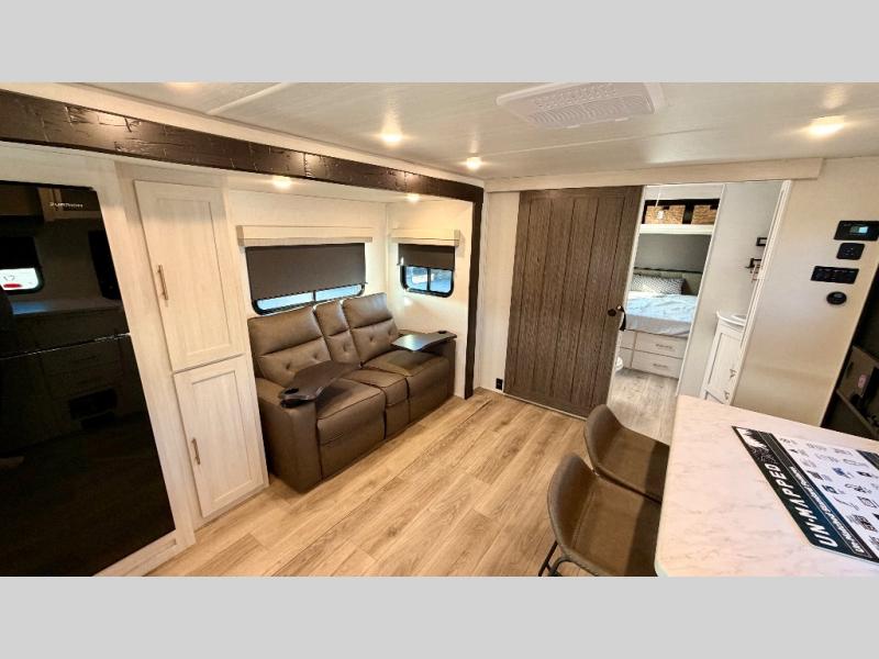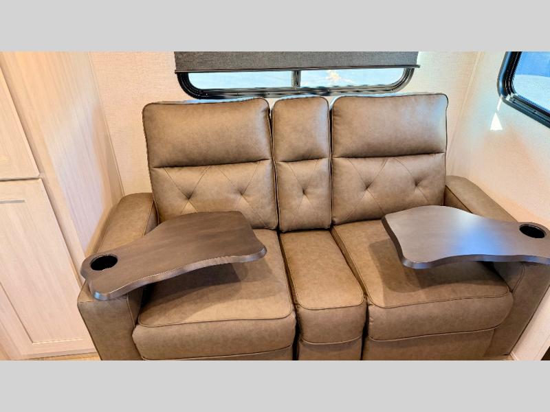 The central living area is anchored by plush theater seating, offering a cinematic-style experience for relaxing after a long day of adventure. The walk-through bathroom is a clever design choice, providing a spacious, private corridor that leads into the well-appointed front bedroom. Here, you'll find a massive king-size bed flanked by dual wardrobes and end tables, offering a level of comfort and organization usually reserved for much larger units.