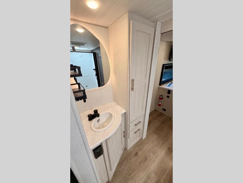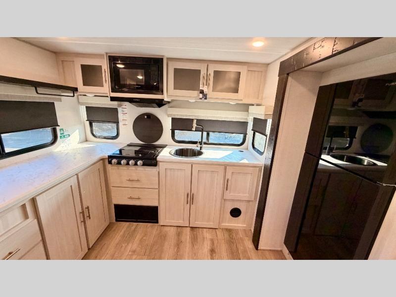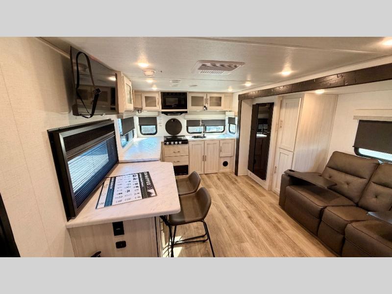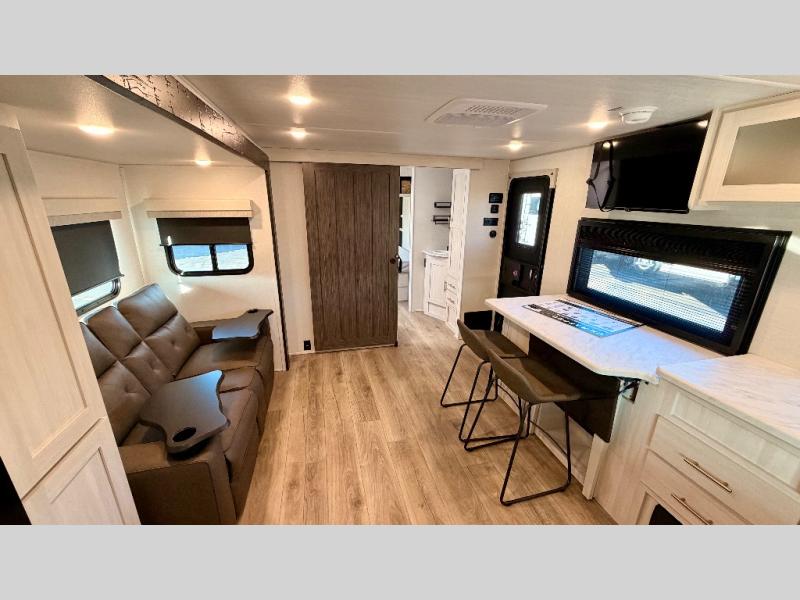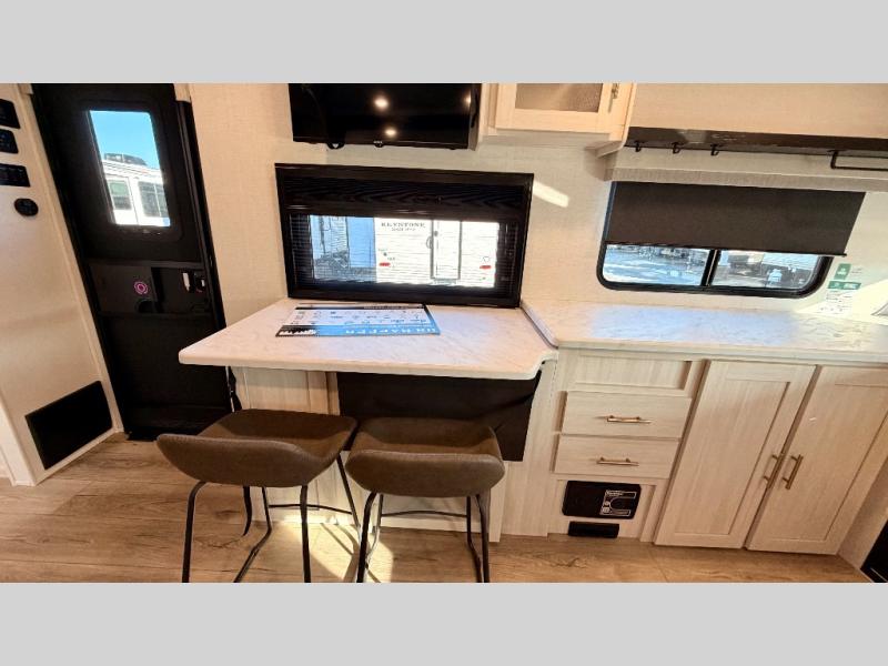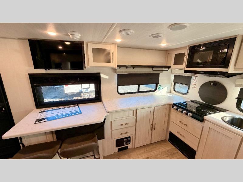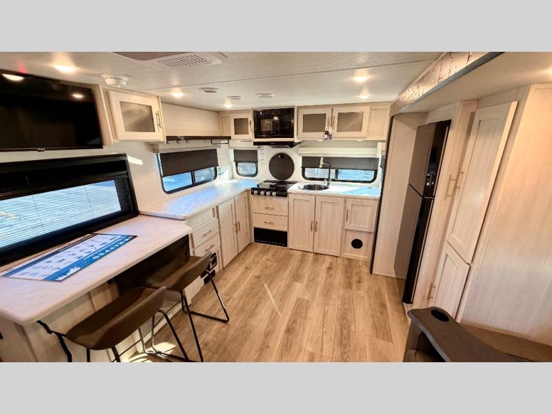 Experience a new level of functionality in this rear-kitchen masterpiece! The 24RK is designed for those who love to cook and entertain, featuring a rear kitchen equipped with an air fryer/microwave, a dedicated pantry, and ample overhead cabinetry. The standout feature is the bar top table situated in front of a flip-up window, which blurs the lines between your indoor kitchen and the great outdoors—perfect for passing out snacks or enjoying a breeze while you meal prep.