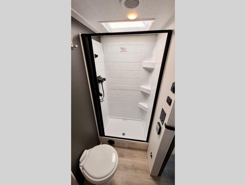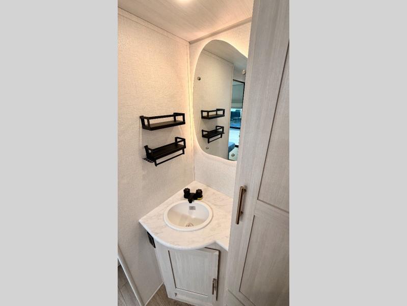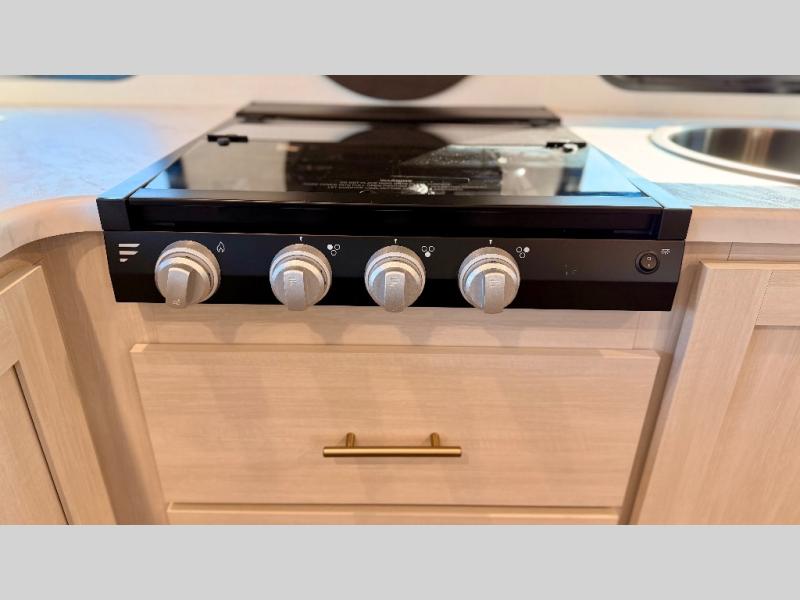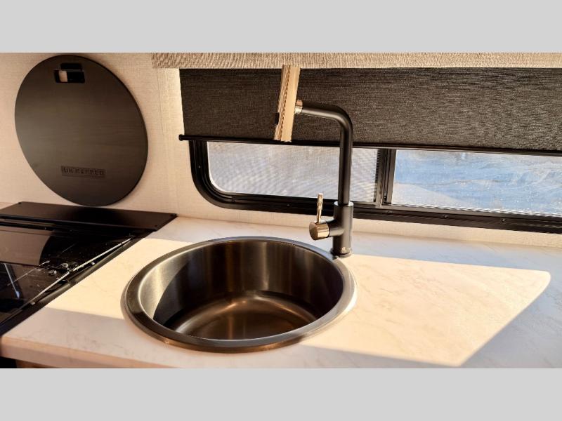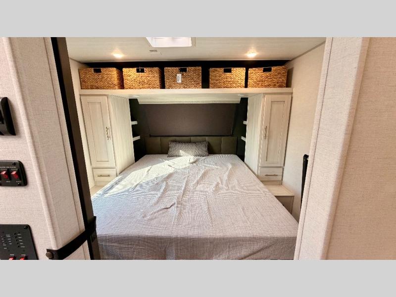 For the eco-conscious traveler, the unit comes standard with a 30-amp charge controller and solar inverter prep, making it easy to transition to off-grid power systems. Inside, you'll appreciate the high-end finish of the Surf-X seamless countertops, which are both stylish and water-resistant. The addition of blackout roller shades throughout ensures you have total control over privacy and light, whether you're at a crowded park or a secluded trailhead. With its exterior awning and outdoor kitchen, the 24RK is fully equipped for the ultimate outdoor lifestyle.
