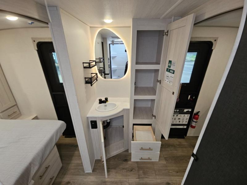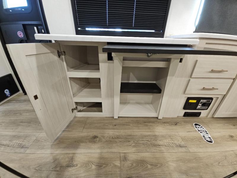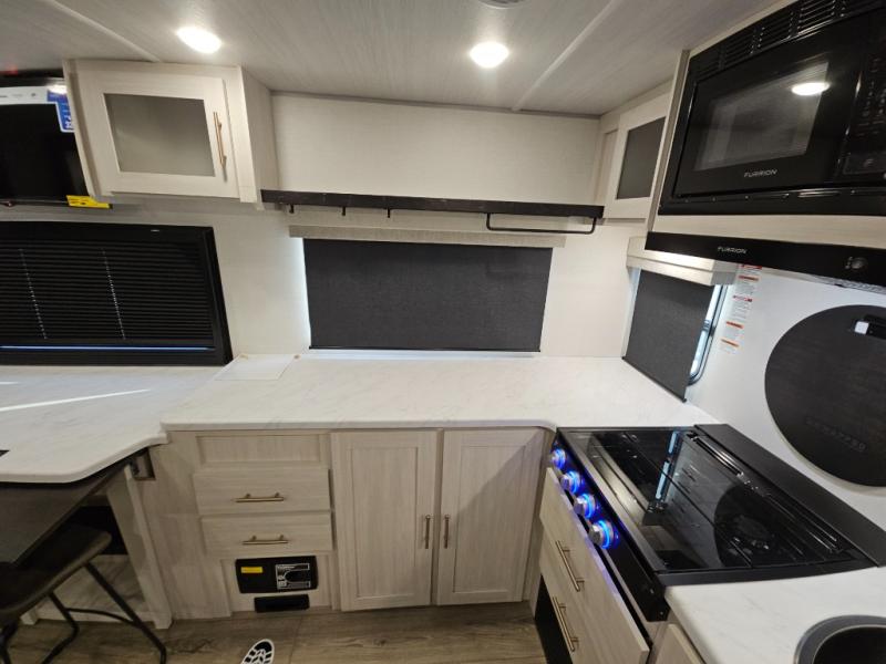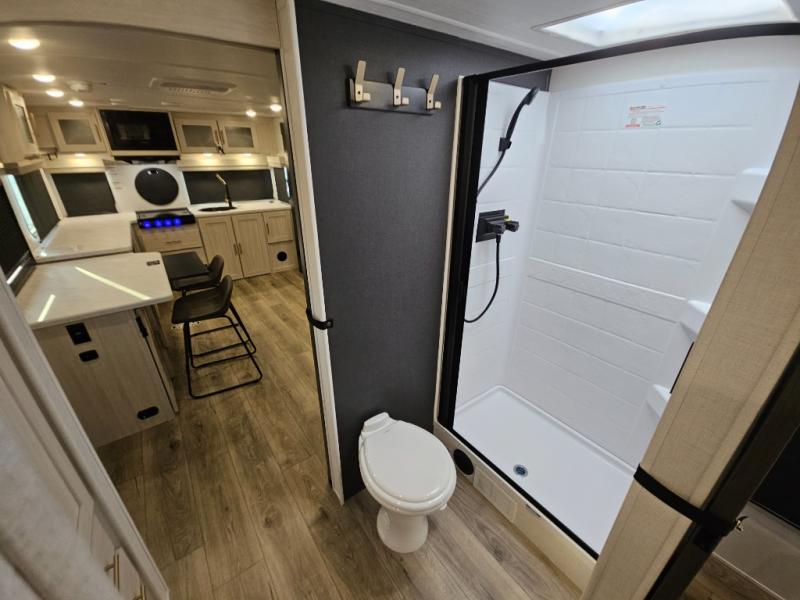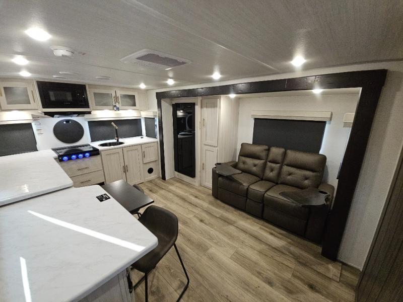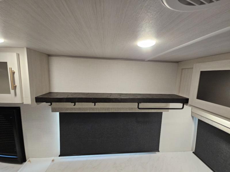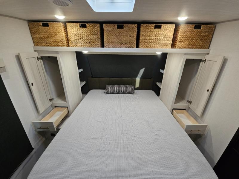 This travel trailer's functional rear kitchen boasts an air fryer/microwave that combines convenience for quick and healthy meal preparation, a shelf, overhead cabinets offering ample storage for culinary supplies and travel items, a fridge, and a pantry that delivers convenient storage for snacks and provisions. Plus, the bar 2 table creates a flexible space for casual dining and socializing, and the flip-up window enhances ventilation and brings in natural light for a bright kitchen ambiance. You can also rest a bit in the theater seating that provides comfortable, cinematic-style seating for relaxation. In the center of this RV, you will find a walk-through bathroom, adding convenience to the unit, and further, you will be mesmerized by the well-appointed front bedroom. Designed for two, this space offers a king-size bed, end tables, and a wardrobe on each side of the bed, featuring ample storage and convenient bedside spaces for comfort and organization.
