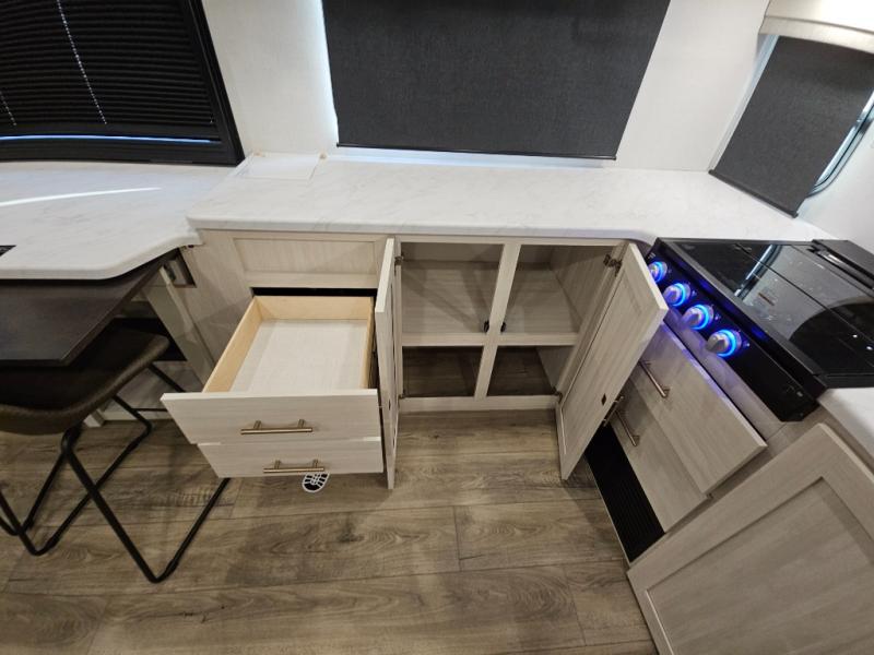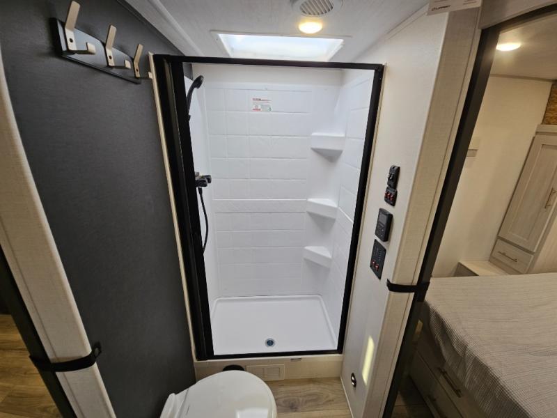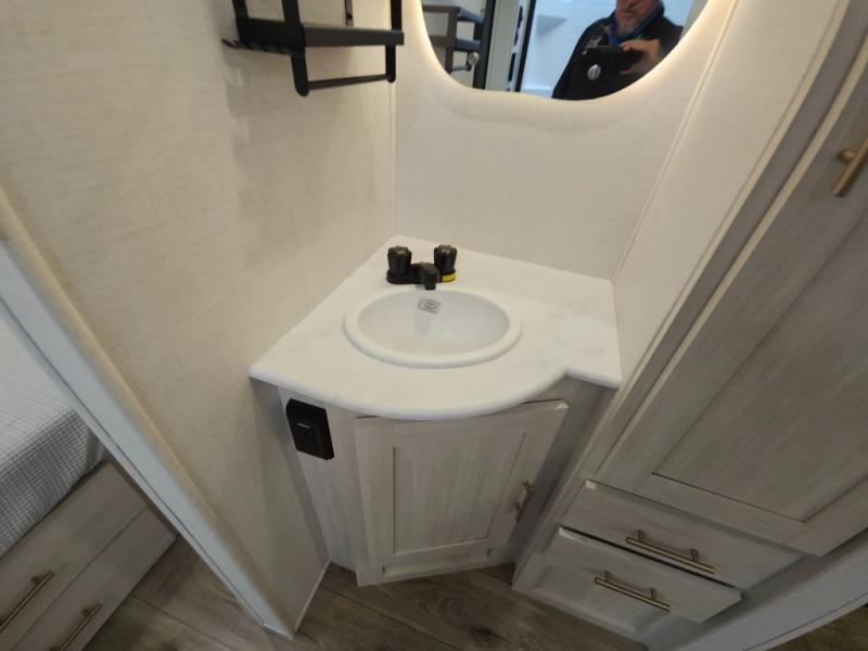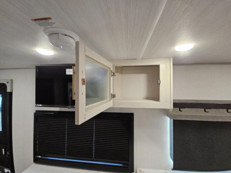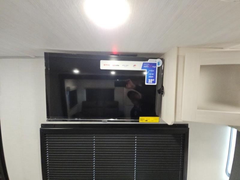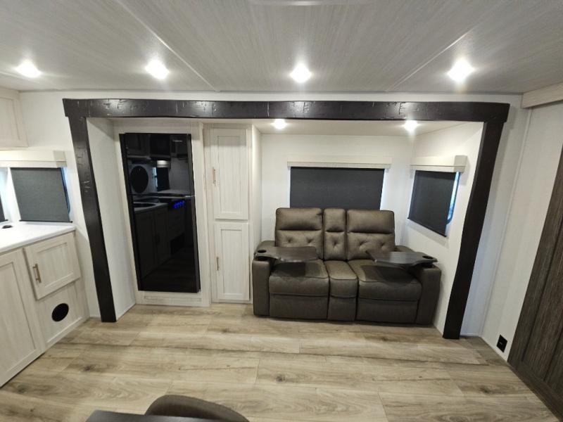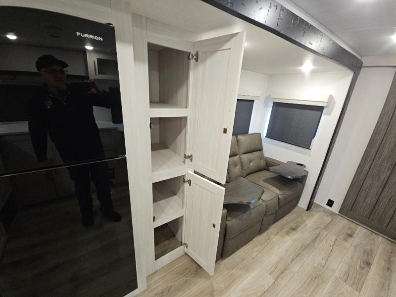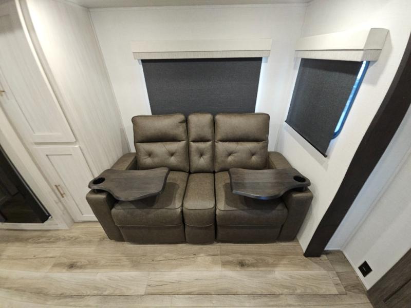 This travel trailer's functional rear kitchen boasts an air fryer/microwave that combines convenience for quick and healthy meal preparation, a shelf, overhead cabinets offering ample storage for culinary supplies and travel items, a fridge, and a pantry that delivers convenient storage for snacks and provisions. Plus, the bar 2 table creates a flexible space for casual dining and socializing, and the flip-up window enhances ventilation and brings in natural light for a bright kitchen ambiance. You can also rest a bit in the theater seating that provides comfortable, cinematic-style seating for relaxation. In the center of this RV, you will find a walk-through bathroom, adding convenience to the unit, and further, you will be mesmerized by the well-appointed front bedroom. Designed for two, this space offers a king-size bed, end tables, and a wardrobe on each side of the bed, featuring ample storage and convenient bedside spaces for comfort and organization.