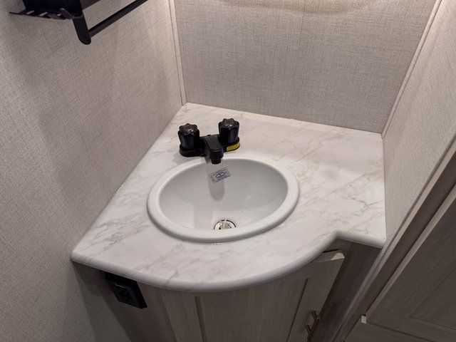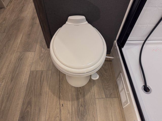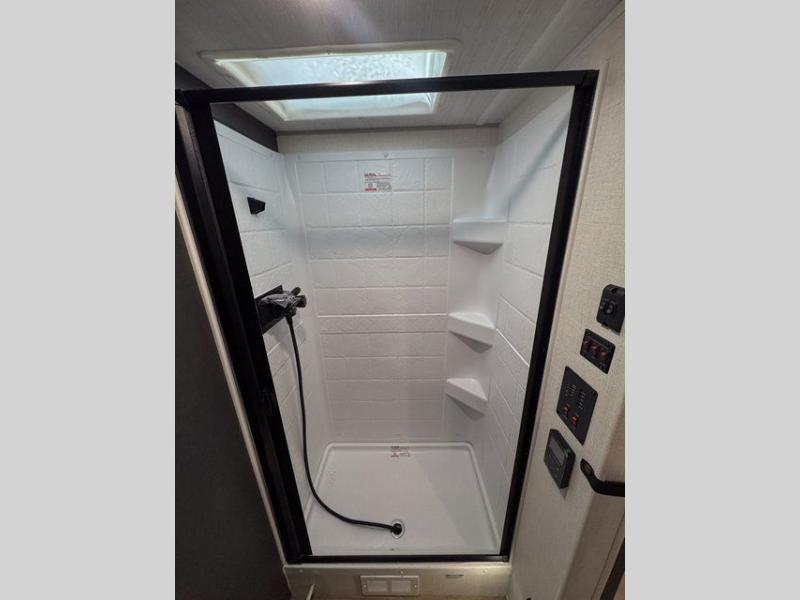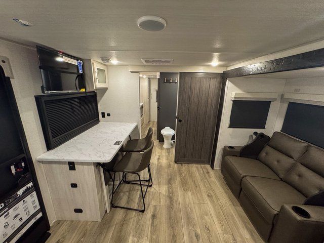 The main living space is built for comfort with plush theater seating, perfect for movie nights or relaxing after a day outdoors. Large windows and blackout roller shades allow you to control natural light while maintaining privacy.