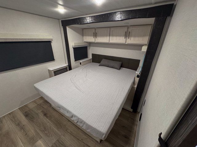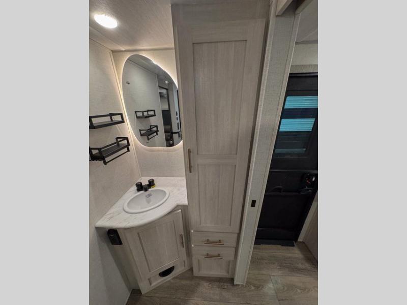 After a full day of adventure, retreat to the serene rear bedroom featuring a custom king bed for true residential comfort. You’ll appreciate the added storage from the dresser and linen closet, keeping clothing and essentials organized for extended trips. A built-in fireplace adds warmth and ambiance, creating a cozy atmosphere you won’t expect in a travel trailer.
