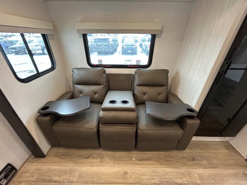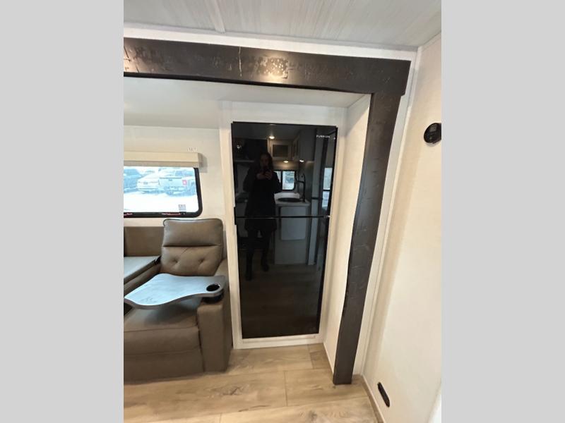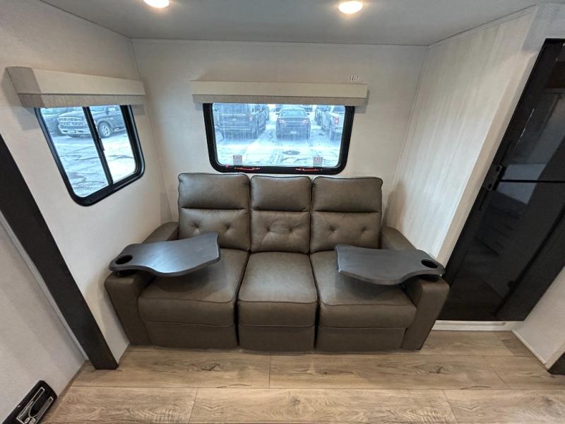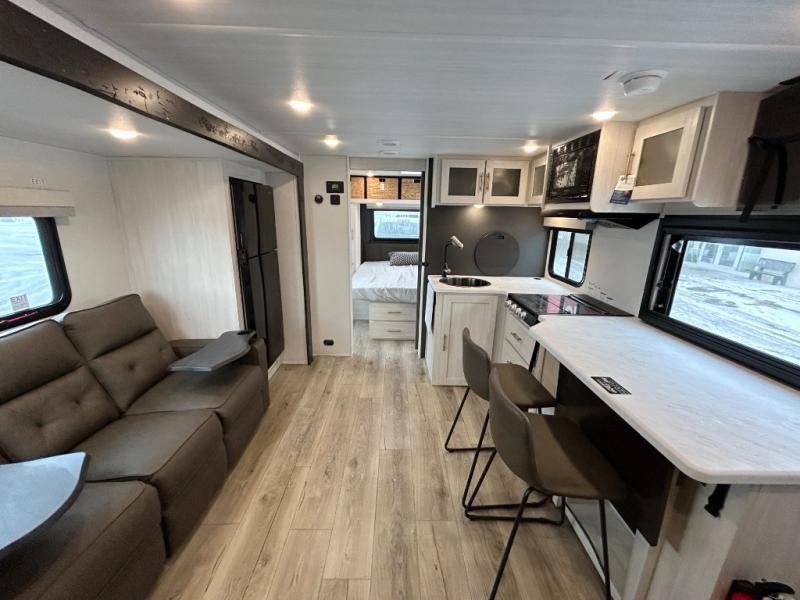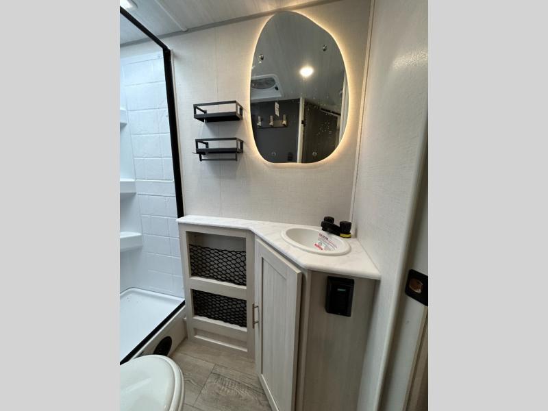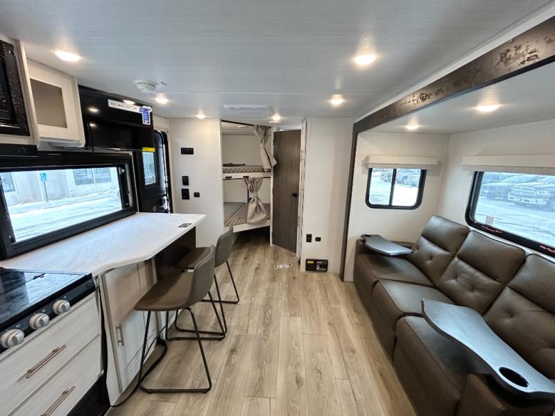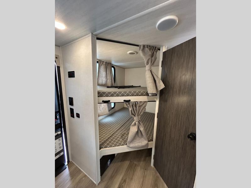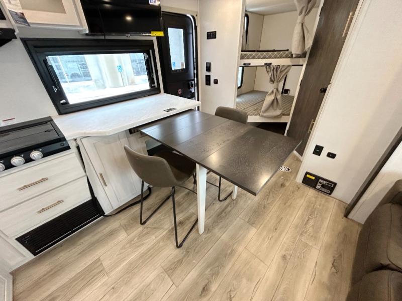 Discover ultimate comfort and functionality in travel with this incredible travel trailer. The full bathroom is a practical and functional space for personal care, ensuring comfort on every journey. Double bunk beds are ideal for families or travelers seeking additional cozy sleeping options. You can cook like a Michelin-star chef with the complete kitchen that comes with a pantry, fridge, an air fryer/microwave, and a countertop extension that adds extra space for culinary prep and serving meals with ease. Further, the dreamy primary bedroom features a custom king bed with wardrobes and end tables on each side of the bed, offering storage and practical spaces for optimal comfort and accessibility.