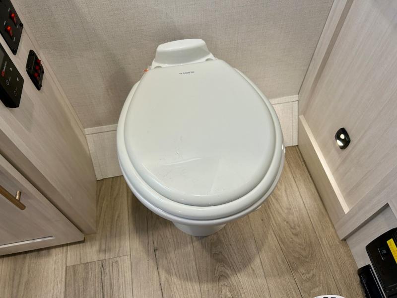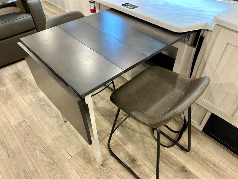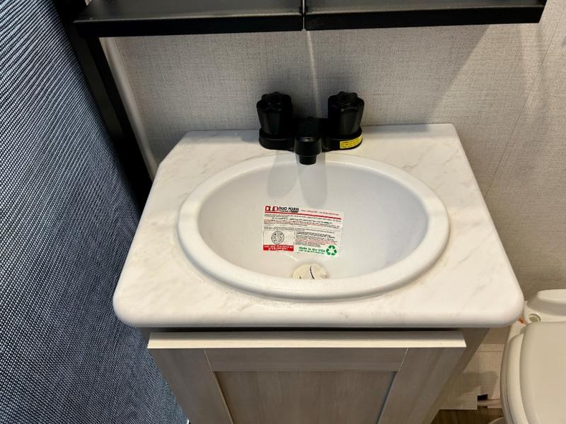 This travel trailer offers a comfortable and convenient layout rear bathroom with a linen closet, a private, well-appointed space for personal care with storage for linens, ensuring comfort on every journey. In the living room/kitchen combined area, you will find theater seating, a tri-fold sofa that offers versatile seating and additional space for guests or relaxation, adaptable to your travel needs, a fridge, a pantry for culinary supplies, an air fryer /microwave, a flip-up window, and overhead cabinets. The front bedroom will be your sanctuary of relaxation after a long day of exploring. The outside kitchen is the cherry on top, since it is ideal for alfresco cooking and dining, perfect for savoring meals amidst scenic surroundings and enjoying the outdoors with loved ones!