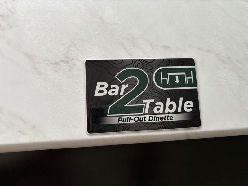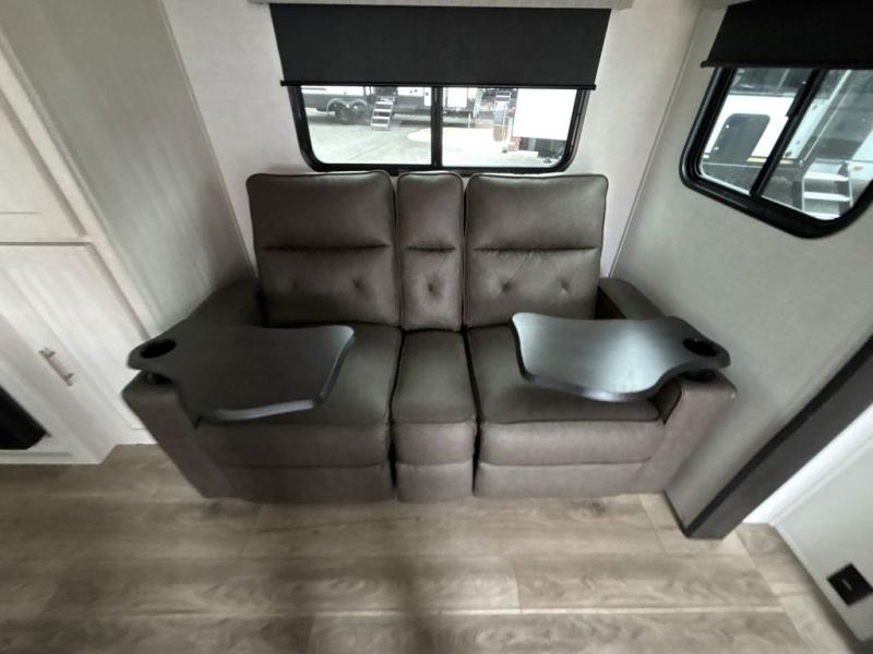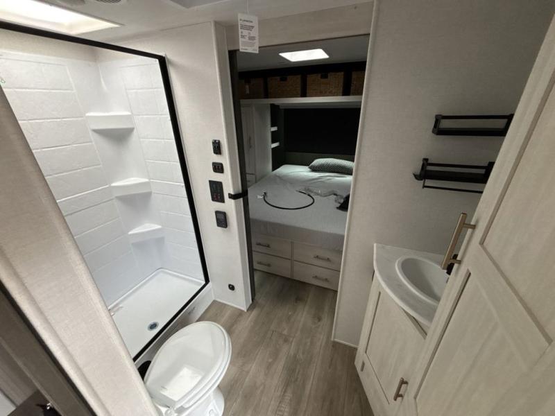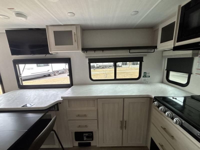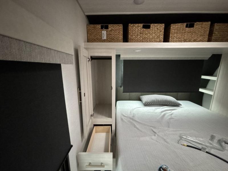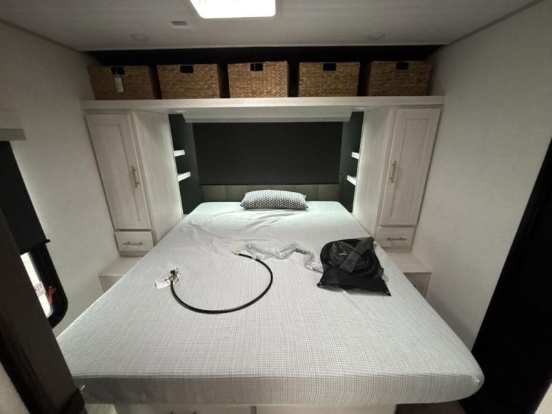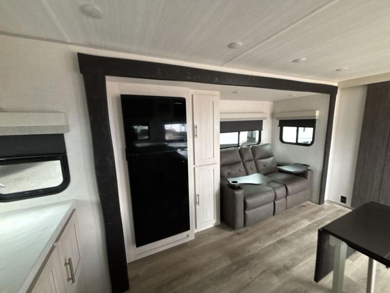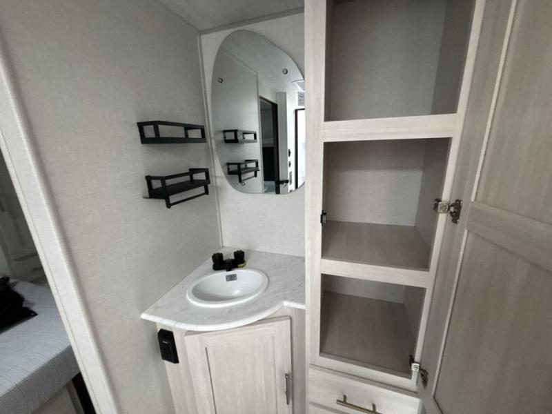 This travel trailer's functional rear kitchen boasts an air fryer/microwave that combines convenience for quick and healthy meal preparation, a shelf, overhead cabinets offering ample storage for culinary supplies and travel items, a fridge, and a pantry that delivers convenient storage for snacks and provisions. Plus, the bar 2 table creates a flexible space for casual dining and socializing, and the flip-up window enhances ventilation and brings in natural light for a bright kitchen ambiance. You can also rest a bit in the theater seating that provides comfortable, cinematic-style seating for relaxation. In the center of this RV, you will find a walk-through bathroom, adding convenience to the unit, and further, you will be mesmerized by the well-appointed front bedroom. Designed for two, this space offers a king-size bed, end tables, and a wardrobe on each side of the bed, featuring ample storage and convenient bedside spaces for comfort and organization.
