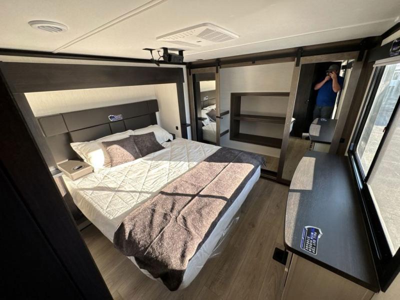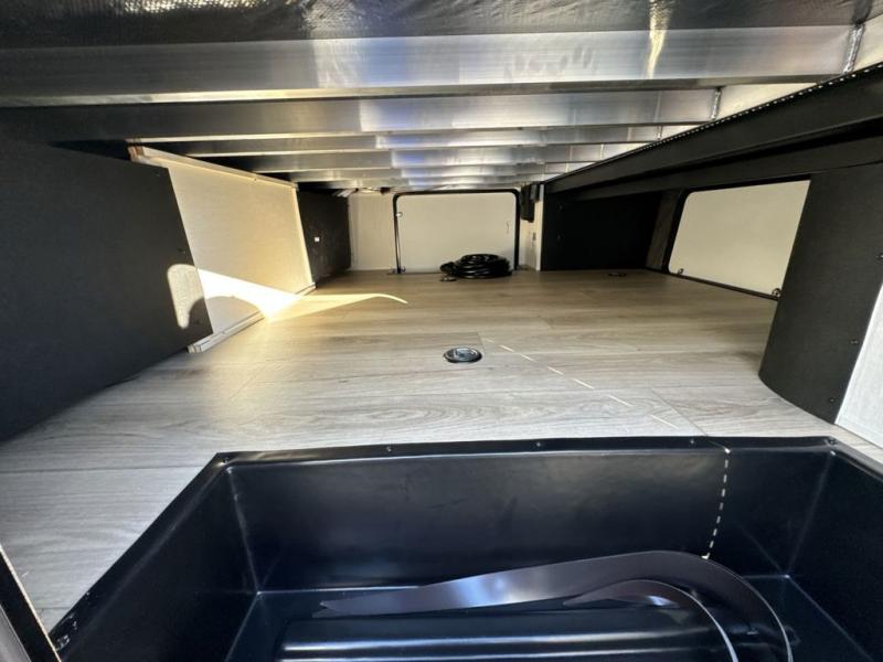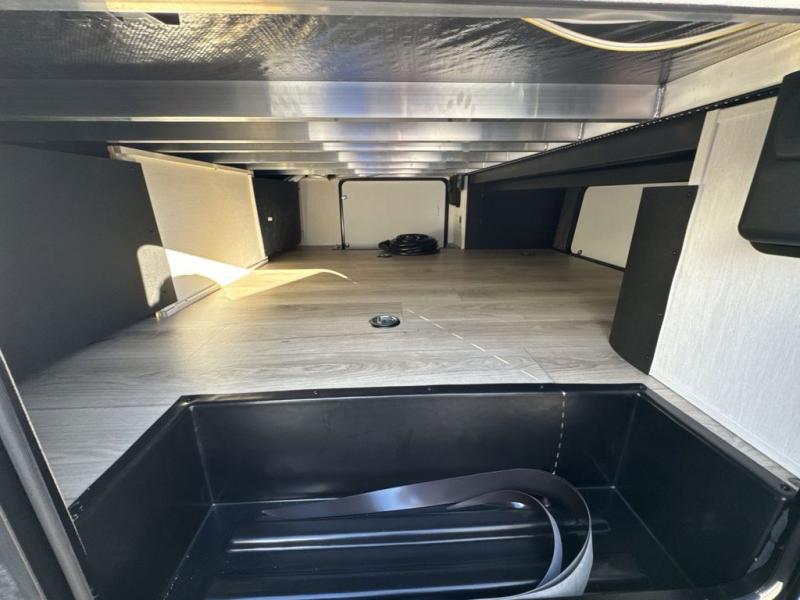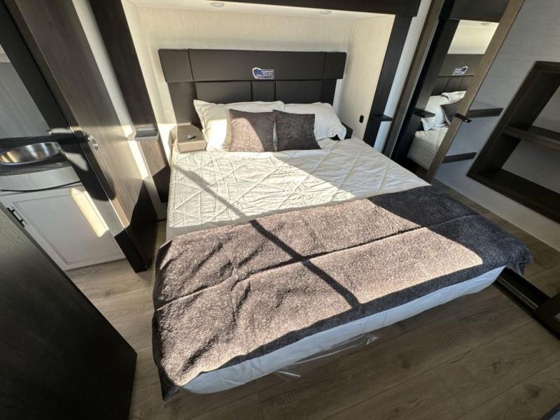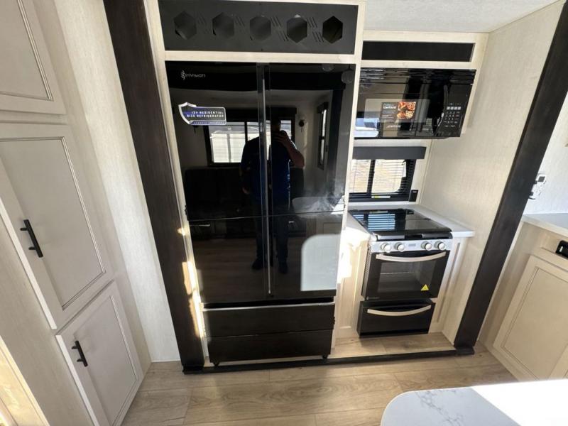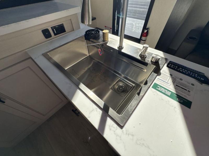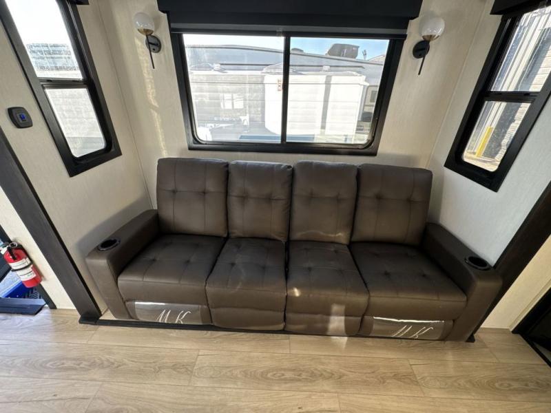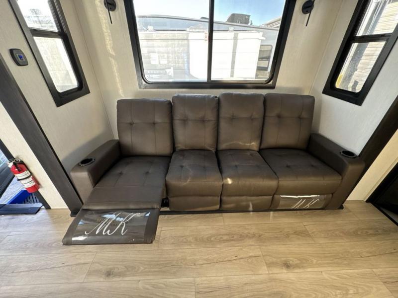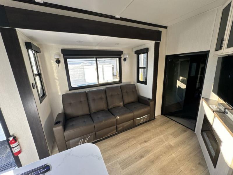 There is ample space in this triple slide out toy hauler for toys, gear, friends and more! The front private bedroom has a king bed slide to lay your head on at night, a front wall wardrobe, a dresser to keep your clothes looking nice, plus an entrance into the bathroom. The kitchen has a counter peninsula to prepare your meals, and a 12V glass residential-style refrigerator to store any leftovers. The garage area has a loft, opposing flip-up sofas with a table in between and a raised queen bed above them, as well as a second entry door. And the half bath/utility bath is an extra bonus when camping with friends!