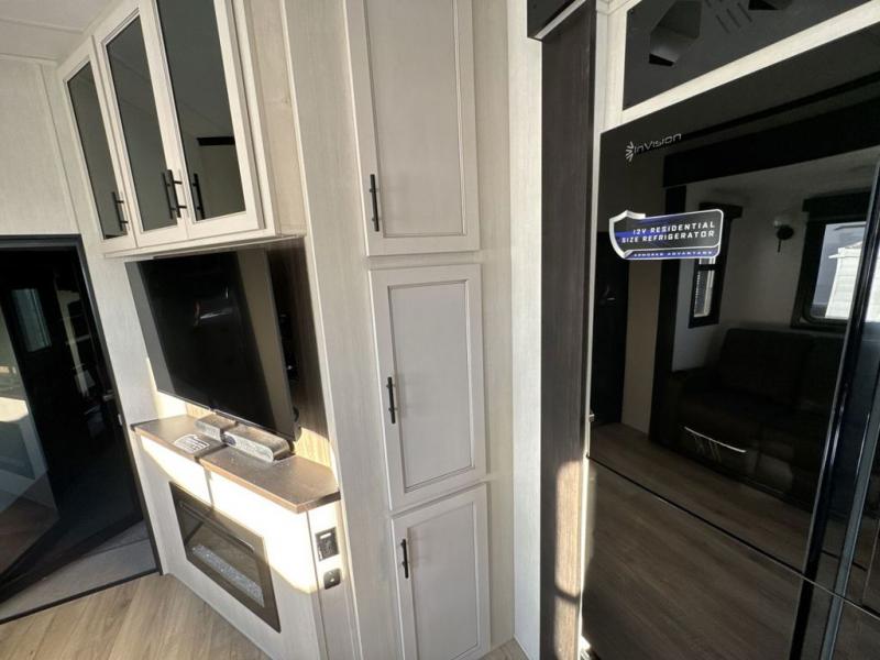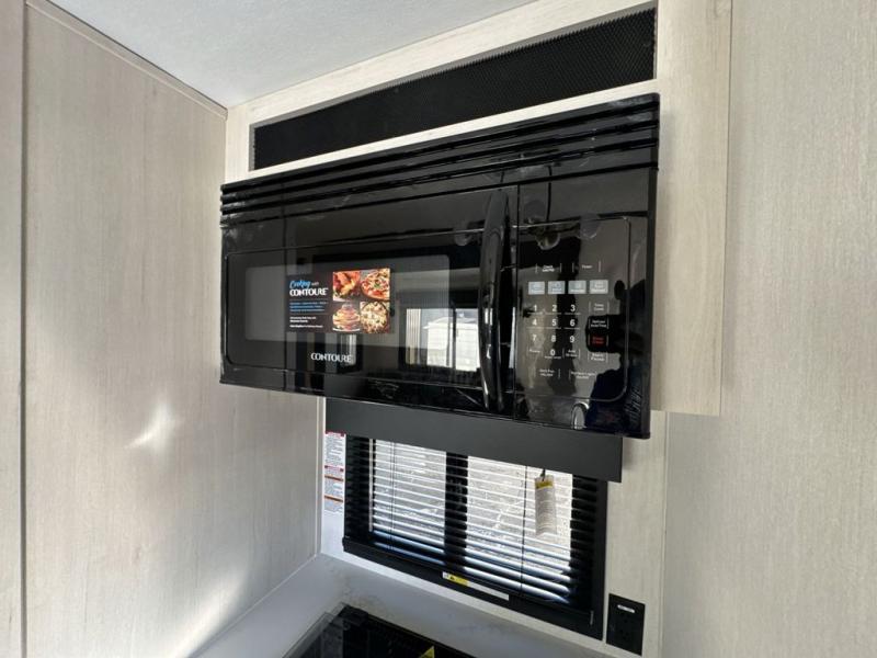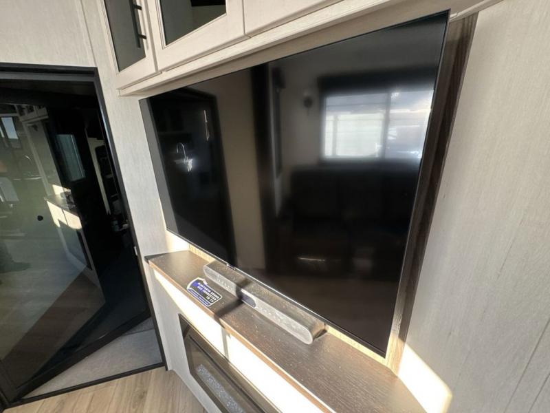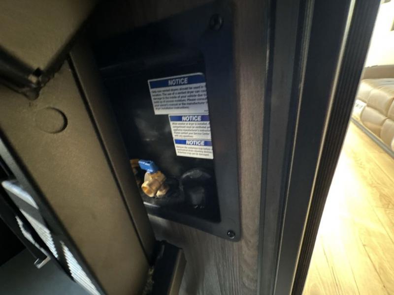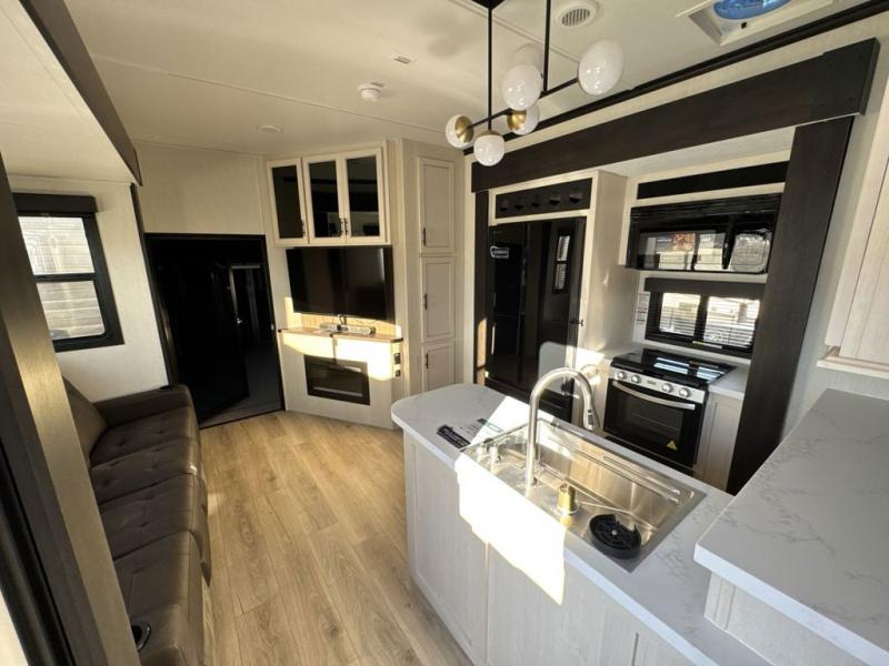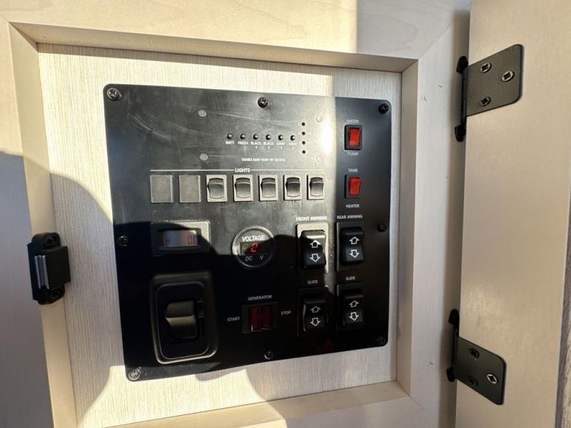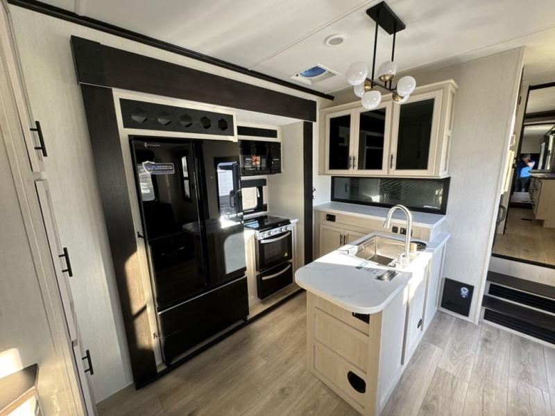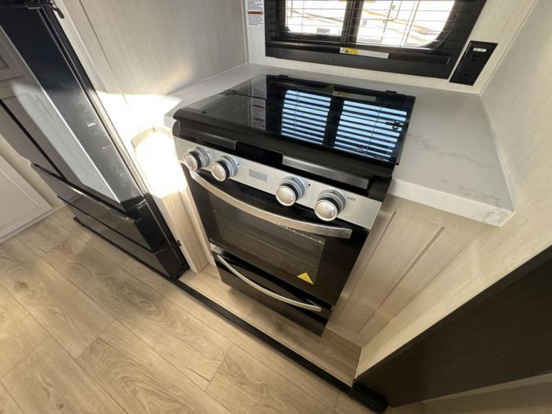 There is ample space in this triple slide out toy hauler for toys, gear, friends and more! The front private bedroom has a king bed slide to lay your head on at night, a front wall wardrobe, a dresser to keep your clothes looking nice, plus an entrance into the bathroom. The kitchen has a counter peninsula to prepare your meals, and a 12V glass residential-style refrigerator to store any leftovers. The garage area has a loft, opposing flip-up sofas with a table in between and a raised queen bed above them, as well as a second entry door. And the half bath/utility bath is an extra bonus when camping with friends!
