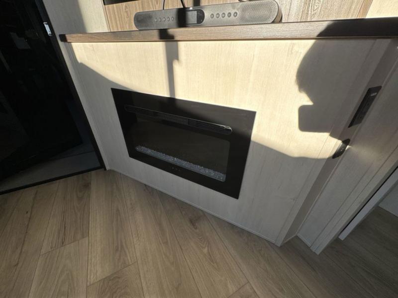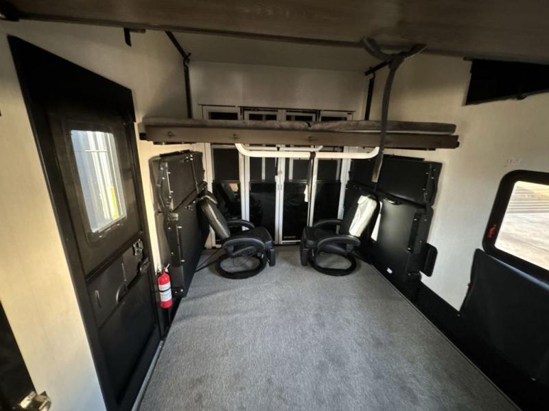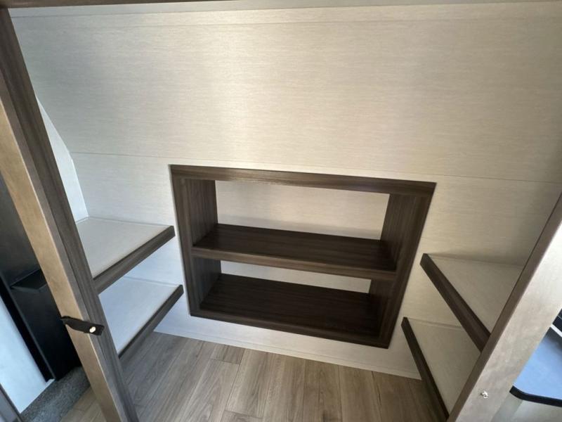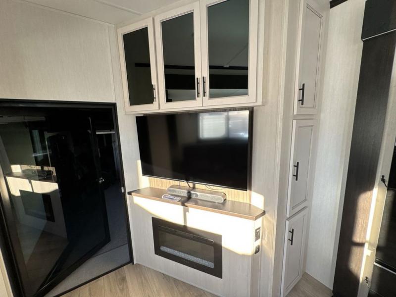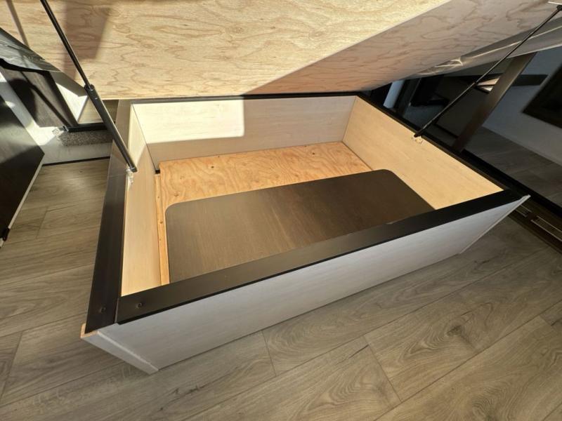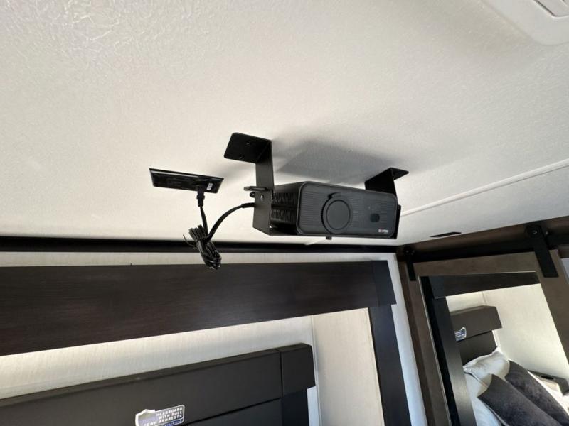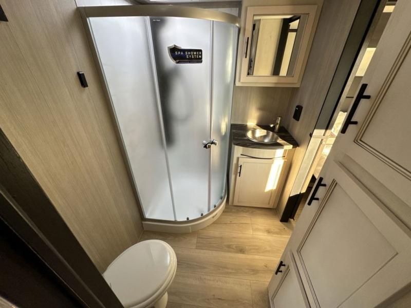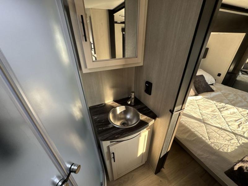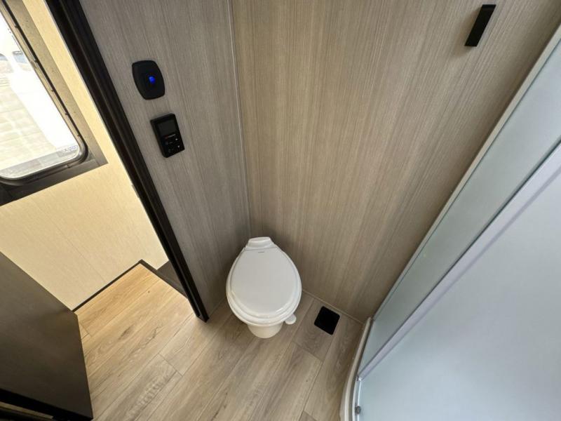 There is ample space in this triple slide out toy hauler for toys, gear, friends and more! The front private bedroom has a king bed slide to lay your head on at night, a front wall wardrobe, a dresser to keep your clothes looking nice, plus an entrance into the bathroom. The kitchen has a counter peninsula to prepare your meals, and a 12V glass residential-style refrigerator to store any leftovers. The garage area has a loft, opposing flip-up sofas with a table in between and a raised queen bed above them, as well as a second entry door. And the half bath/utility bath is an extra bonus when camping with friends!