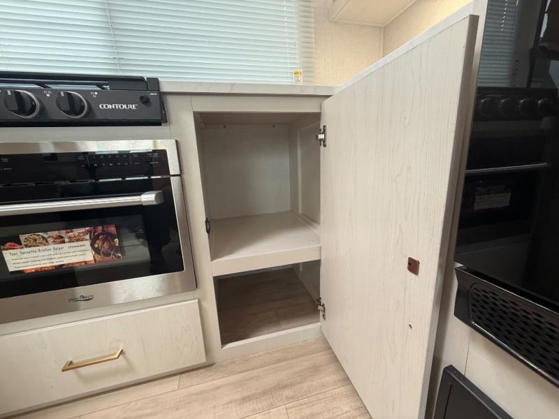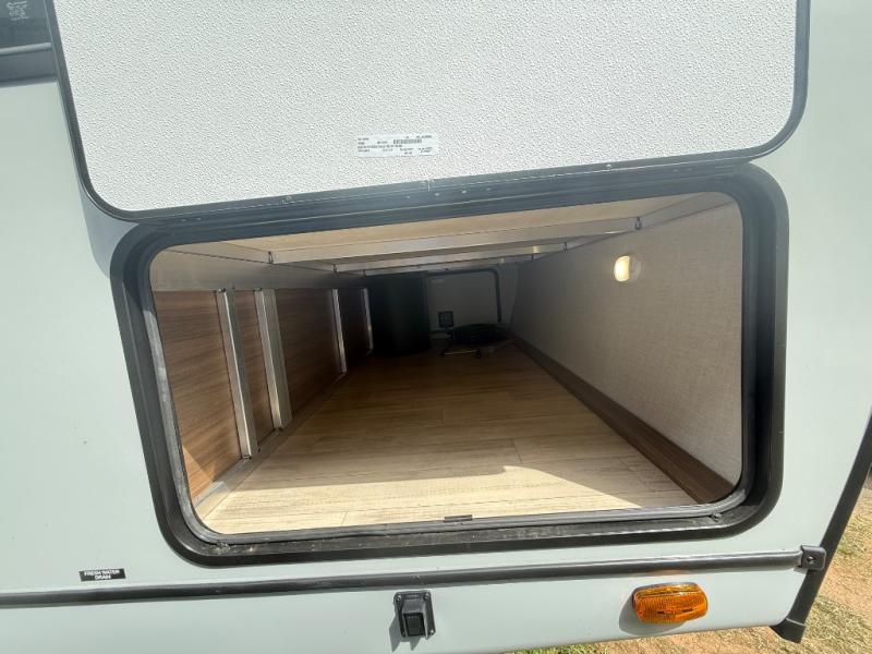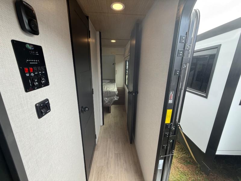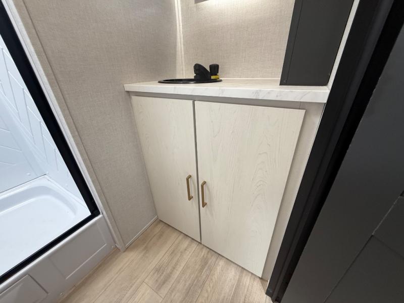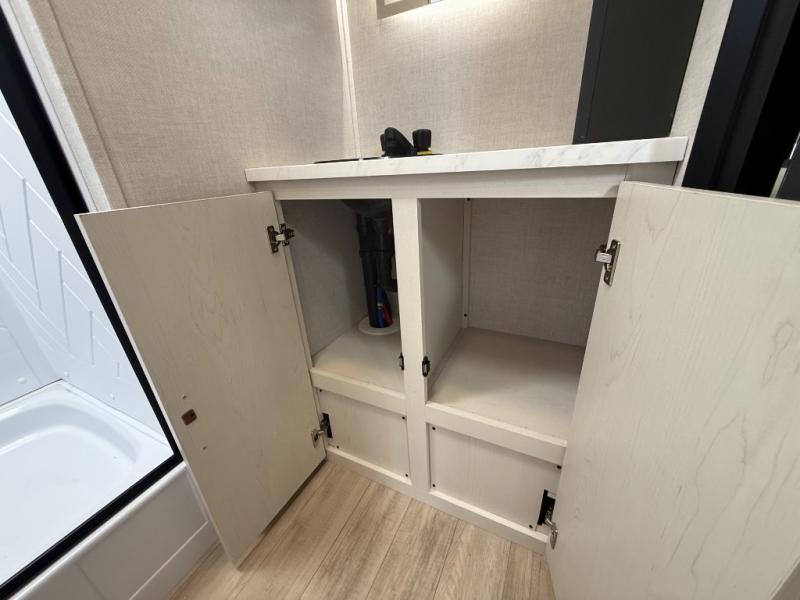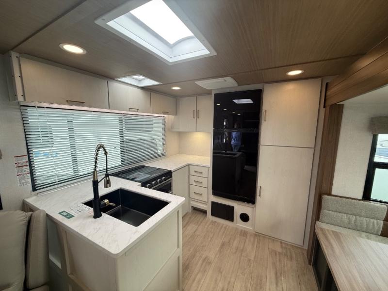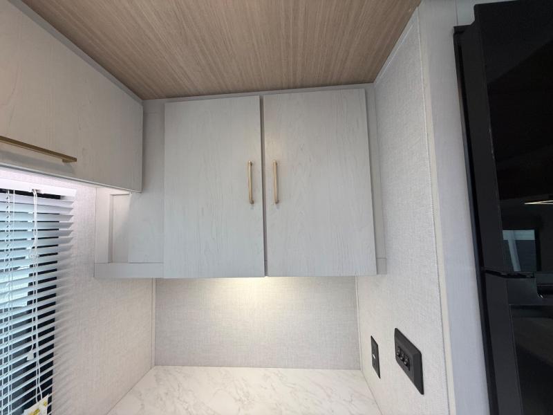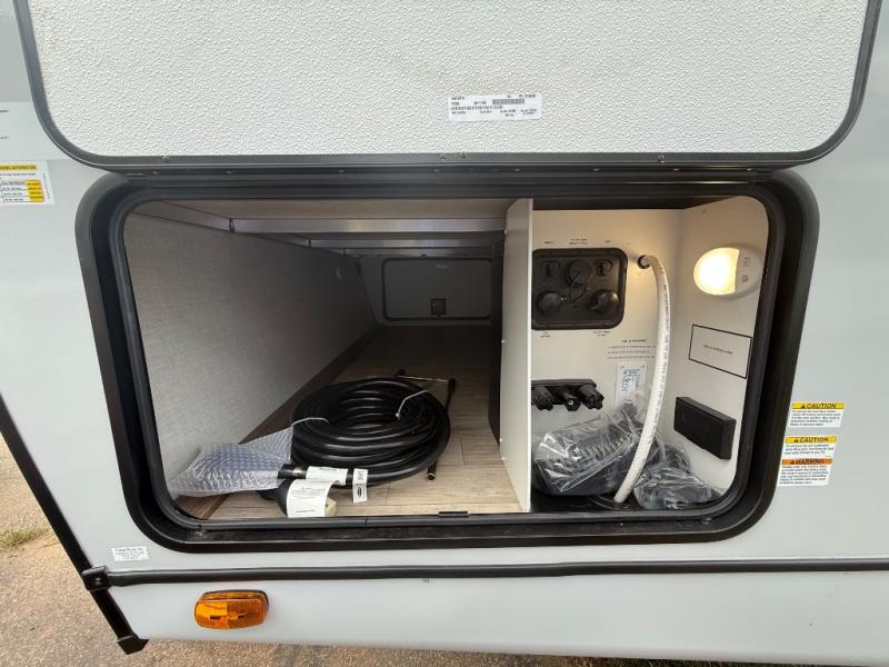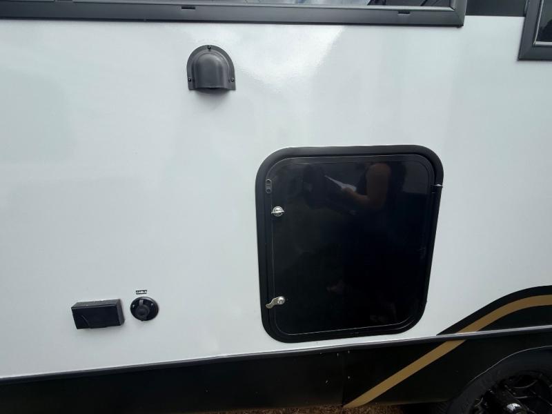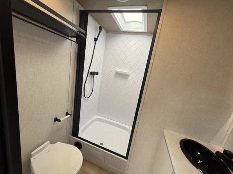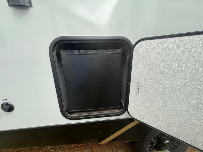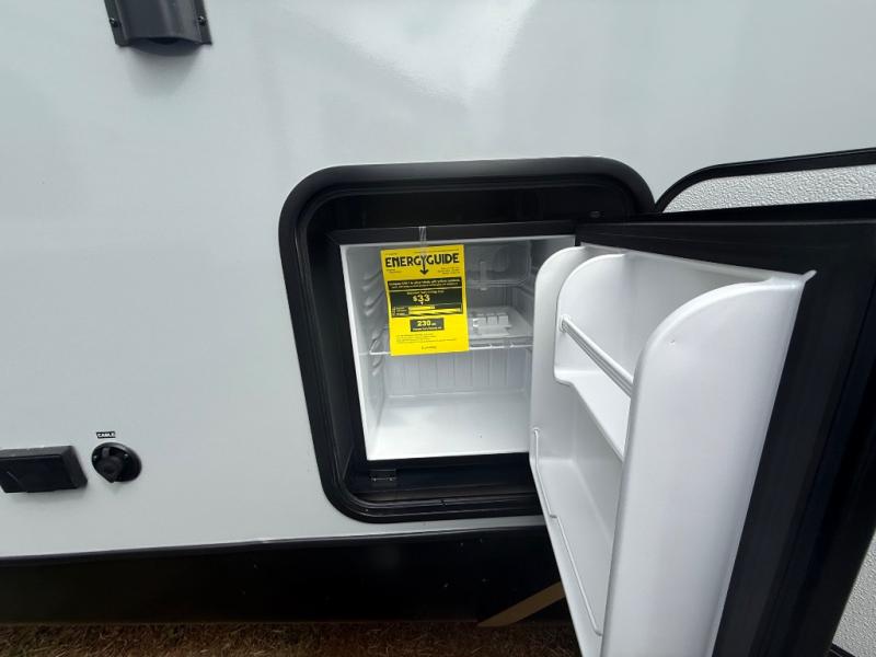Escape to the great outdoors in this Vibe travel trailer. Once you arrive at your campsite, set up the 20' electric awning with LED lights, then grab the fishing poles from the large pass-through storage. You can make lunch on the electric oven/air fryer, and your food can be stored in the 12V refrigerator. The spacious full bath includes a 36" x 30" walk-in shower to clean up every day, and there is a linen closet to store clean towels and necessities.