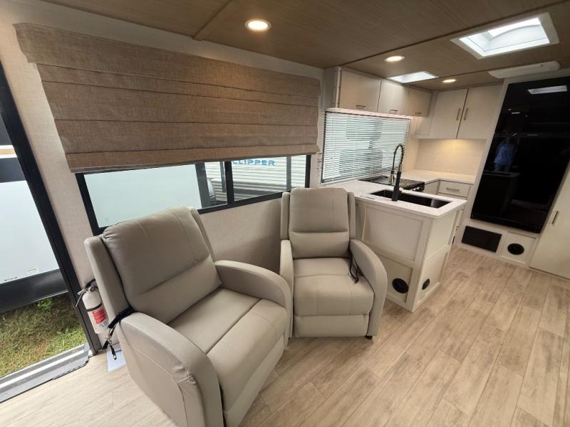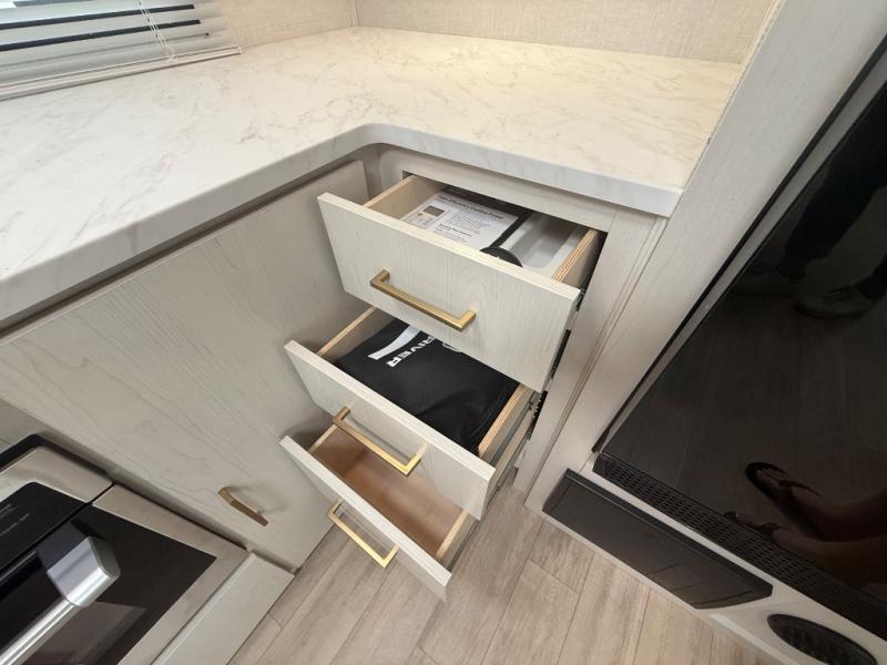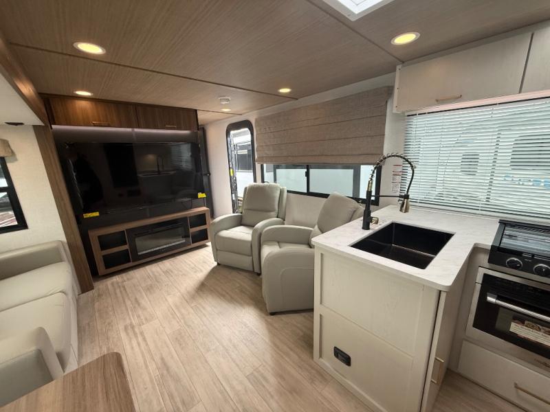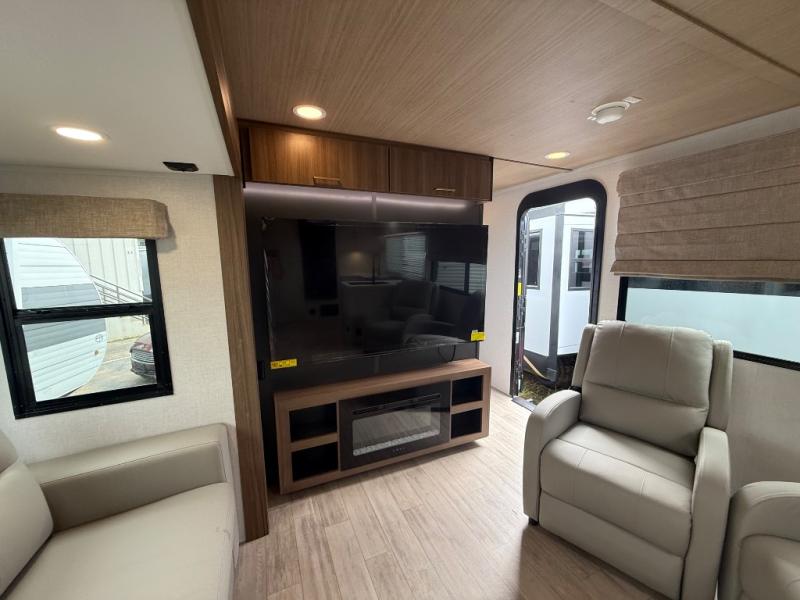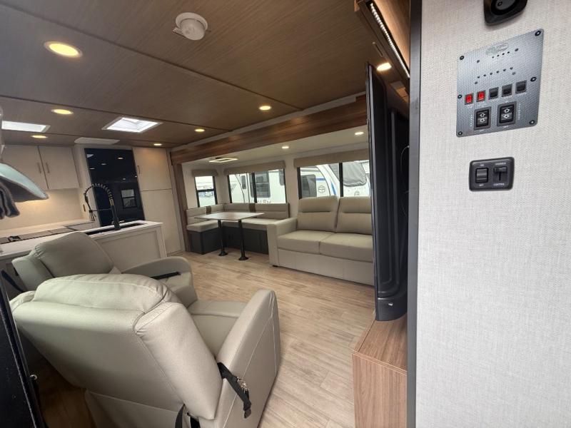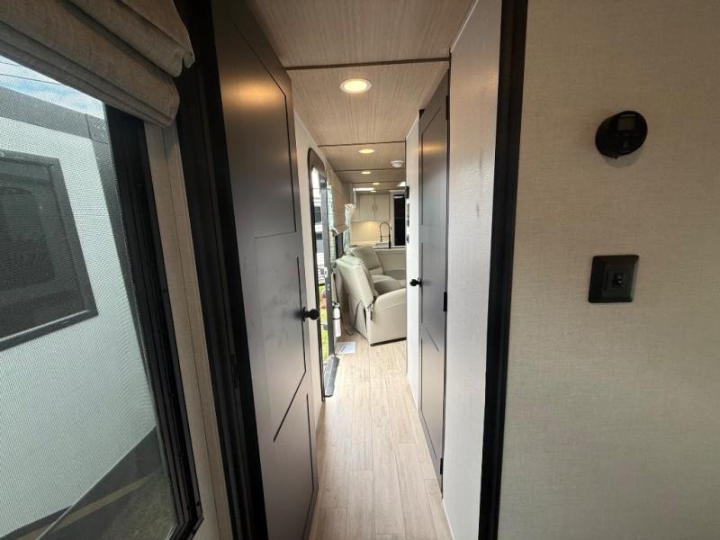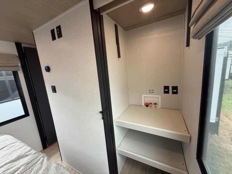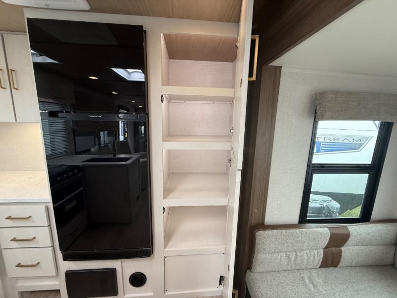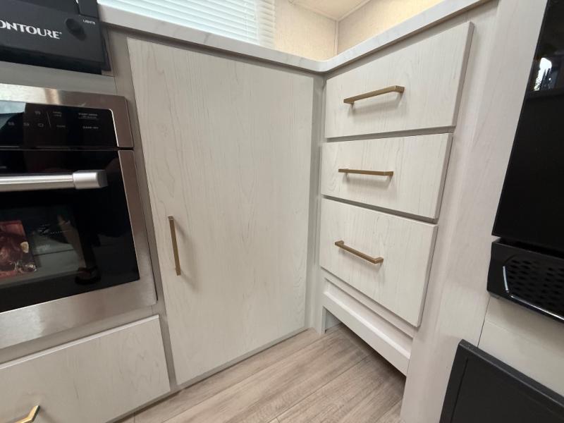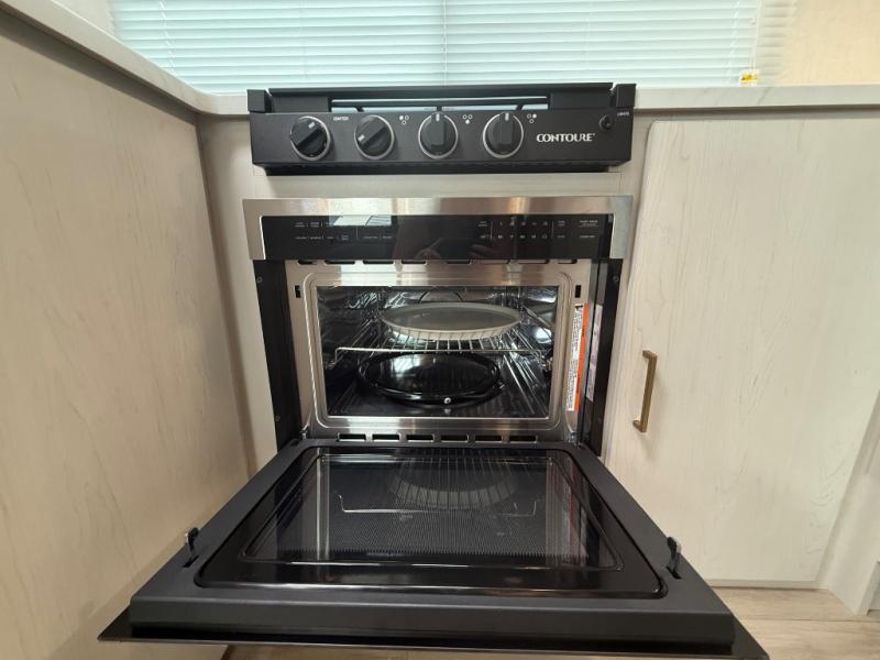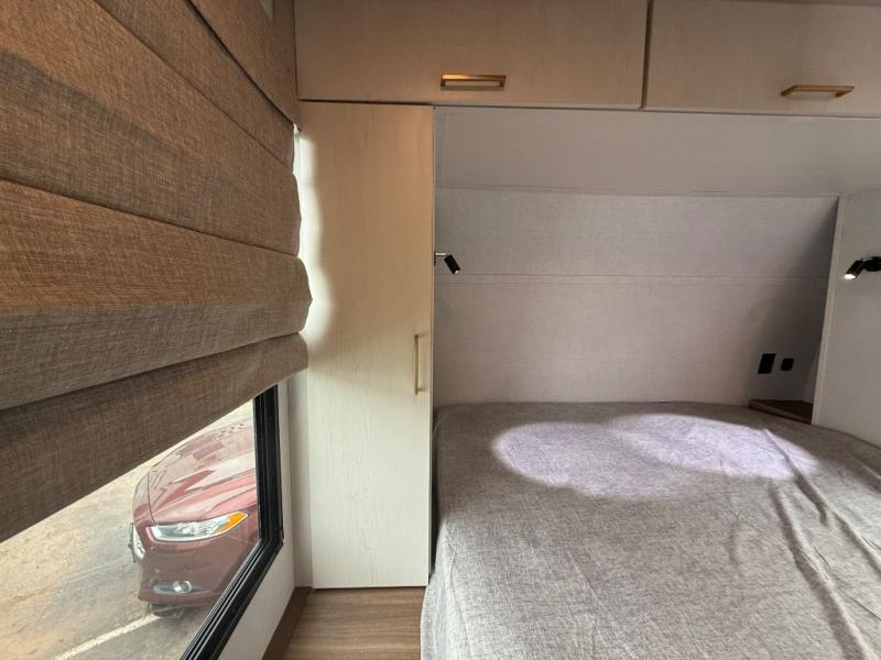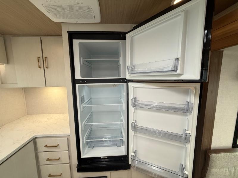 Escape to the great outdoors in this Vibe travel trailer. Once you arrive at your campsite, set up the 20' electric awning with LED lights, then grab the fishing poles from the large pass-through storage. You can make lunch on the electric oven/air fryer, and your food can be stored in the 12V refrigerator. The spacious full bath includes a 36" x 30" walk-in shower to clean up every day, and there is a linen closet to store clean towels and necessities.