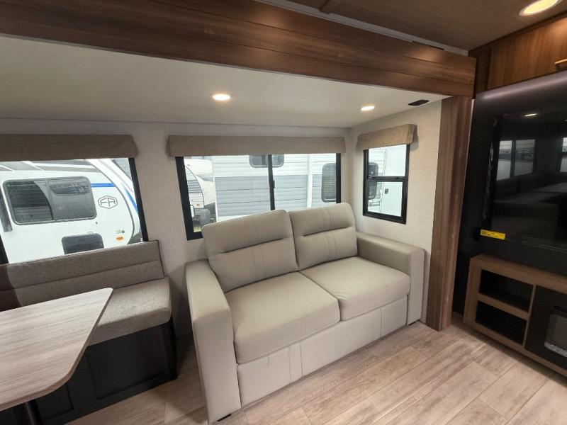 With any Vibe travel trailer by Forest River, you will enjoy comfort at every turn! There is a Norco huck-bolted steel frame, an enclosed underbelly with 12V heating pads, and a PVC roof membrane for added durability. You will also find a universal docking station outside, along with slam latch doors, European style square windows, and an automotive painted front cap. Head inside to enjoy the premium residential-style furniture, decorative window treatments, privacy shades in the living room and bedroom, and many more comforts!