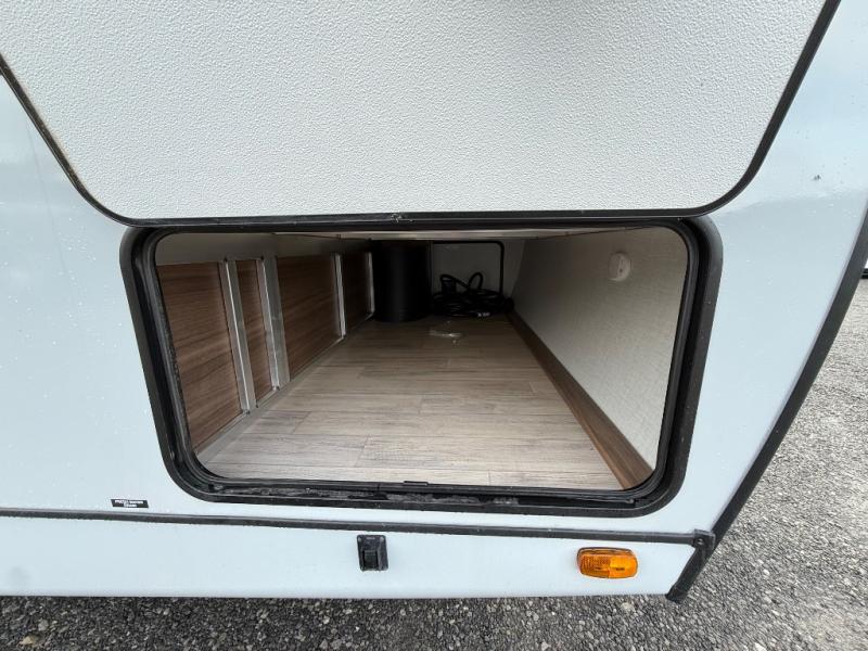 Escape to the great outdoors in this Vibe travel trailer. Once you arrive at your campsite, set up the 20' patio awning, then grab the fishing poles from the large pass-through storage. You can make lunch on the 3-in-1 convection oven, and your food can be stored in the 10.7 cu. ft. 12V refrigerator. The spacious full bath includes walk-in shower with a seat to clean up every day, and there is a linen closet to store clean towels and necessities. The front private bedroom includes a custom king bed with generous storage space, plus washer and dryer prep if you choose to add those appliances!