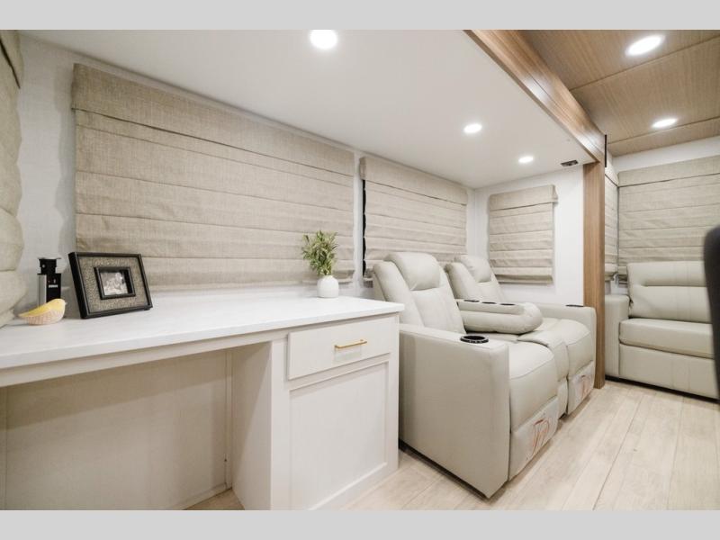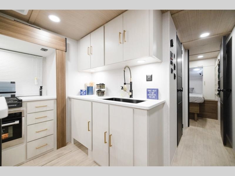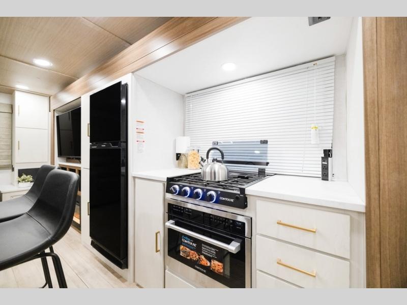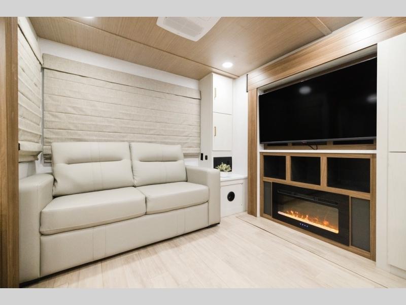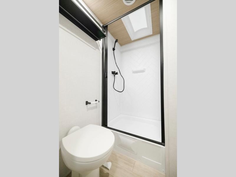 This travel trailer allows you to enjoy the great outdoors without having to give up your creature comforts. The dual opposing slides provide the chef space to work around the kitchen island, and there is plenty of seating space for your guests on the theater seating or the sleeper sofa, plus there's a desk area with chair so you can work on the go. The fireplace with a TV above will be perfect for those rainy days, and there is even a large skylight to let natural light into the living room. This model also includes Sure-Step entry steps, pass-through storage, plus two power awnings with LED lights so you can spend more time outdoors with friends and family!