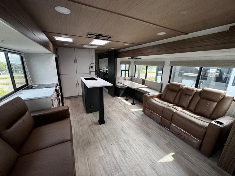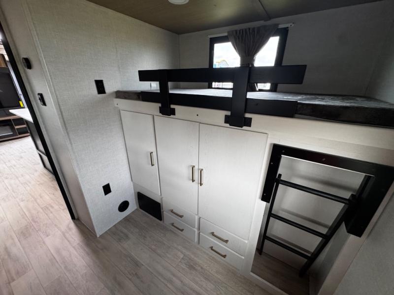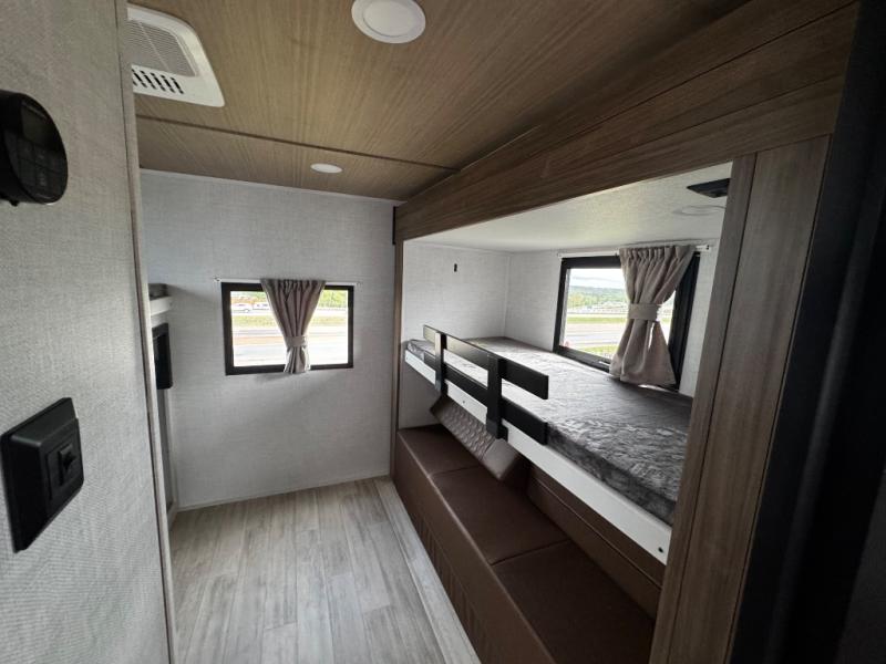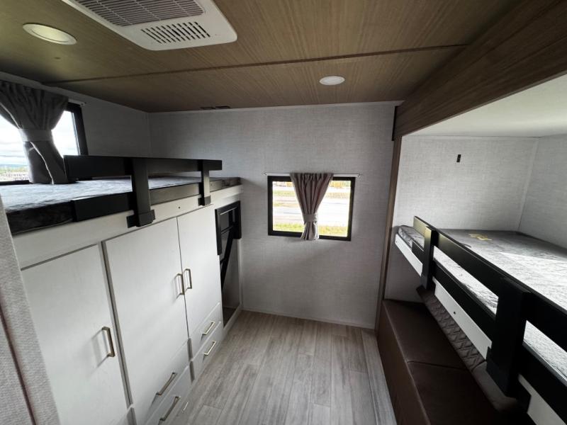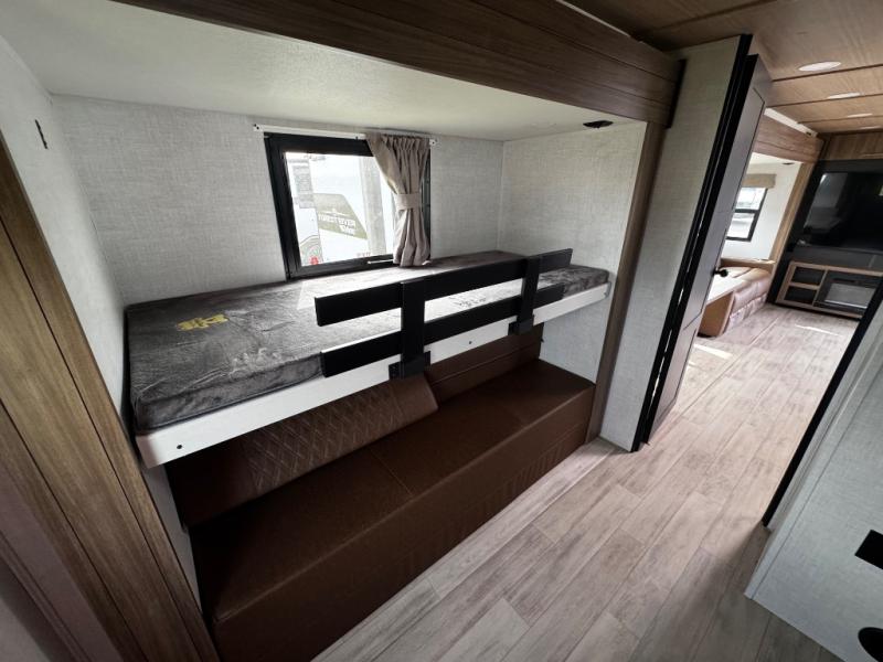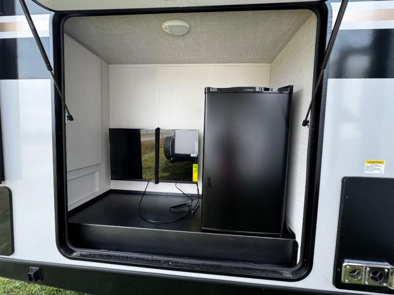 Whether you enjoy spending time outdoors or indoors, there is something for everyone in this travel trailer. The large pass-through storage can store your fishing poles, and the 20' electric awning with LED lights will create an outdoor living space. There is even an outdoor refrigerator with an outside storage cabinet and 32" TV! You will love all the interior space thanks to the dual opposing slides in the main living area, which will give the chef space to work around the kitchen island. Your crew can visit on the tri-fold sofa, theater seating and 5-person dinette while the fireplace is going, but you'll probably find the kids spending most of their time in the private bunkhouse! What more could you want in a travel trailer?!