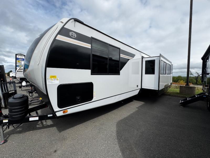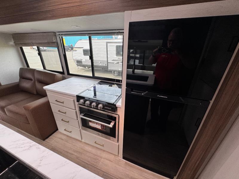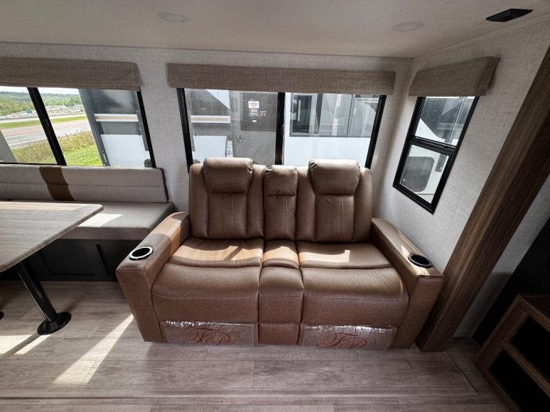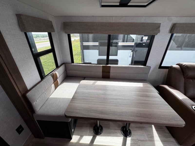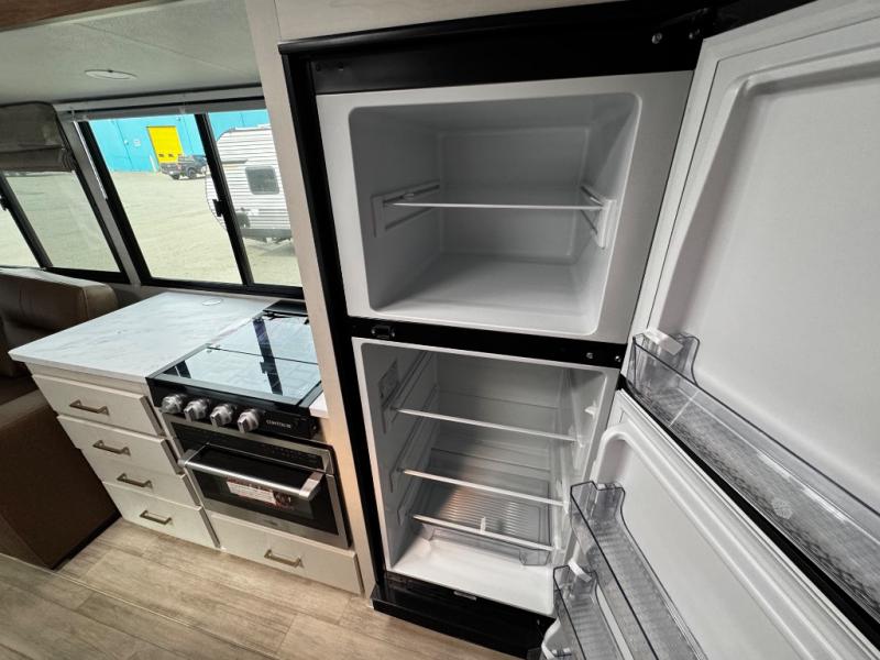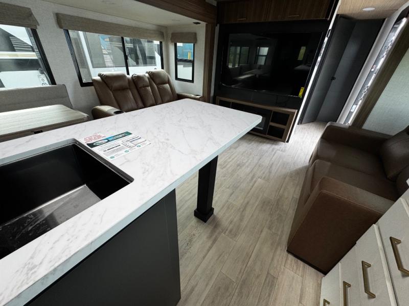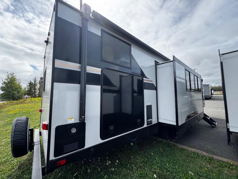 Whether you enjoy spending time outdoors or indoors, there is something for everyone in this travel trailer. The large pass-through storage can store your fishing poles, and the 20' electric awning with LED lights will create an outdoor living space. There is even an outdoor refrigerator with an outside storage cabinet and 32" TV! You will love all the interior space thanks to the dual opposing slides in the main living area, which will give the chef space to work around the kitchen island. Your crew can visit on the tri-fold sofa, theater seating and 5-person dinette while the fireplace is going, but you'll probably find the kids spending most of their time in the private bunkhouse! What more could you want in a travel trailer?!