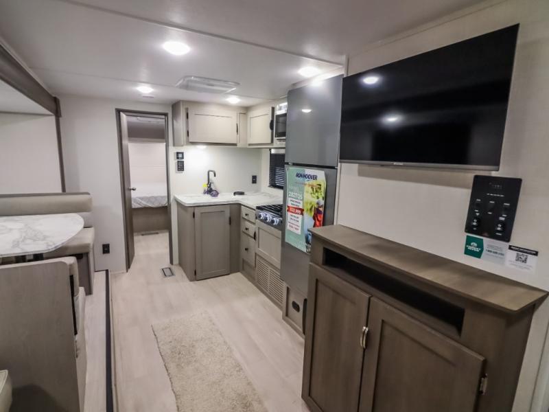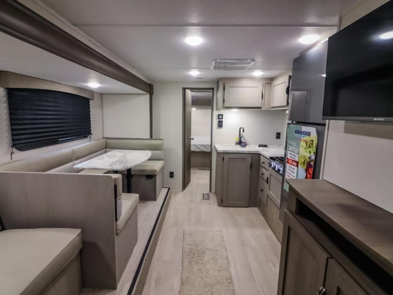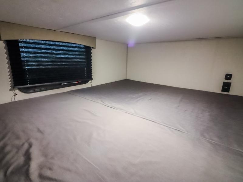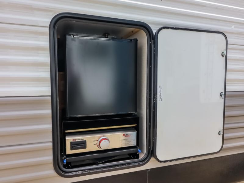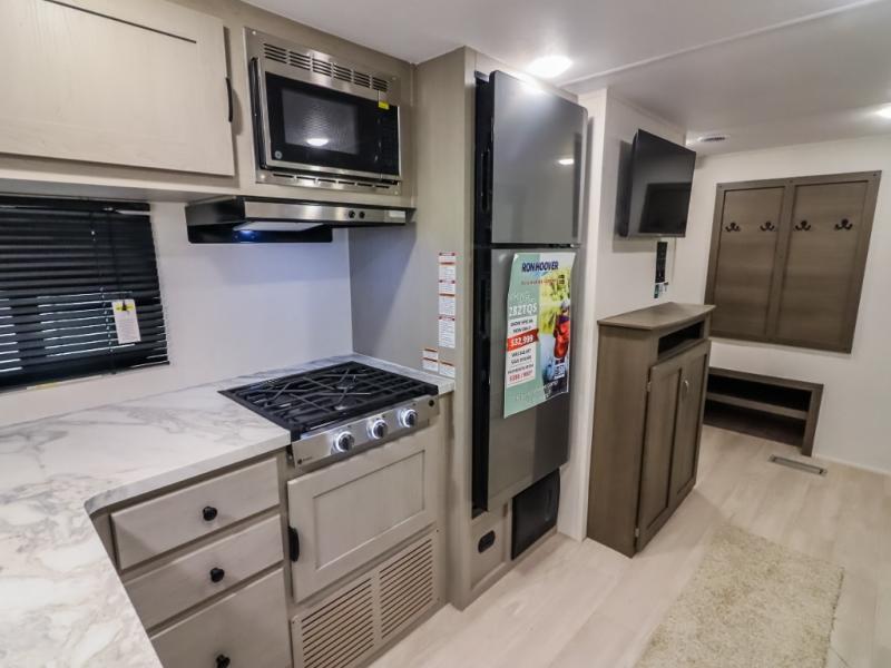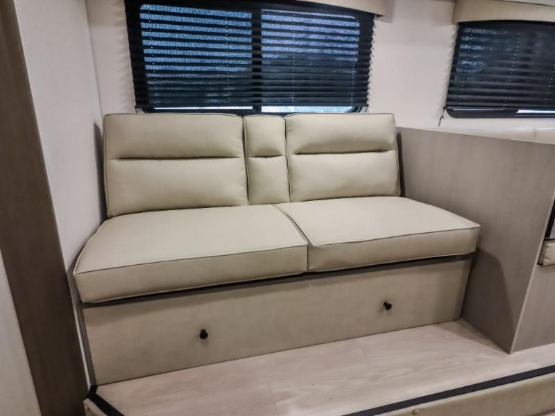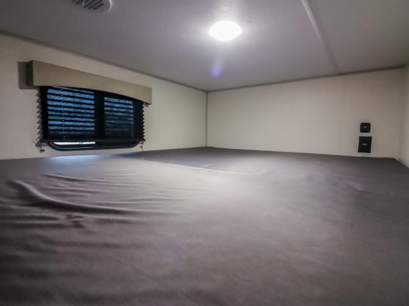 At the front of the trailer, the private bedroom offers a comfortable 60" x 74" queen bed for a restful night’s sleep, complemented by wardrobes on each side and an overhead shelf for storing clothing and essentials. Just steps away, the walk-through bathroom provides convenience with a medicine cabinet and a linen cabinet to keep toiletries neatly organized. Moving into the center of the trailer, the living and kitchen area opens up with a spacious slide-out that houses both a sofa and a U-shaped dinette, creating plenty of room for relaxing, dining, and gathering. Across from the slide, the fully equipped kitchen includes a sink with a cup rinser, a three-burner cooktop with a range vent, a microwave, and a 10 cu. ft. refrigerator, everything you need to cook comfortably inside your trailer. At the rear, two 60" x 74" queen bed bunks provide generous sleeping space for the whole crew, complete with an additional wardrobe for even more storage.
