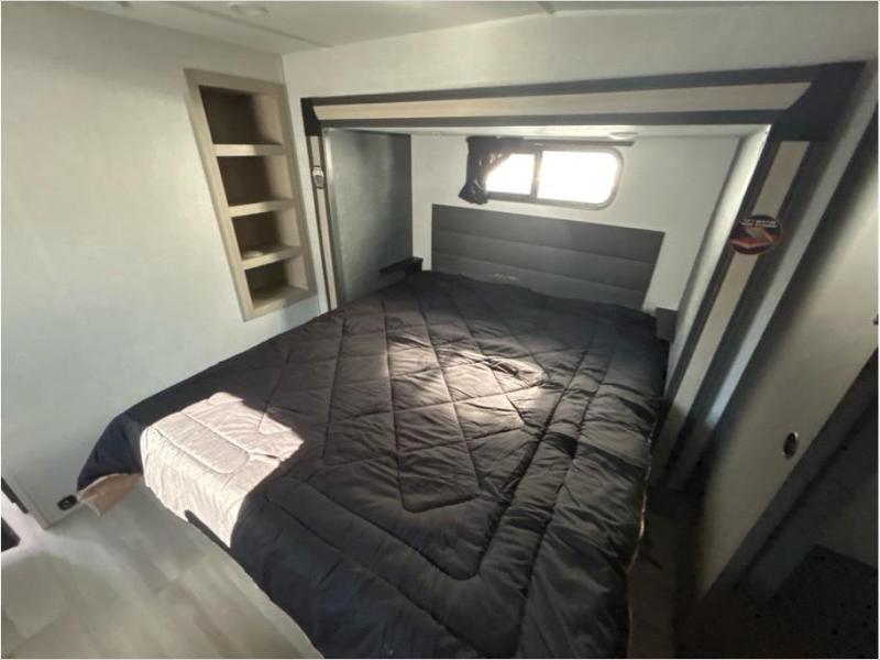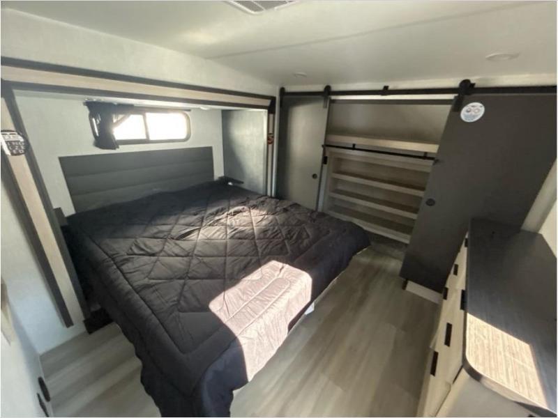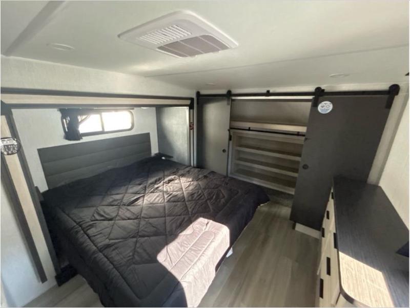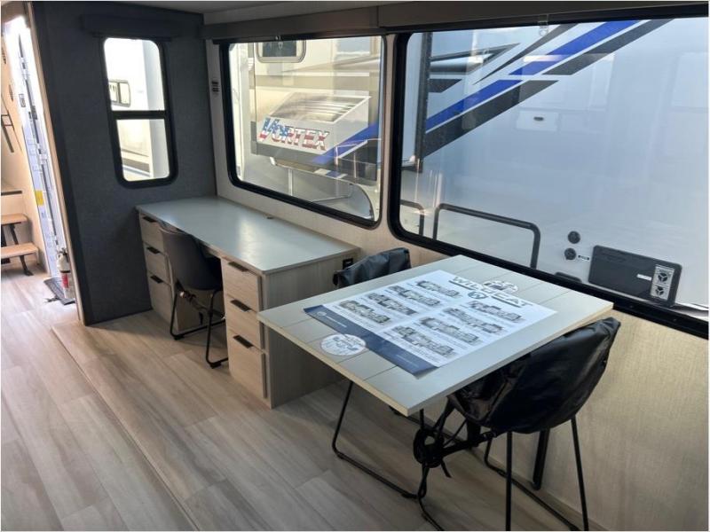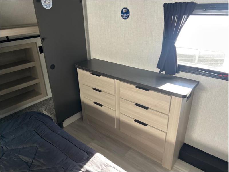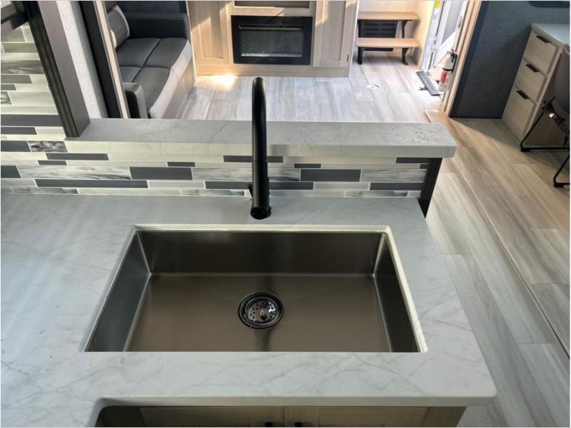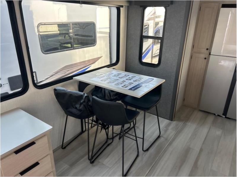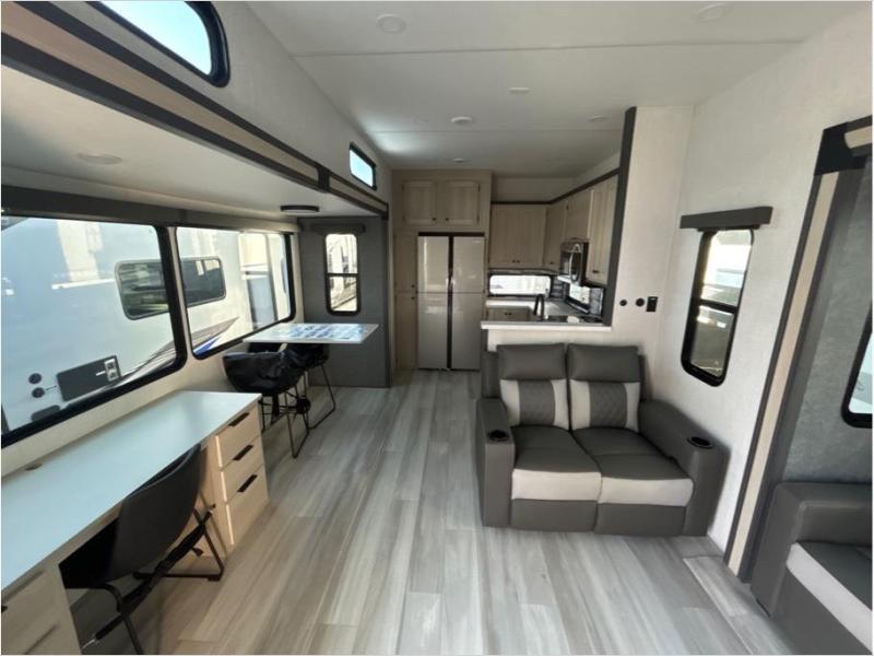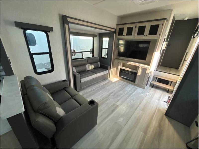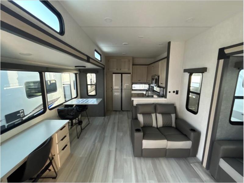 For the couple who love to cook, this fifth wheel is the perfect choice! There is generous counter space in the rear kitchen, along with overhead cabinetry, and a hi-top table and chairs for dining space. Beside the table is a desk with a chair and oversized opening windows so you can still enjoy nature views if you have to work. When it's time to relax, the tri-fold sofa and theater seating in the living room will do the trick, or you can head outdoors to enjoy the two power awnings. A full bath will let you freshen up before bed, and speaking of bedtime, the king bed slide out in the front bedroom is sure to bring comfort. There is also a walk-in wardrobe with washer and dryer prep and a dresser to keep your space tidy!