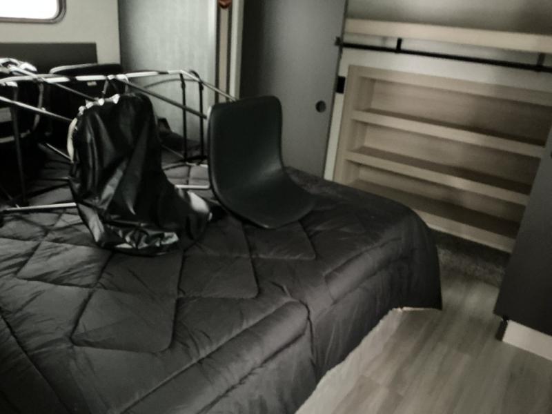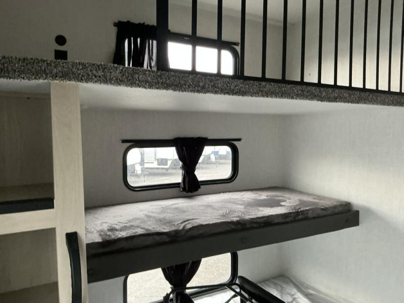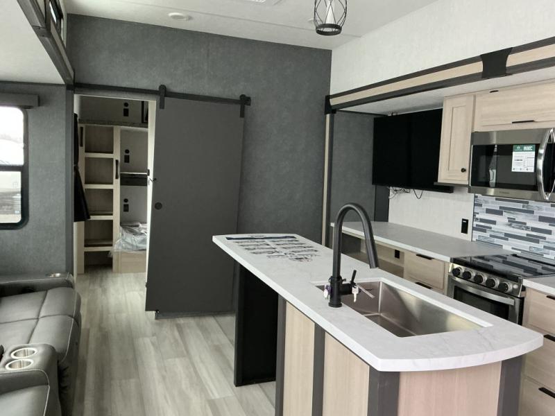This thoughtfully designed fifth wheel that effortlessly balances privacy, functionality, and social comfort. At the rear we have a bunk house featuring a spacious 54x74-inch bed, accompanied by an upper bunk and a loft, perfect for kids, guests, or a private reading nook. A desk offers a dedicated workspace, while the full bathroom ensures comfort without sacrificing convenience. Moving forward, you'll find dual opposing slides that open up to create a large living area, ideal for gathering, dining, or catching up on entertainment. Here, a kitchen island provides a chef-centric workspace, along with two pantries to keep everything in reach. Toward the front, a serene king-size bedroom awaits, offering a luxurious retreat with a large walk-in closet and dresser providing abundant storage for clothes and essentials.