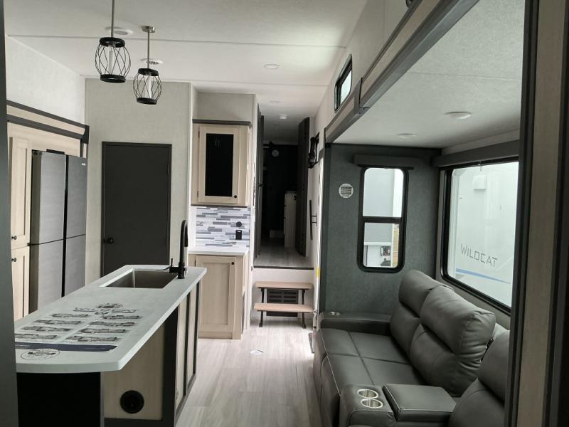 With any Wildcat fifth wheel by Forest River you will enjoy affordable luxury at every turn. These models are constructed with residential fiberglass insulation in the roof and floor, a 4'x6' sectioned underbelly armor, and a vacuum bonded, welded aluminum structure for added strength and durability. You will also find seamless roto-cast holding tanks, an outdoor shower, and 4-point auto leveling for quick and easy setup. Each model includes a best-in-class, high-efficiency 35,000 BTU furnace, along with an electric fireplace with thermostat control and remote, plus a 60,000 BTU tankless water heater for added convenience. There are carpet-free living spaces, residential backsplash, motion lighting throughout, and many more comforts!