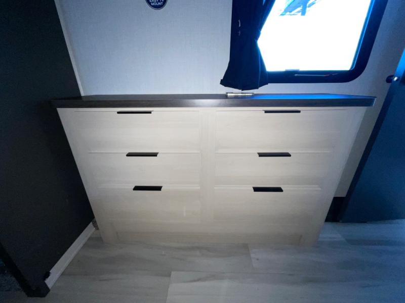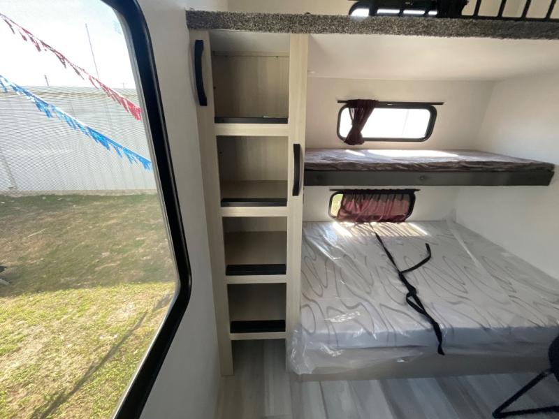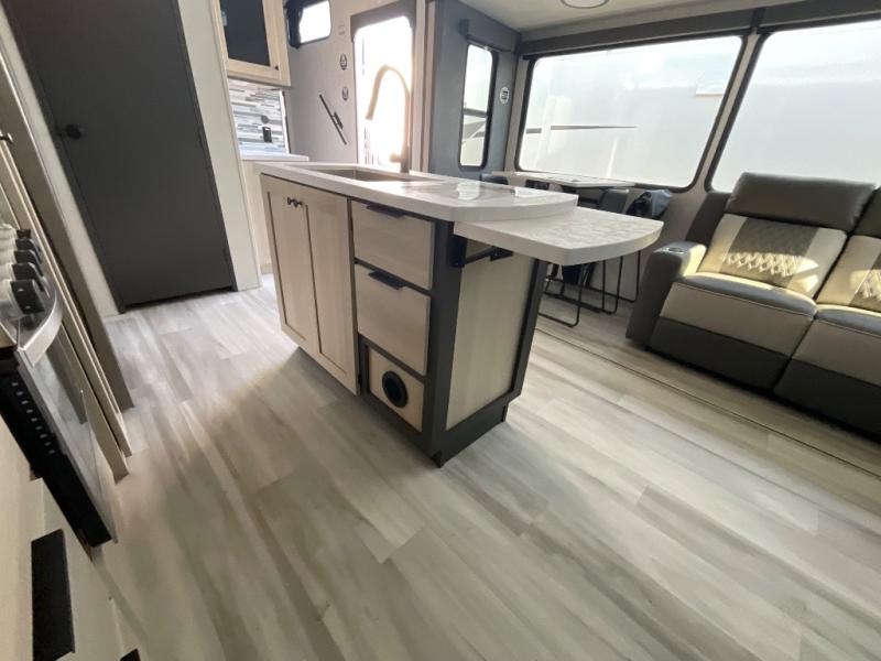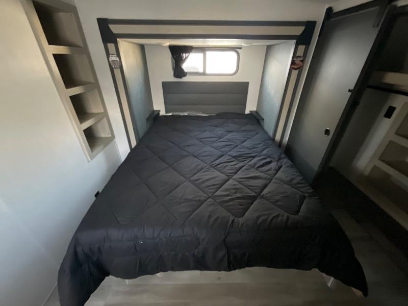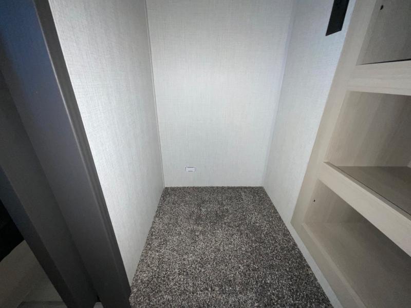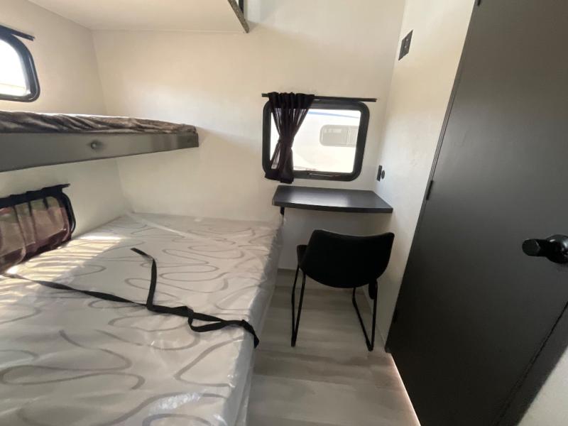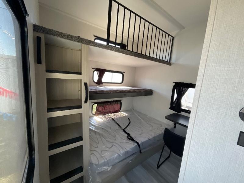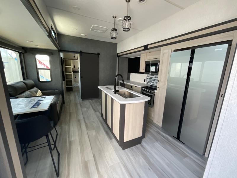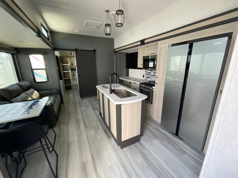 This thoughtfully designed fifth wheel that effortlessly balances privacy, functionality, and social comfort. At the rear we have a bunk house featuring a spacious 54x74-inch bed, accompanied by an upper bunk and a loft, perfect for kids, guests, or a private reading nook. A desk offers a dedicated workspace, while the full bathroom ensures comfort without sacrificing convenience. Moving forward, you'll find dual opposing slides that open up to create a large living area, ideal for gathering, dining, or catching up on entertainment. Here, a kitchen island provides a chef-centric workspace, along with two pantries to keep everything in reach. Toward the front, a serene king-size bedroom awaits, offering a luxurious retreat with a large walk-in closet and dresser providing abundant storage for clothes and essentials.