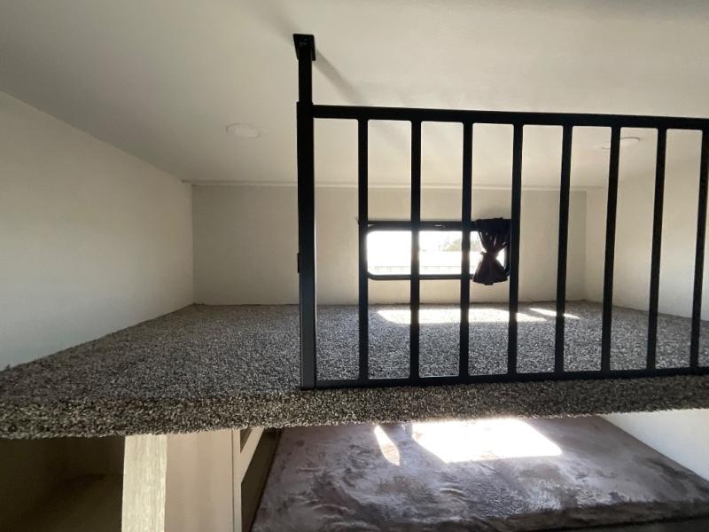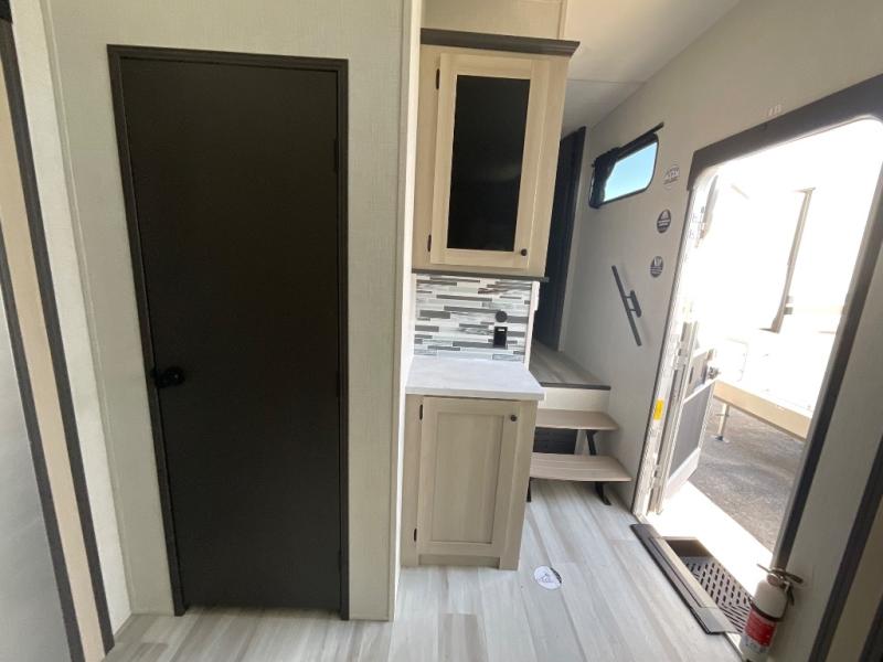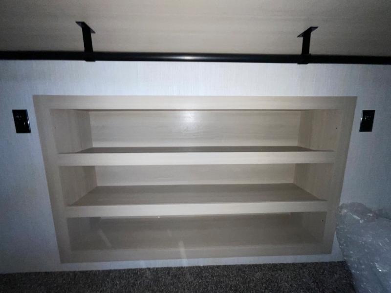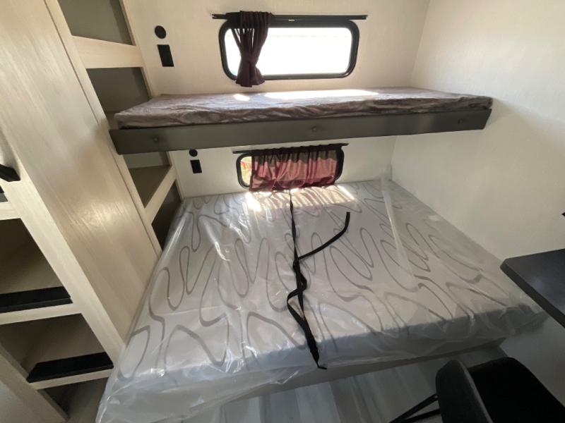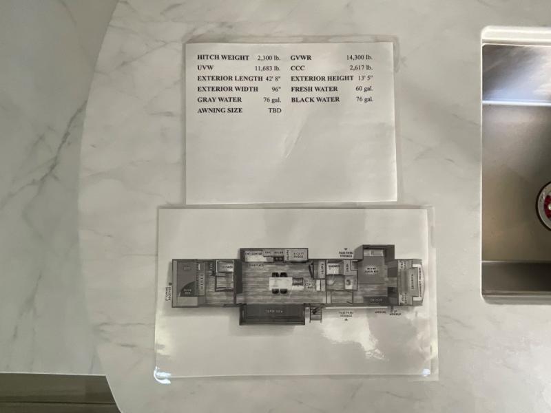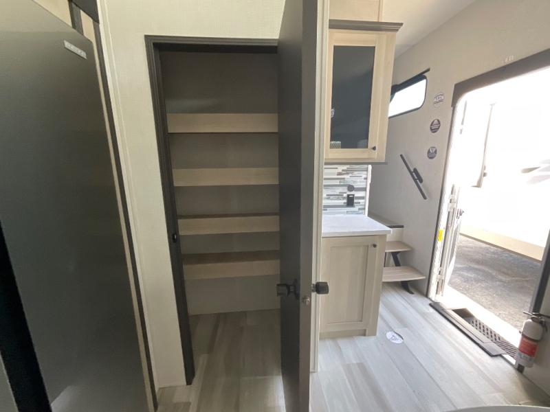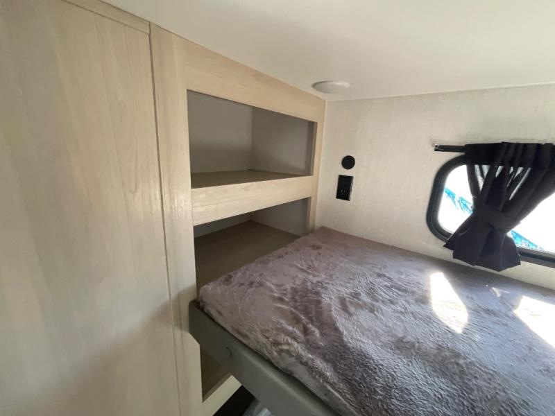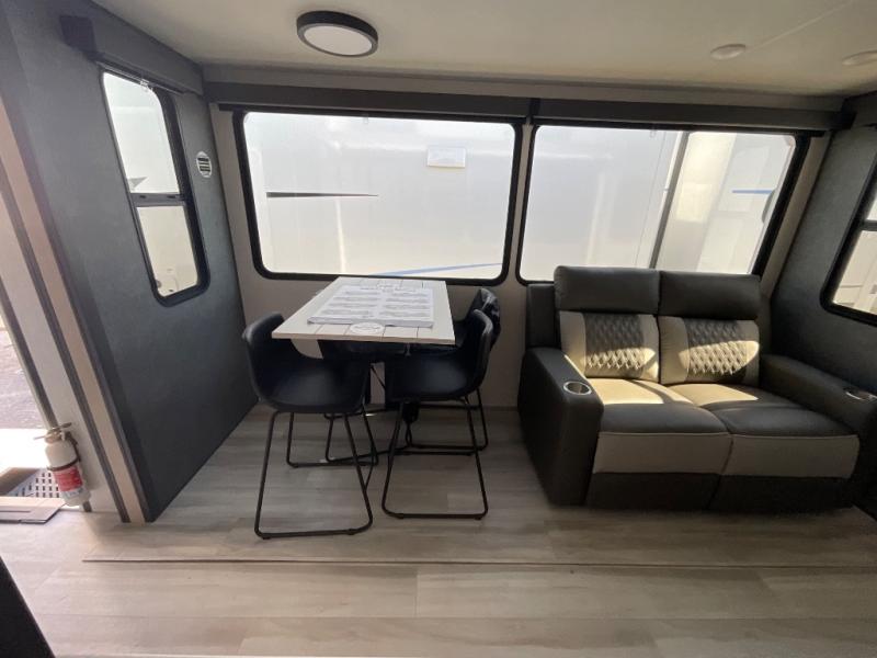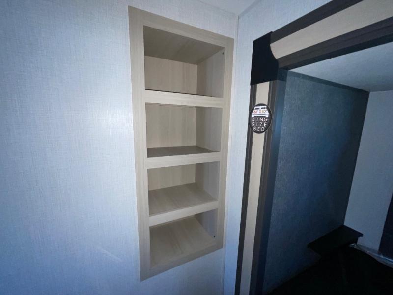 This thoughtfully designed fifth wheel that effortlessly balances privacy, functionality, and social comfort. At the rear we have a bunk house featuring a spacious 54x74-inch bed, accompanied by an upper bunk and a loft, perfect for kids, guests, or a private reading nook. A desk offers a dedicated workspace, while the full bathroom ensures comfort without sacrificing convenience. Moving forward, you'll find dual opposing slides that open up to create a large living area, ideal for gathering, dining, or catching up on entertainment. Here, a kitchen island provides a chef-centric workspace, along with two pantries to keep everything in reach. Toward the front, a serene king-size bedroom awaits, offering a luxurious retreat with a large walk-in closet and dresser providing abundant storage for clothes and essentials.