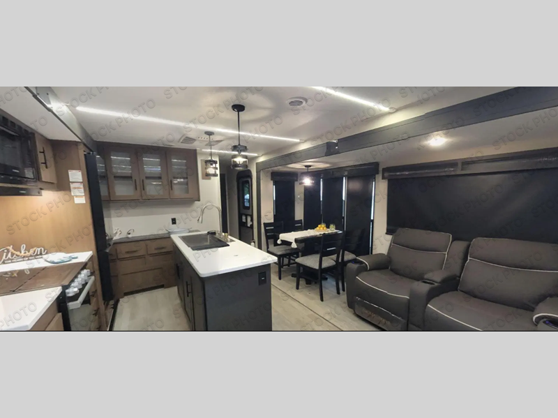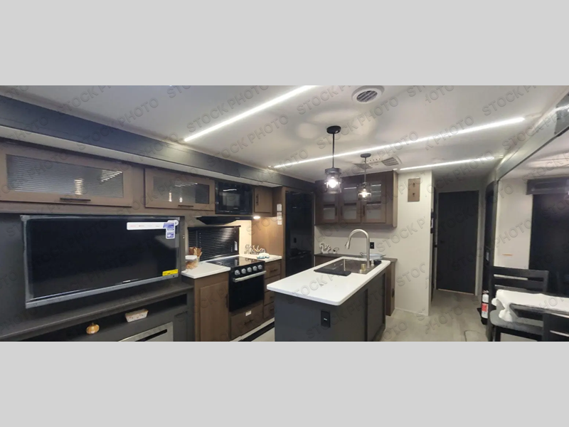 You will love camping in this travel trailer that includes dual opposing slides for maximum space and comfort. The kitchen island in the combined kitchen and living room will bring your whole space together, and the chef is sure to appreciate the hutch/coffee bar, 12V refrigerator, and three burner cooktop to make meals each day. Your guests can sleep on the rear king-size tri-fold hide-a-bed sleeper or the second tri-fold hide-a-bed sofa sleeper. This model also includes a full bath to get cleaned up in each day and a front private bedroom, complete with a Maxx king bed with underbed storage, plus a wardrobe with two drawers below for ample storage space!