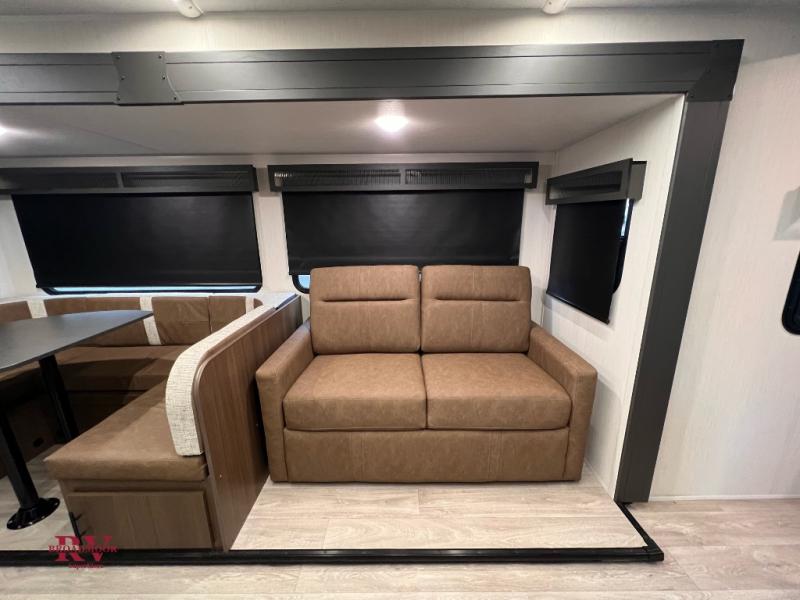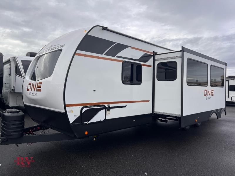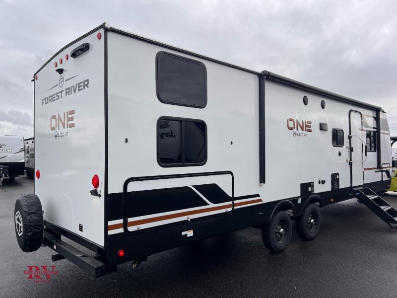 With any Wildcat ONE travel trailer by Forest River in tow, you will find fun and adventure wherever you go! Each model is constructed 2" thick Vacuum-Bonded sidewalls, a Maxx-strength aluminum-framed laminated floor, and double R-7 fiberglass insulation for added protection. These features are included with the Maxx Insulation Package, which also includes slam-latch baggage doors, a fully enclosed underbelly, and more. The Dynamic Technology Package features a 200W expandable roof mounted solar panel with a 30 amp charge controller for off-grid capabilities, backup camera prep, an exterior TV connection, and a frame-mounted receiver hitch to name a few conveniences. A front windshield is found within the Peak Package, along with a power tongue jack, solid surface kitchen countertops, friction hinge entry doors, and an exterior ladder prep.