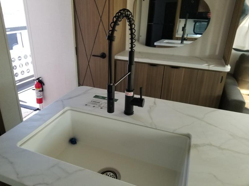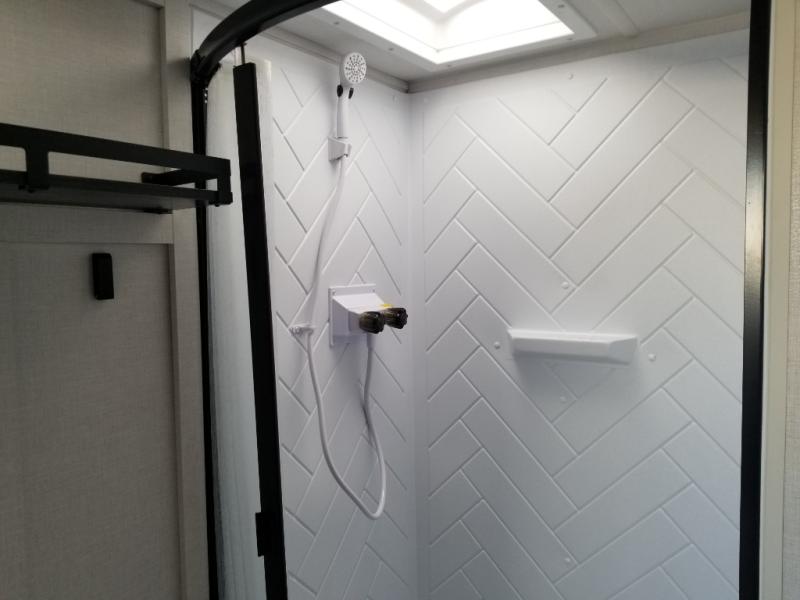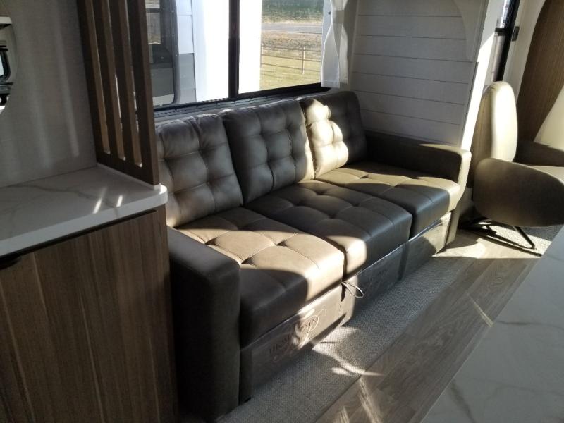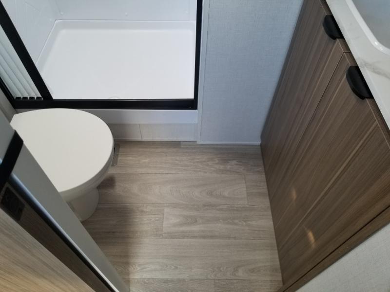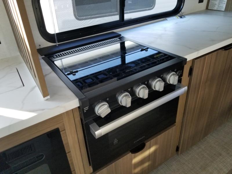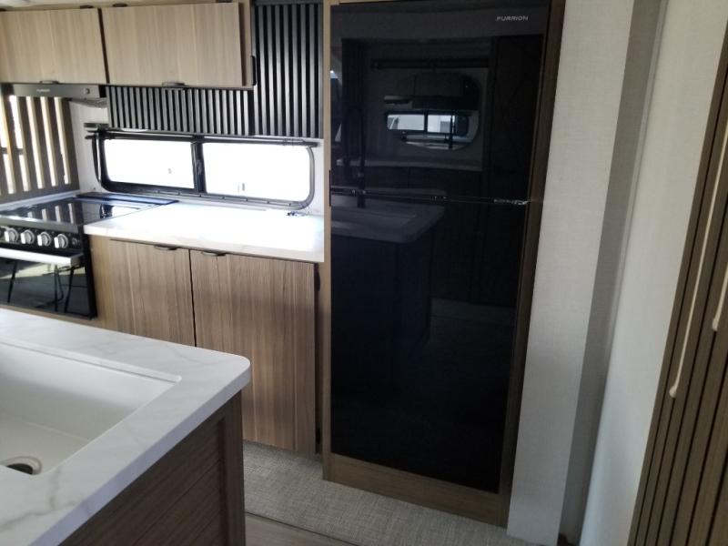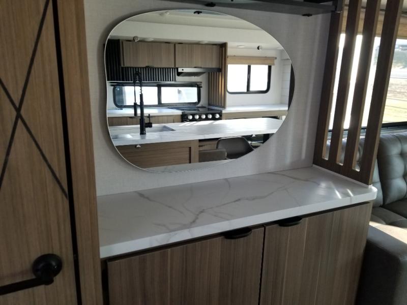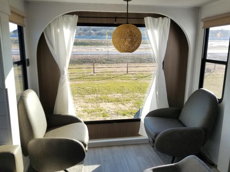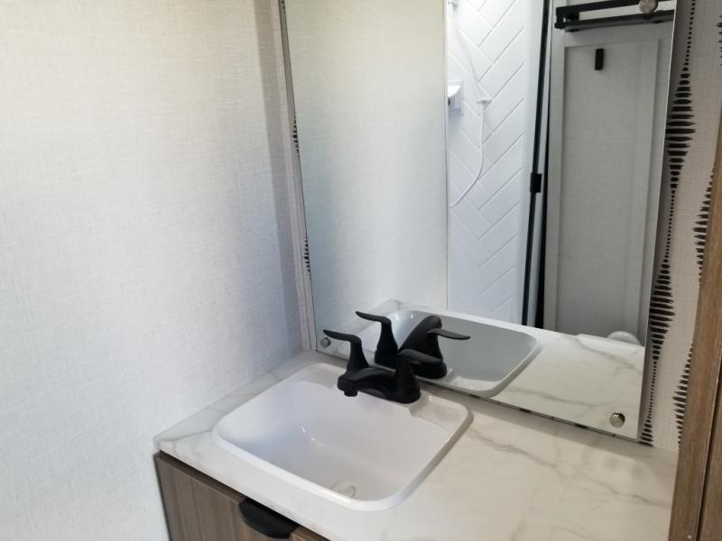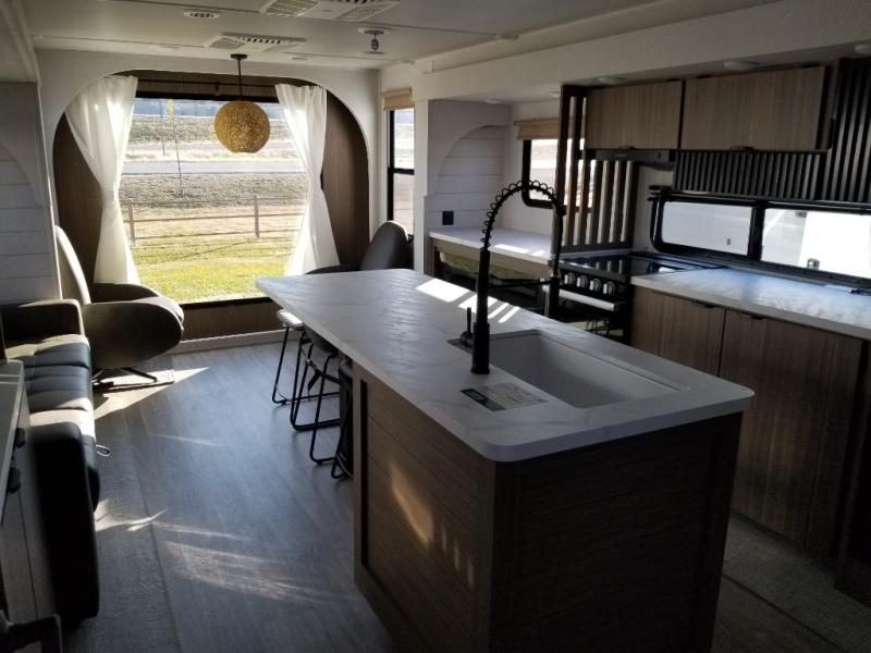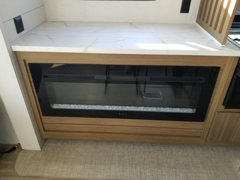 Find your zen int this spacious travel trailer for four! Once you've unloaded your gear, you can head inside to make lunch at the kitchen island with four chairs. An 80" trundle sofa provides additional seating space plus sleeping space for guests. You will love the rear custom recliners that are conveniently located next to the fireplace. The full bath is located towards the front next to the private bedroom so you can easily use the restroom at night, and you're sure to get a great night's rest on the custom king bed with Versa Tilt. This unit also includes washer and dryer prep, giving you the option to add these appliances.