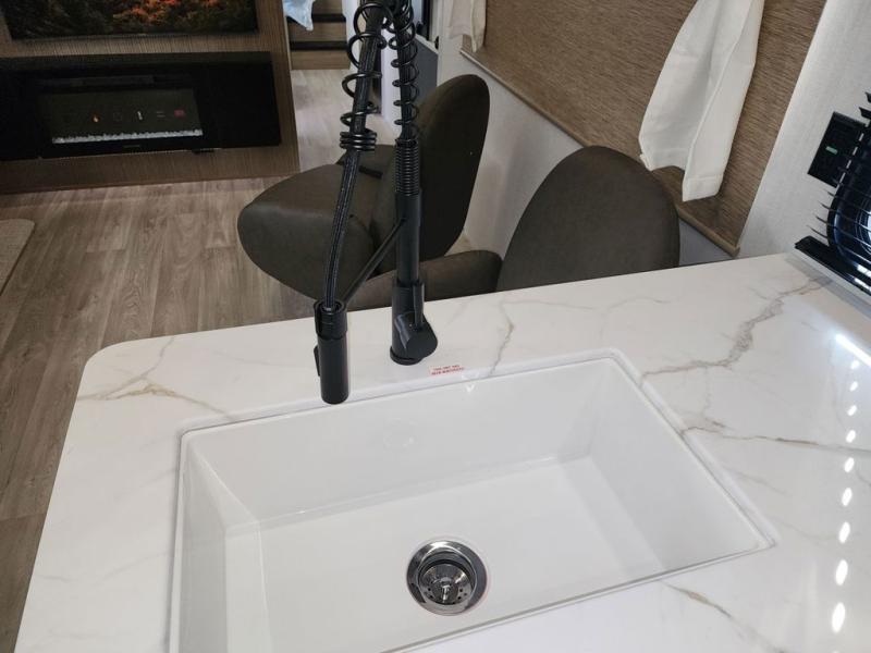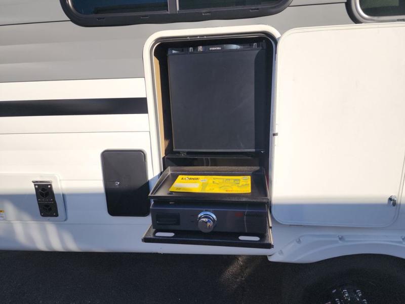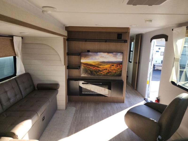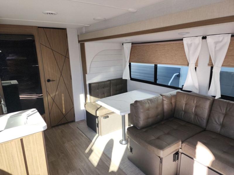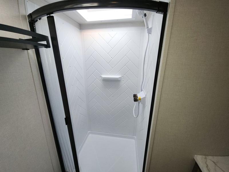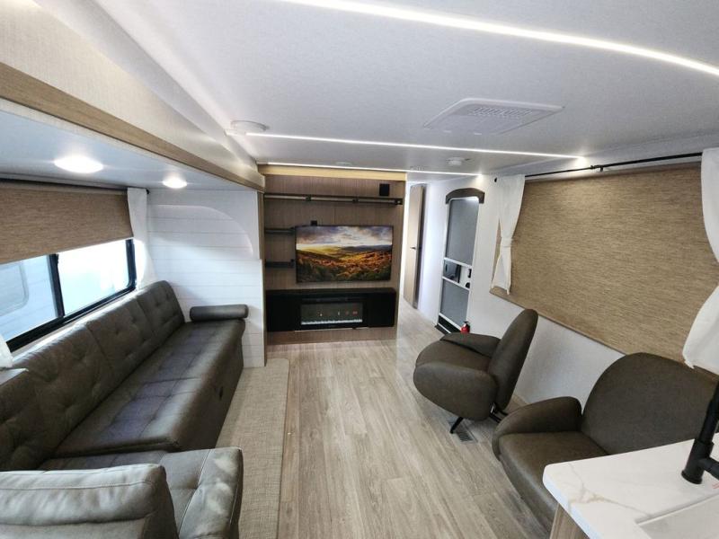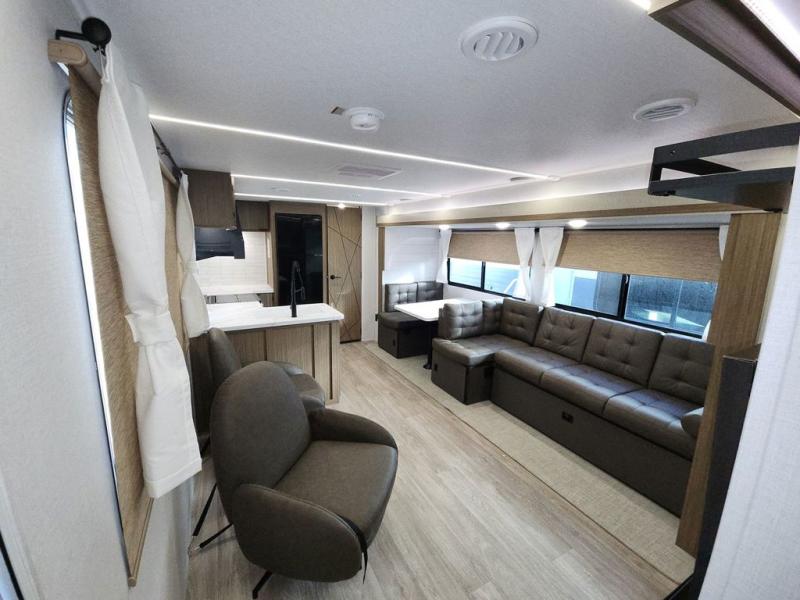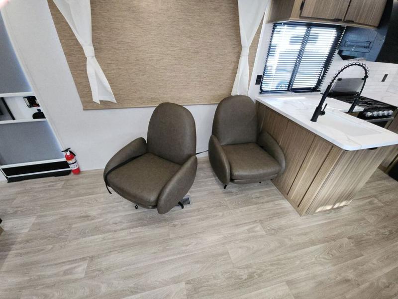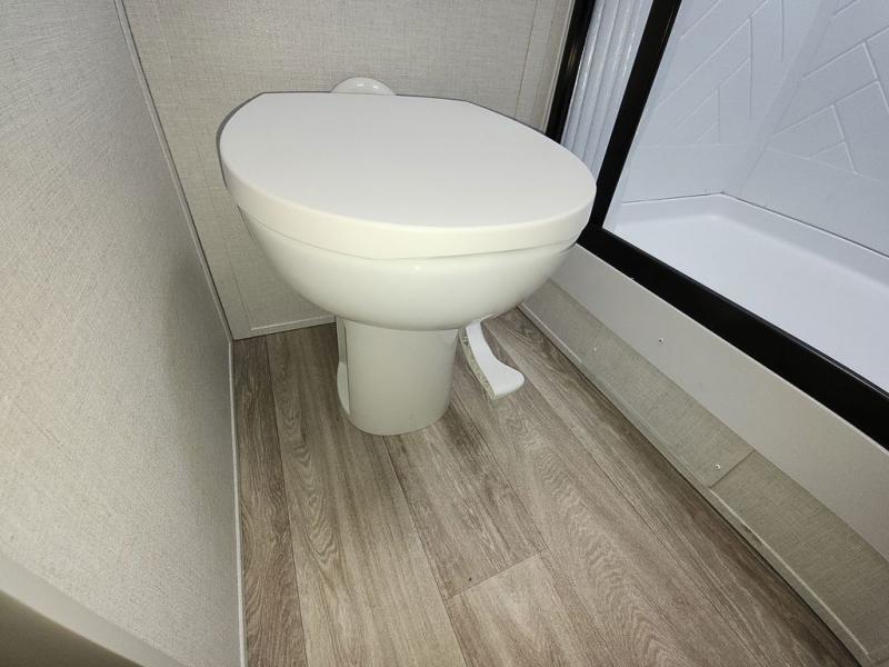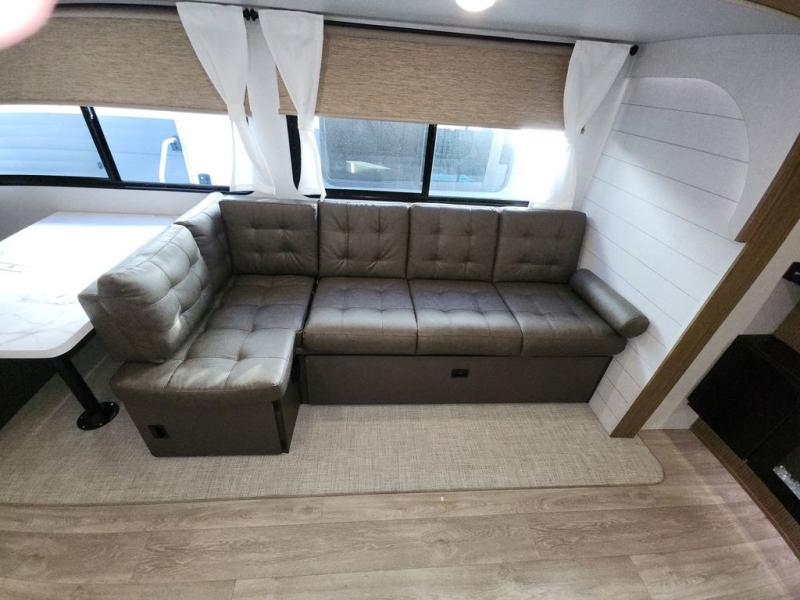 This Wildwood travel trailer is perfect for your family looking for a new adventure. You will enjoy the rear kitchen that includes a refrigerator and cooktop. The Versa-Lounge will provide comfortable seating and sleeping space, and the Versa Flex table gives you a space to dine and work if needed. This unit also includes two lounge chairs, so you'll feel right at home! You'll love the full bath in this unit, and the custom king bed with Versa-Tilt in the private bedroom is perfect for a good night's rest.