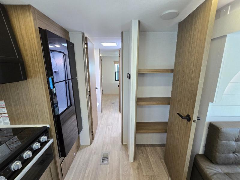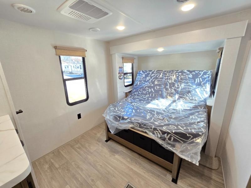 You're going to love this Wildwood travel trailer and its unique layout. The private bunkhouse is up front, and the private bedroom is at the rear of the unit. You will love the walk-through bath that leads into the bedroom, and the custom king bed with Versa Tilt slide out provides more interior space. The kids will love the front private bunkhouse with its Versa queen bed and Versa bunk beds. This model also includes an 18' awning that will shade you during the day and create an outdoor living space you are sure to love.
