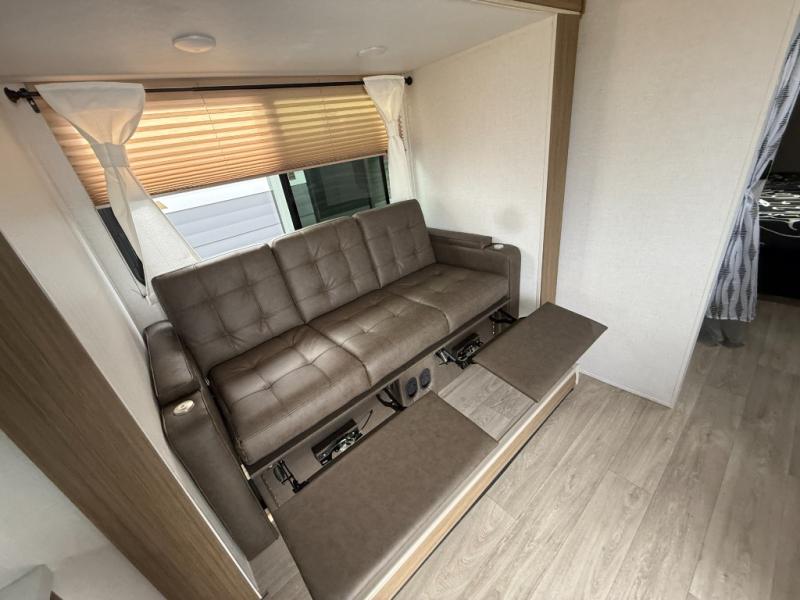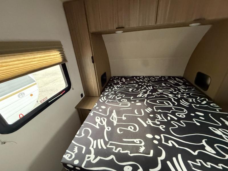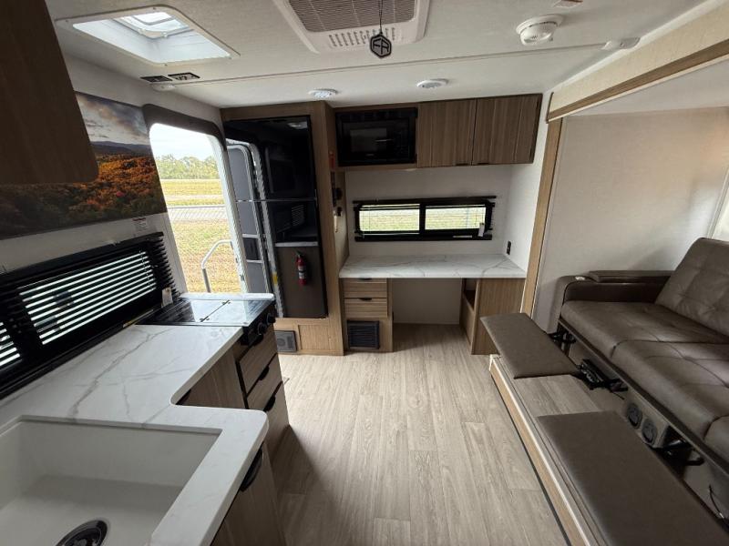 You're going to love every minute spent in this couple's trailer. The queen bed in the front private bedroom will provide a great night's rest, and there are dual wardrobes to easily get dressed in the morning. Head to the kitchen through the bath, then prepare eggs and bacon on the two-burner cooktop. There is a sofa here to enjoy your coffee at each morning, or you may want to get some work done at the mobile workstation!