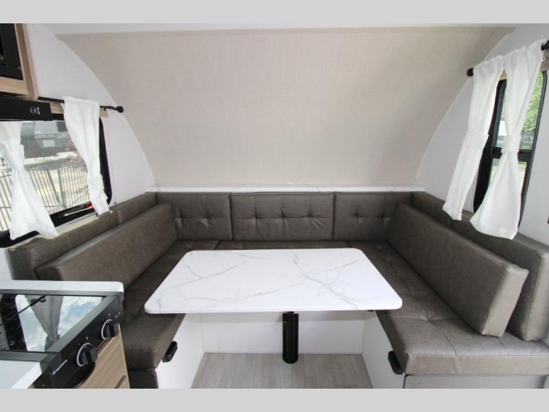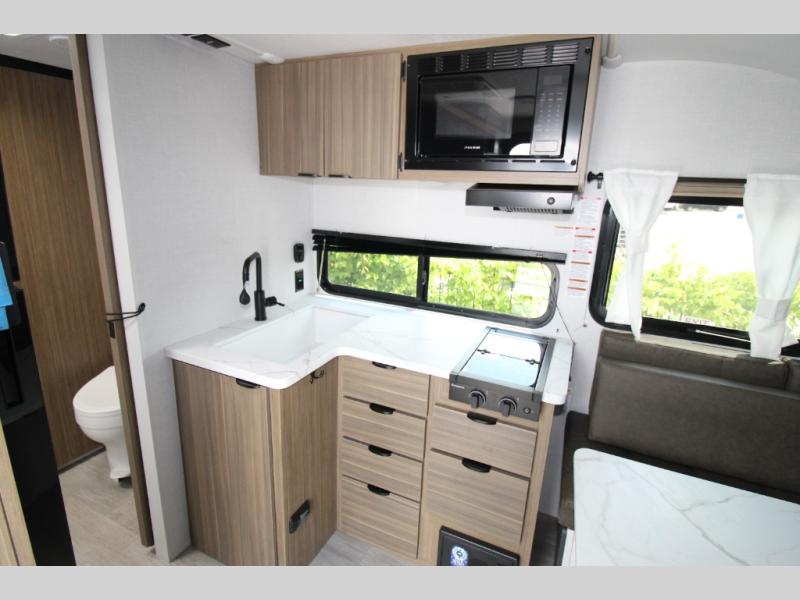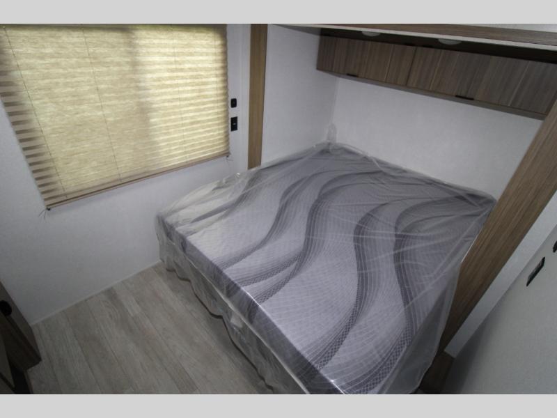 Adventure starts with this travel trailer in tow. Once you arrive at the campground, set up the 15' power awning with LED lights and fill the dog's water bowl using the hot/cold outside shower. Head inside to prepare lunch on the two burner cooktop, and you can dine together around the U-shaped dinette. This area can become your guests' sleeping space at night, while you enjoy the queen bed in the rear bedroom. There is a private toilet and sink, with the private shower right across the hall so two people can get ready for bed at the same time; how convenient!