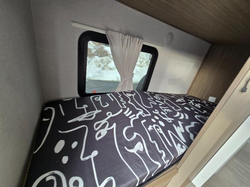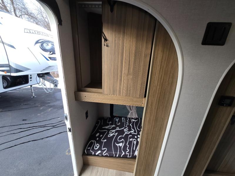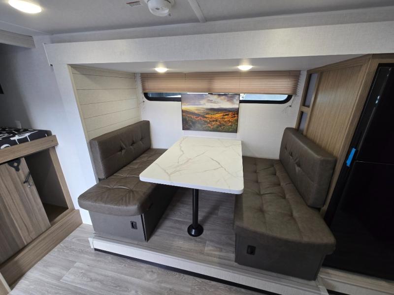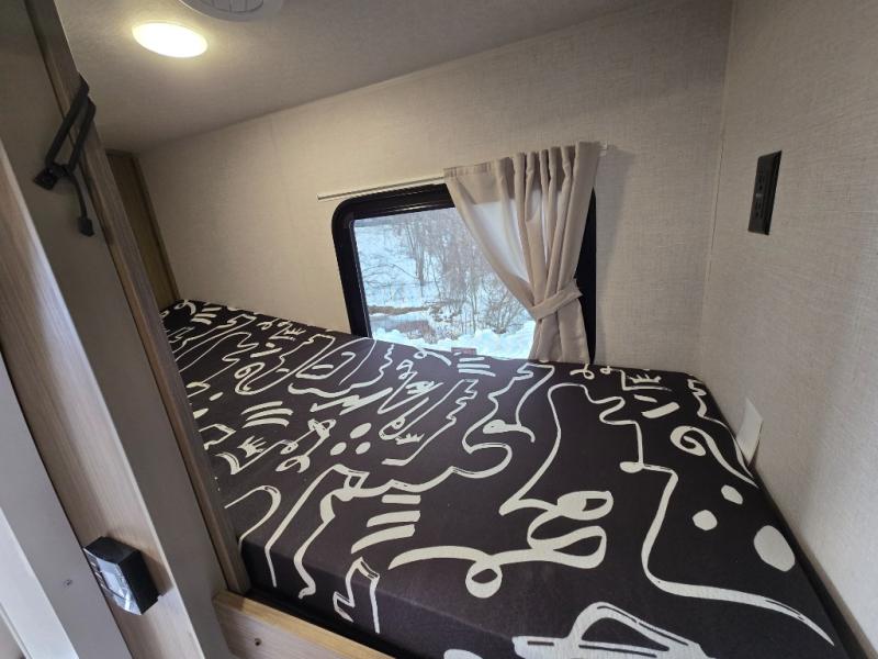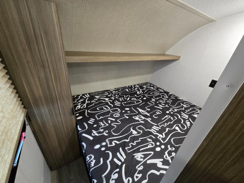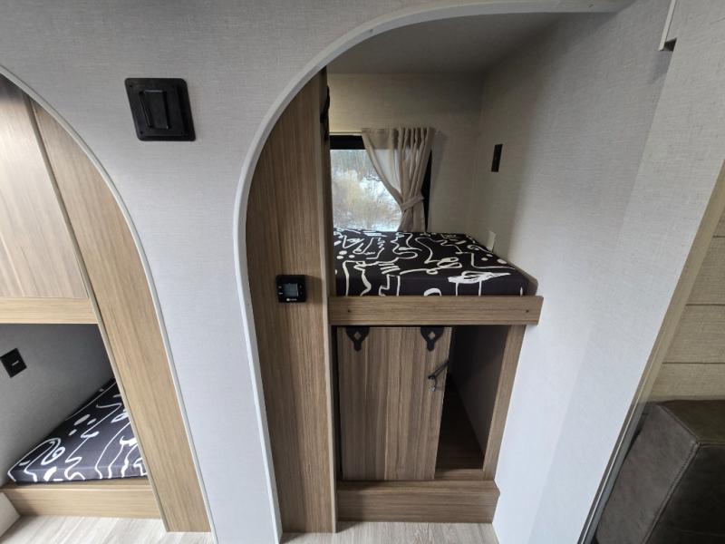 Your guest or little ones will love the bunk beds on this model since each bunk includes a private door which can be shut for privacy! You'll find the front 60" x 72" platform bed to be cozy and convenient since there are overhead cabinets and a closet for your things. Once you've made lunch on the two-burner cooktop, you can dine at the booth dinette slide out. There is also a 12V refrigerator here and shelves for more storage!
