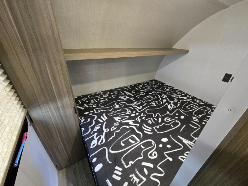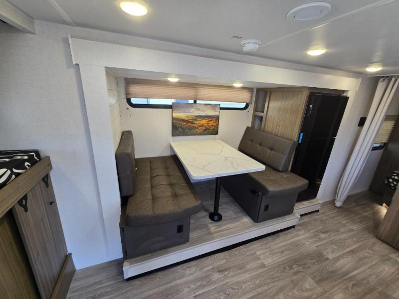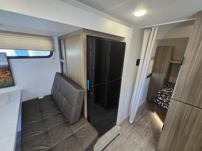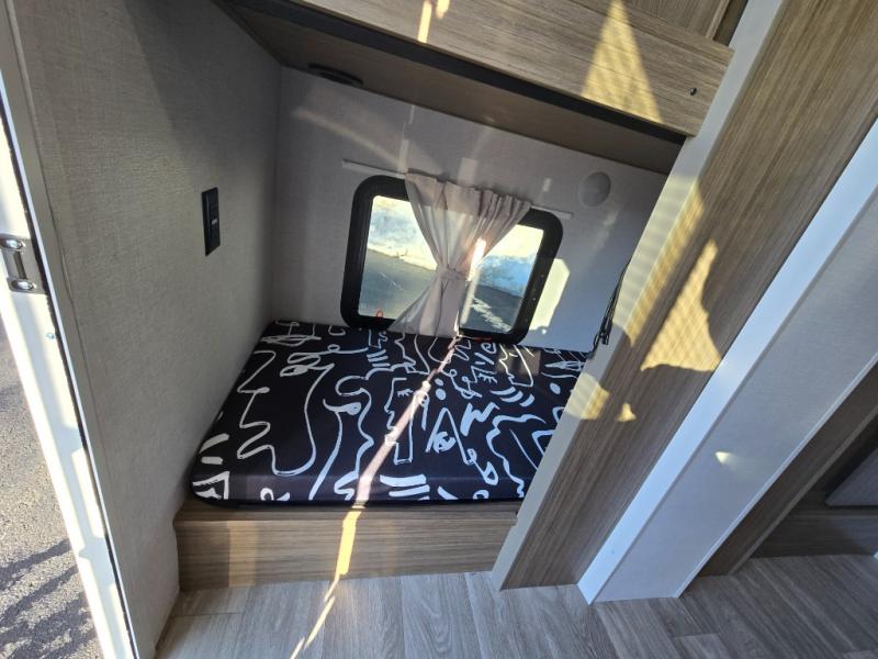 Your guest or little ones will love the bunk beds on this model since each bunk includes a private door which can be shut for privacy! You'll find the front 60" x 72" platform bed to be cozy and convenient since there are overhead cabinets and a closet for your things. Once you've made lunch on the two-burner cooktop, you can dine at the booth dinette slide out. There is also a 12V refrigerator here and shelves for more storage!