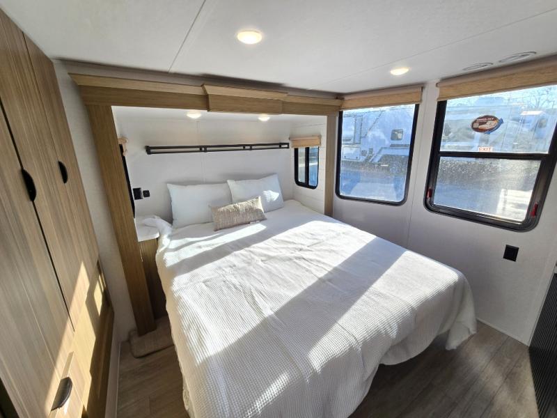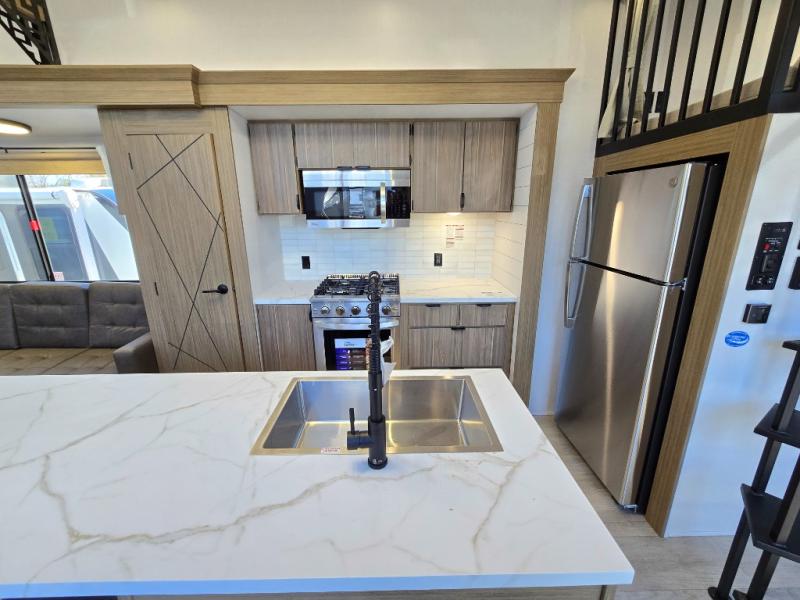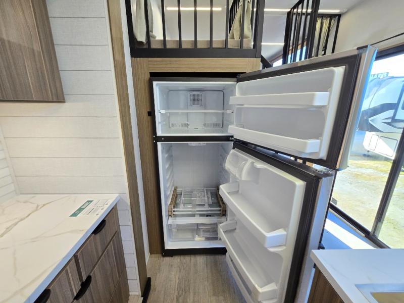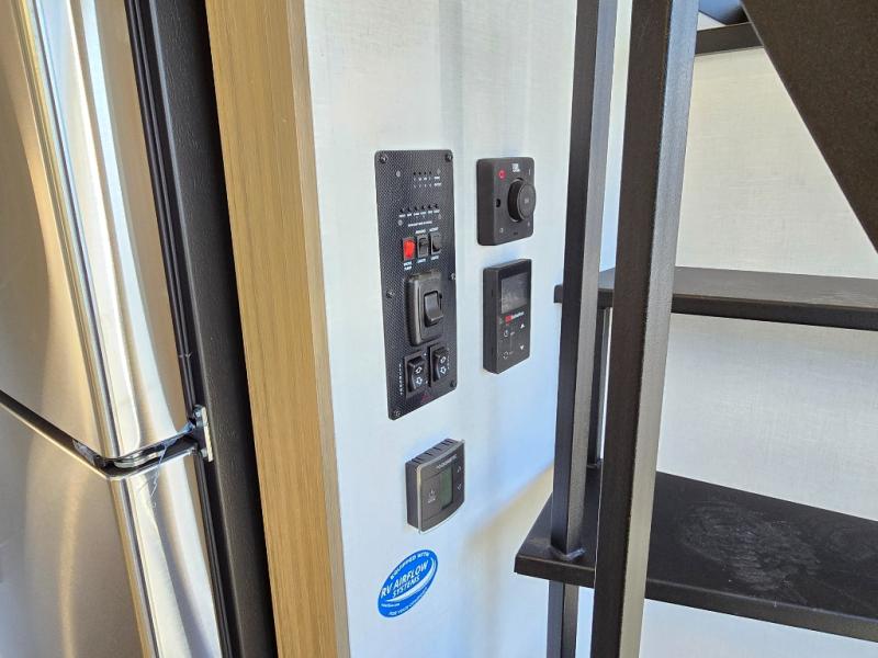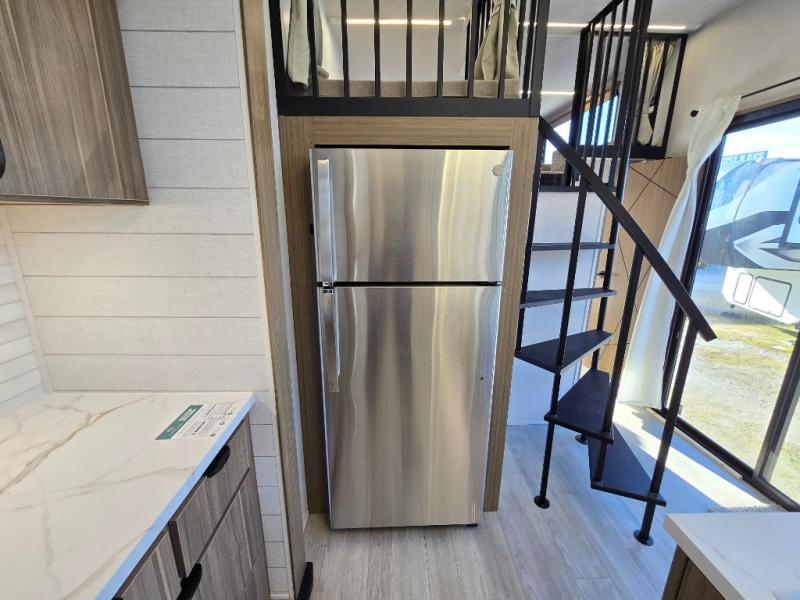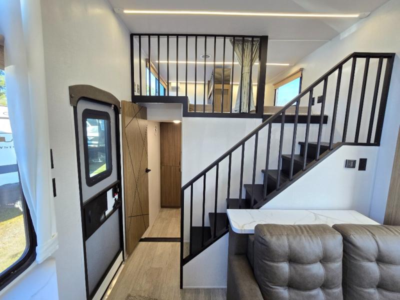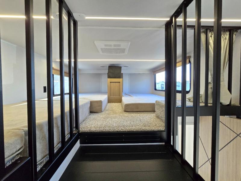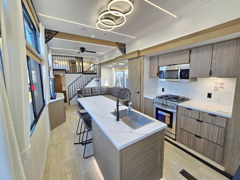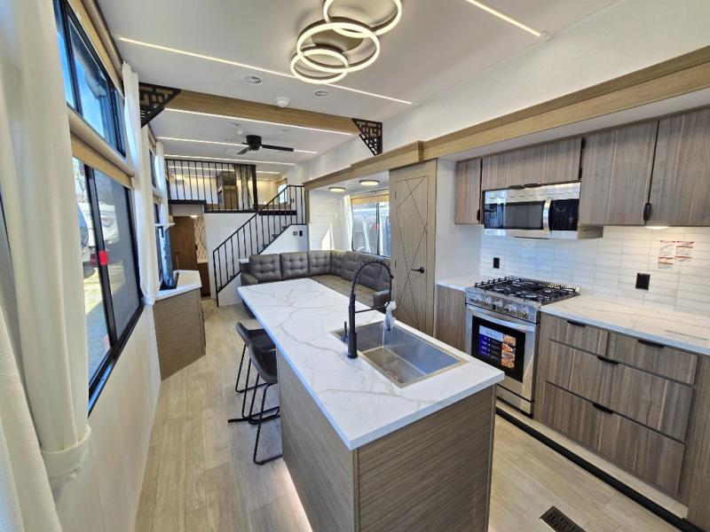 This trailer is built with comfort and convenience in mind, offering plenty of sleeping space for the whole gang. It has two spacious lofts, each equipped with two 42" x 72" bunk mats, plus an extra 36" x 38" bunk mat, providing cozy sleeping spots for everyone. Each loft also includes built-in storage for essentials, and instead of climbing a ladder, easy stair access makes getting in and out much safer. On the main floor, you’ll find a full rear bathroom with a walk-in shower and washer/dryer prep. The main living area has a large sectional sofa, perfect for gathering the group to watch the TV on the Televator or relaxing by the fireplace after a day outdoors. The kitchen is equipped with all the essentials, including a large pantry, overhead cabinets for snack storage, a fridge, and a kitchen island that adds prep space. Up front, the private bedroom has a king bed with Versa Tilt, a dresser, and shelves to keep your clothes and camp gear neatly organized. Regardless that you're adventuring about, this trailer is ready to make every trip feel like home.