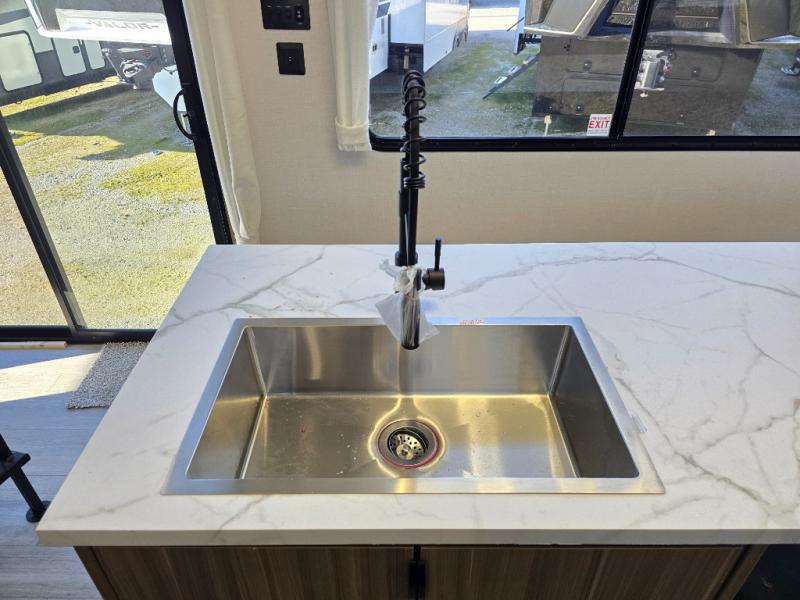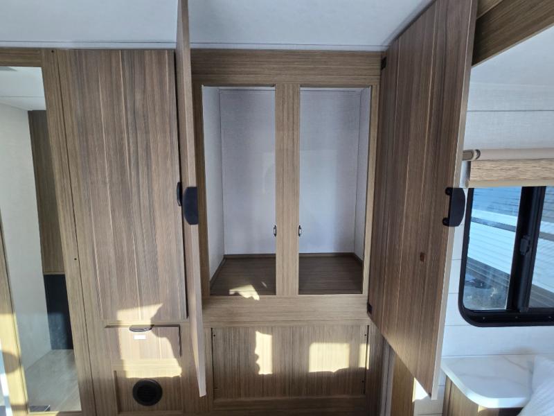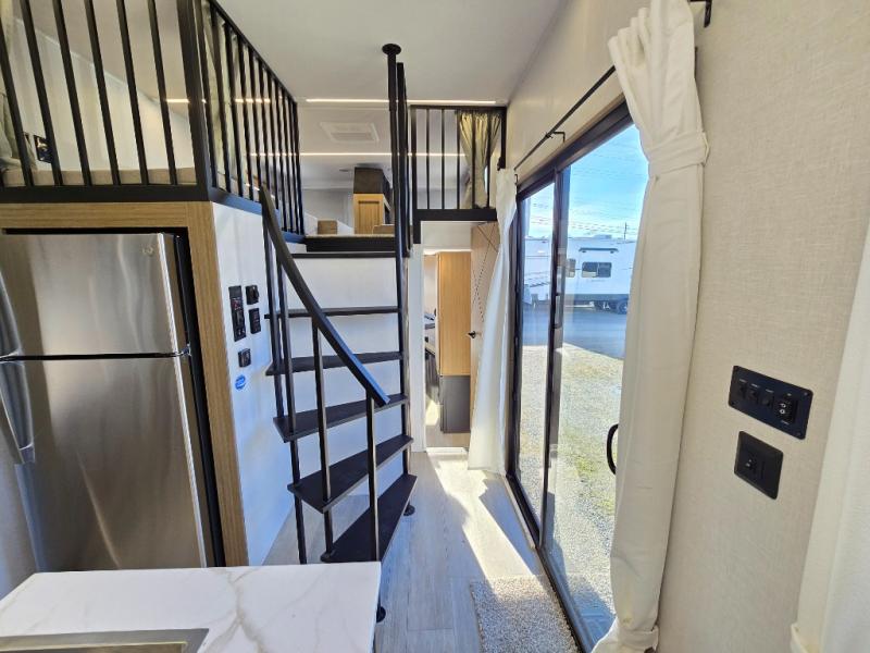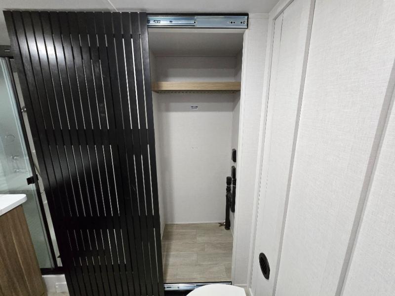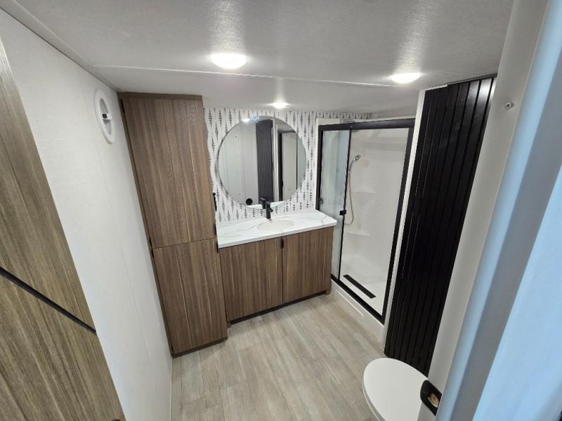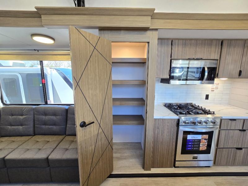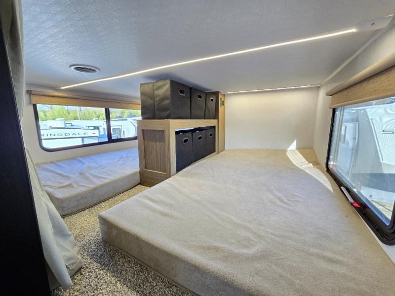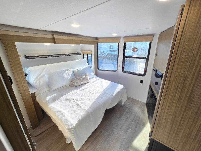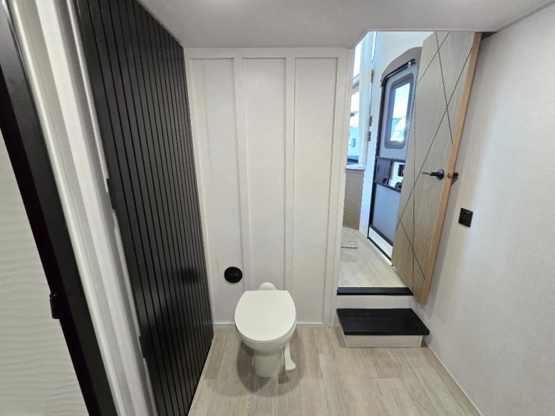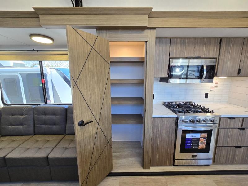This trailer is built with comfort and convenience in mind, offering plenty of sleeping space for the whole gang. It has two spacious lofts, each equipped with two 42" x 72" bunk mats, plus an extra 36" x 38" bunk mat, providing cozy sleeping spots for everyone. Each loft also includes built-in storage for essentials, and instead of climbing a ladder, easy stair access makes getting in and out much safer. On the main floor, you’ll find a full rear bathroom with a walk-in shower and washer/dryer prep. The main living area has a large sectional sofa, perfect for gathering the group to watch the TV on the Televator or relaxing by the fireplace after a day outdoors. The kitchen is equipped with all the essentials, including a large pantry, overhead cabinets for snack storage, a fridge, and a kitchen island that adds prep space. Up front, the private bedroom has a king bed with Versa Tilt, a dresser, and shelves to keep your clothes and camp gear neatly organized. Regardless that you're adventuring about, this trailer is ready to make every trip feel like home.