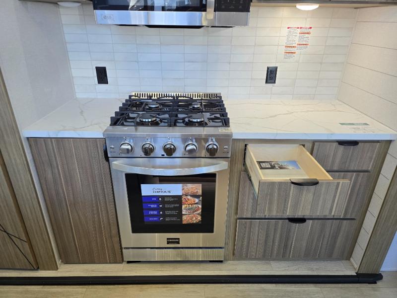 With any Wildwood Grand Lodge destination trailer by Forest River, you can enjoy extended stays wherever you go! There is 4K awning blade lighting outside, along with Tufflex PVC roofing, plus a heated and enclosed Accessibelly for added protection. Inside, you'll love the stylish backsplash update, elegant curtain rods and curtains, TFL black walnut entertainment shelves, and stainless-steel kitchen appliances. A Serta mattress in the bedroom(s) will provide comfort to each journey, and there is a tankless water heater for hot water when you need it.