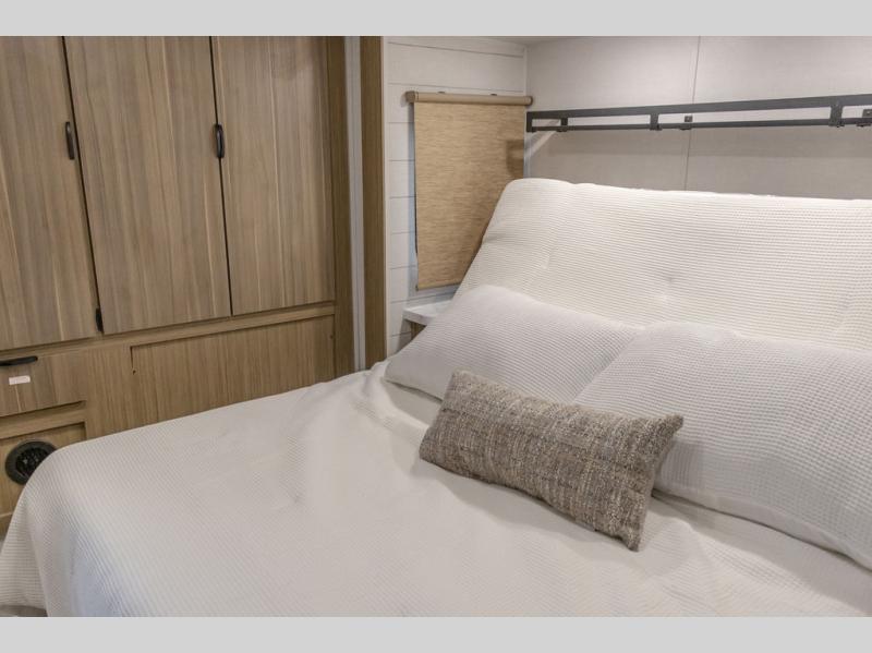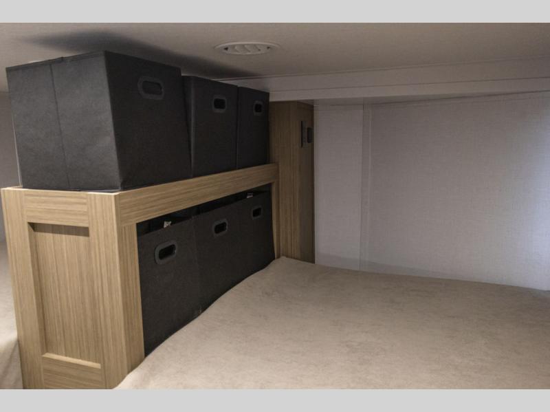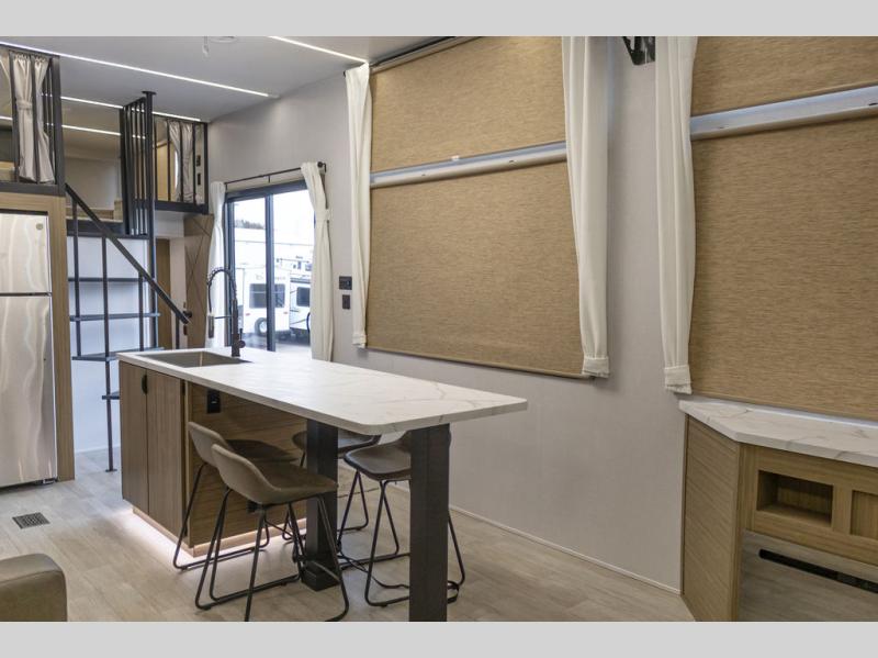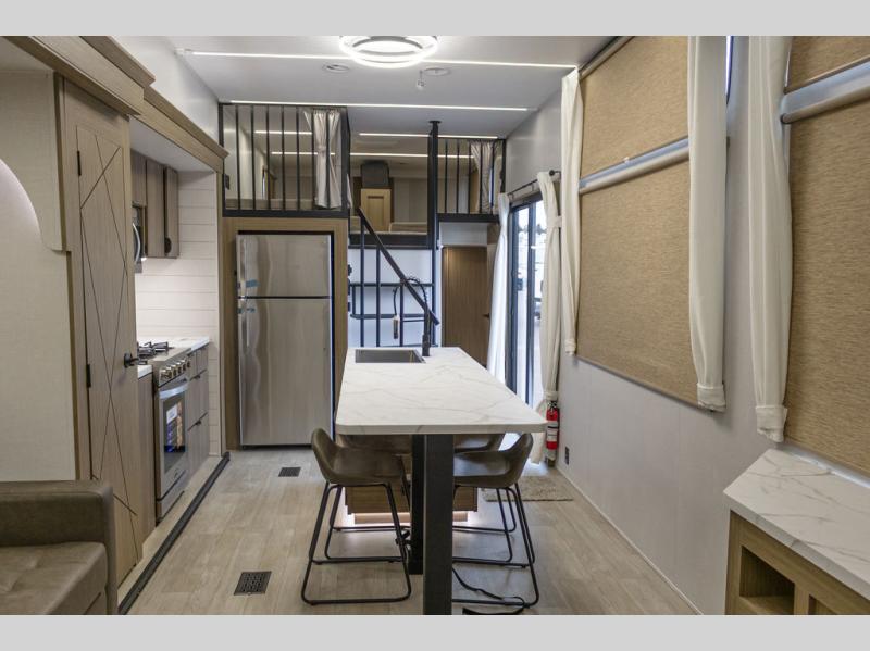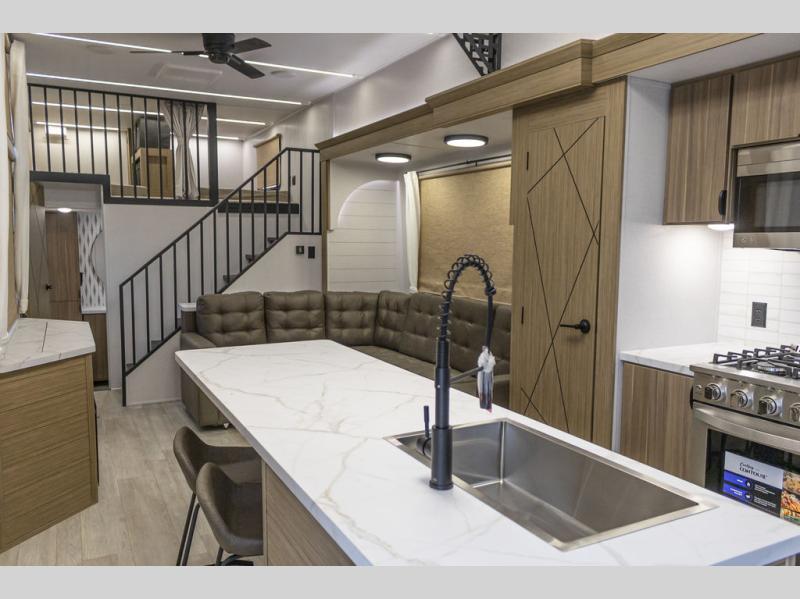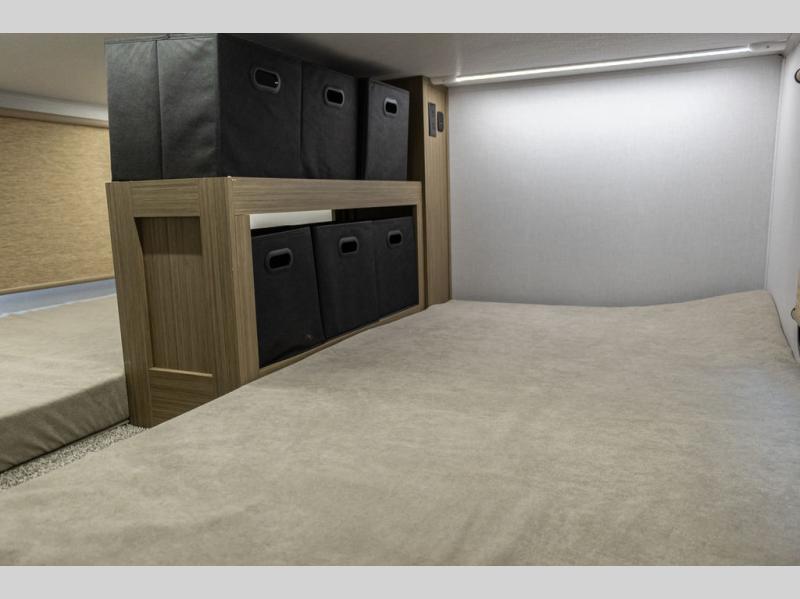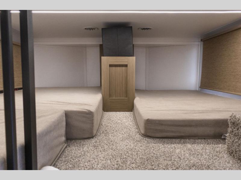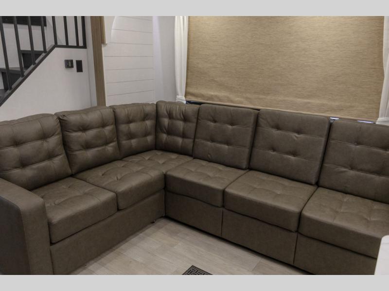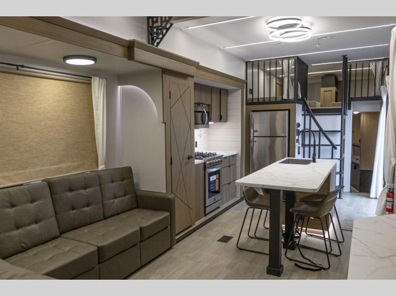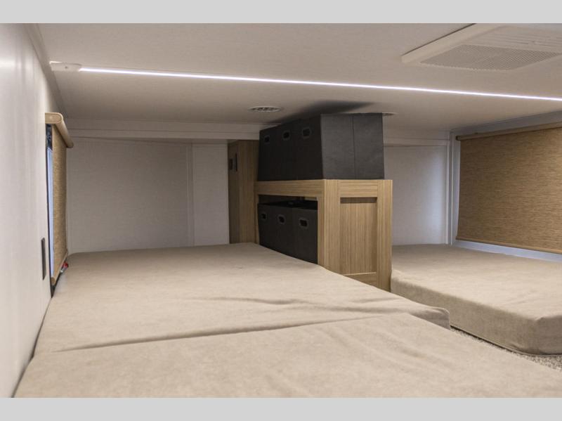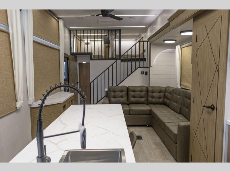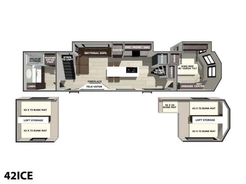 This trailer is built with comfort and convenience in mind, offering plenty of sleeping space for the whole gang. It has two spacious lofts, each equipped with two 42" x 72" bunk mats, plus an extra 36" x 38" bunk mat, providing cozy sleeping spots for everyone. Each loft also includes built-in storage for essentials, and instead of climbing a ladder, easy stair access makes getting in and out much safer. On the main floor, you’ll find a full rear bathroom with a walk-in shower and washer/dryer prep. The main living area has a large sectional sofa, perfect for gathering the group to watch the TV on the Televator or relaxing by the fireplace after a day outdoors. The kitchen is equipped with all the essentials, including a large pantry, overhead cabinets for snack storage, a fridge, and a kitchen island that adds prep space. Up front, the private bedroom has a king bed with Versa Tilt, a dresser, and shelves to keep your clothes and camp gear neatly organized. Regardless that you're adventuring about, this trailer is ready to make every trip feel like home.