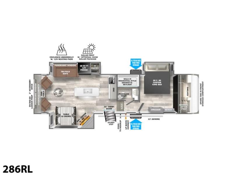 Whether you enjoy being outside or inside, this Wildwood Heritage Glen fifth wheel gives you the best of both! Imagine relaxing in a chair or on the tri-fold sofa and being able to look out panoramic windows at the scenery. Or, you might like to watch a show on the 50" LED TV with a fireplace below, and you can dine at the table and chairs that allows you to move the chairs if needed. The 16-cubic foot 12V refrigerator next to the pantry will allow you to stock up on ingredients and cold beverages for a long trip, and you will appreciate the custom king bed slide and the residential walk-in shower after being outside all day, even if just under the 13' awning. There is plenty of storage in the master bedroom and throughout, plus the XL Texas size pass-through compartment will surely come in handy for your charcoal, outdoor games, and such.