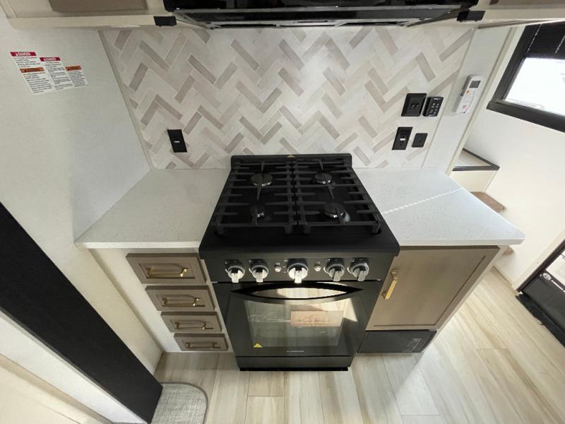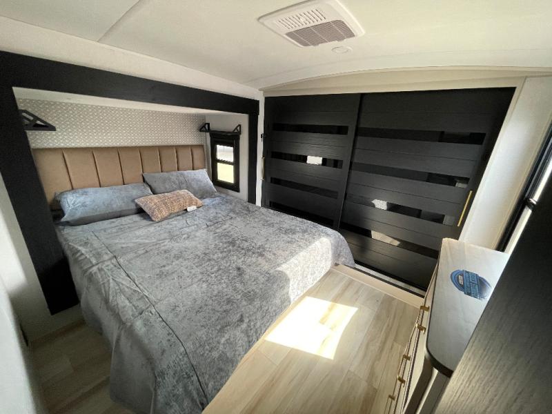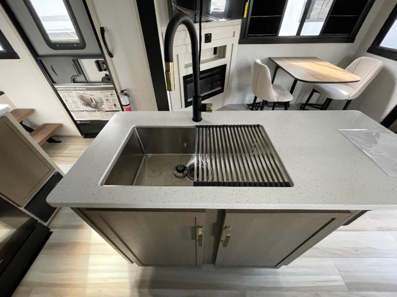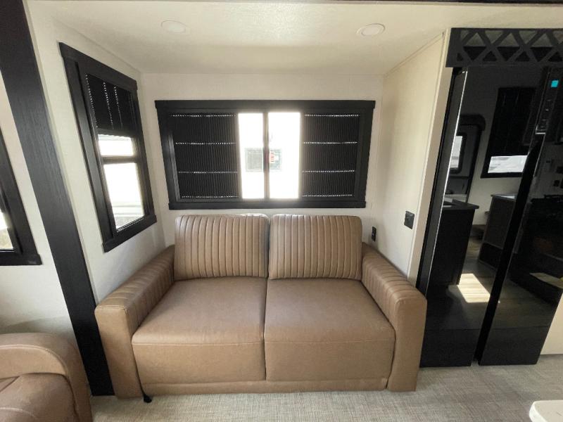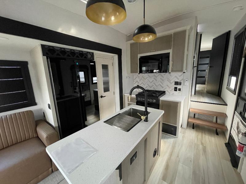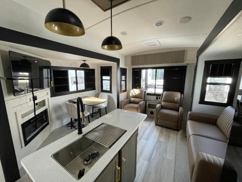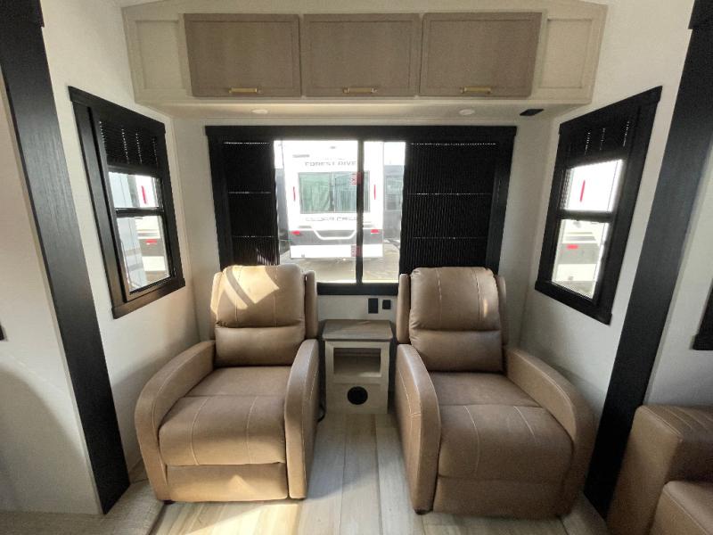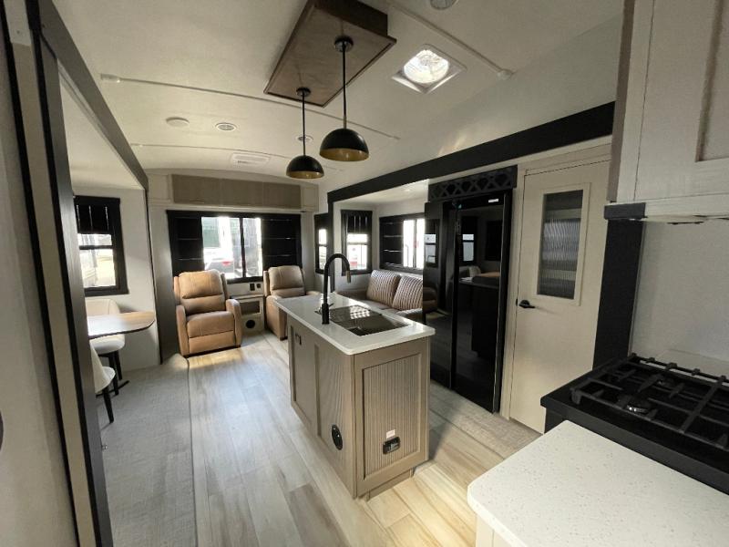 With any Wildwood Heritage Glen fifth wheel by Forest River, the quality construction, attention to detail and design along with a bright and welcoming interior allows you to relax in comfort. You'll love the high-end solid surface countertops included in the Elevated Value Package, along with a JBL sound system, full-length barreled ceilings, and an ultimate interior lighting upgrade. The included Expedition Package features an Accesibelly underbelly panel with 12V tank heaters, nitrogen-filled tires with aluminum rims, and a spacious 30" wide main entry door with a window. The Lippert On-The-Go ladder prep and back-up camera prep let you customize your fifth wheel even more, and the LED awning, front cap, marker and taillights will make it easier than ever to set up camp!