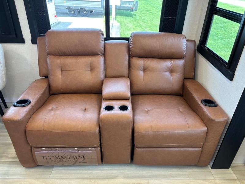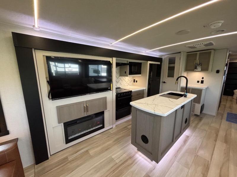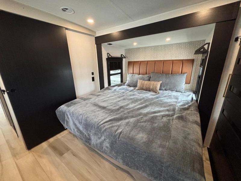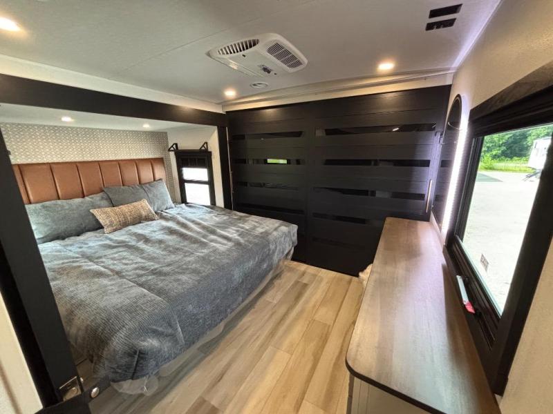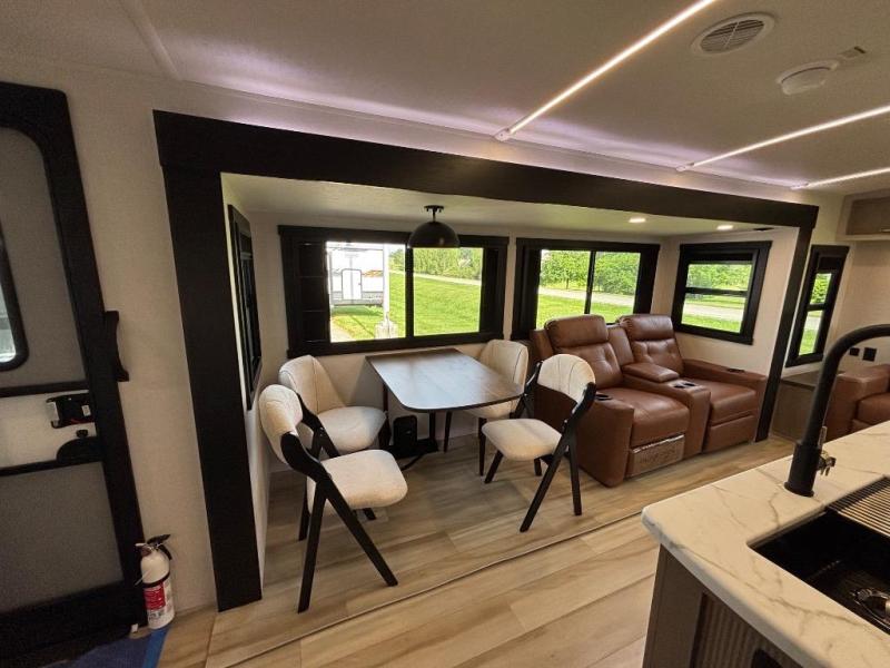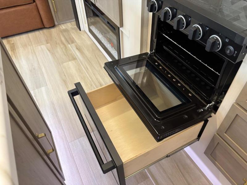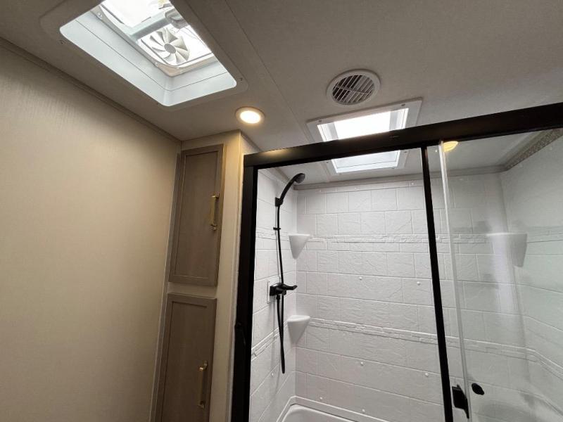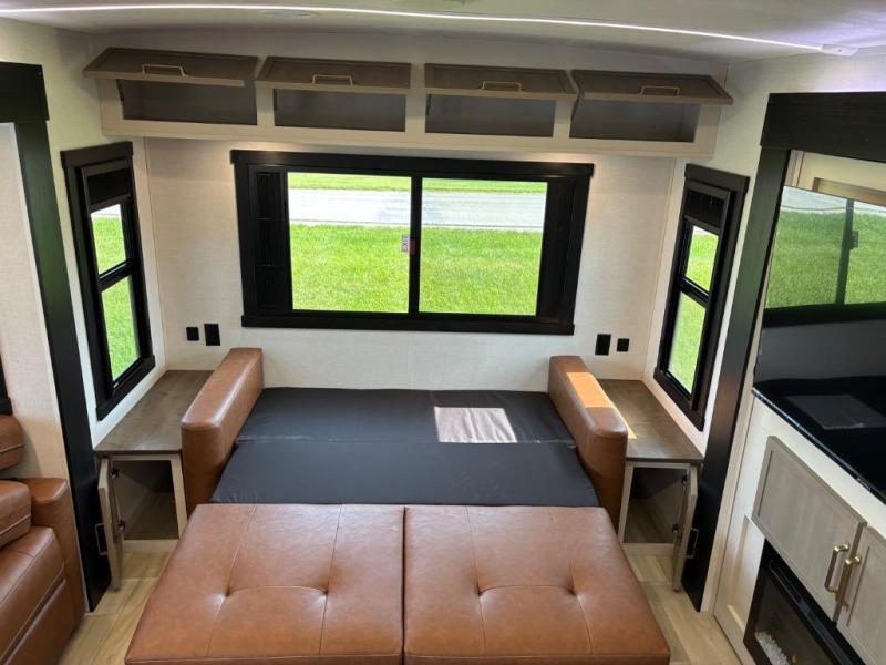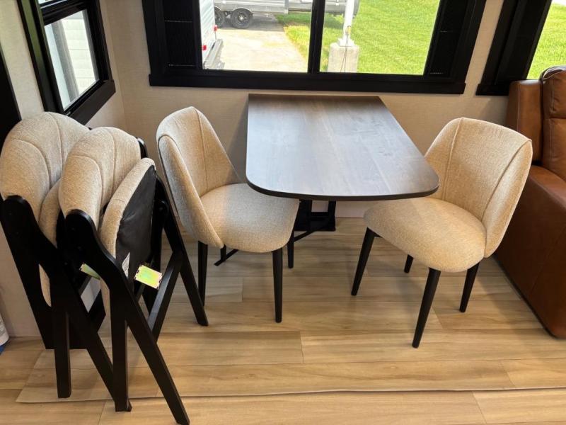 You are going to love the spacious private bedroom with a space-saving door, custom king bed slide, a dresser, and a full-width wardrobe with washer and dryer prep. If you ever decide to get out of bed, you can enjoy a relaxing shower in the residential shower with a skylight and a wide-open kitchen and living area with dual opposing slide outs. The cook will love having a kitchen island, a hutch, a large pantry, plus a 12V refrigerator. There is an entertainment center with a 50" TV and fireplace plus plenty of seating on the furniture. You can dine at the booth dinette or choose to add the free-standing dinette option if you prefer having your own seat. And don't forget about the natural lighting and views you will receive from the panoramic windows.
