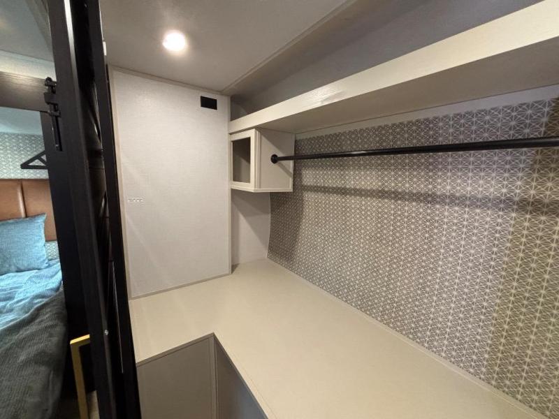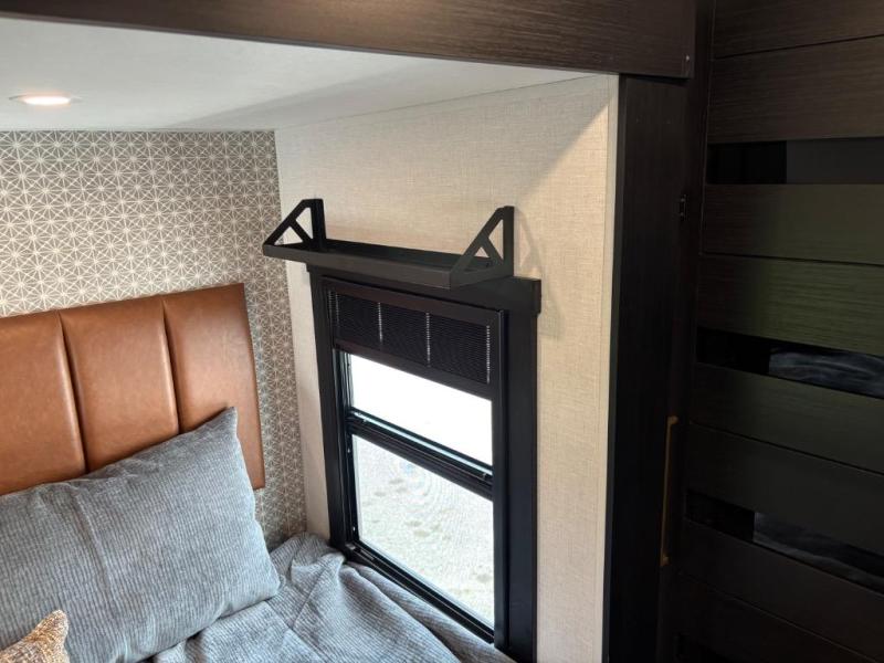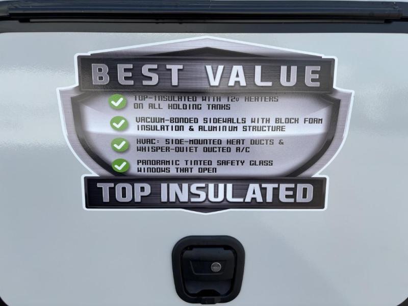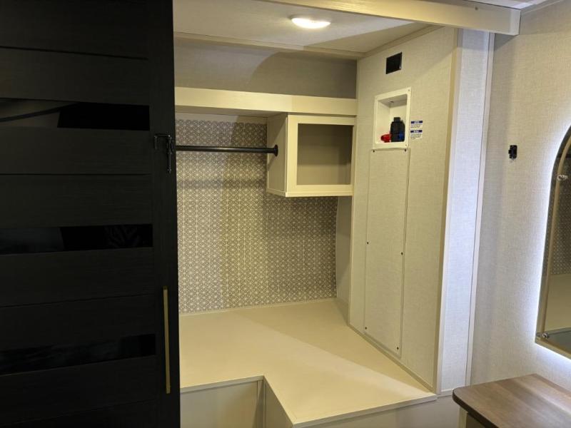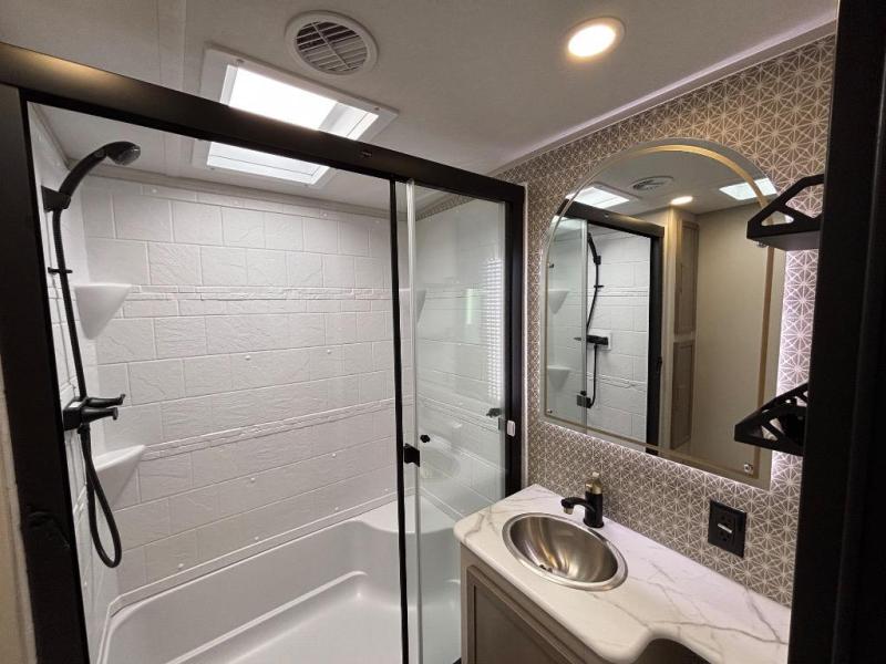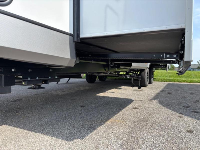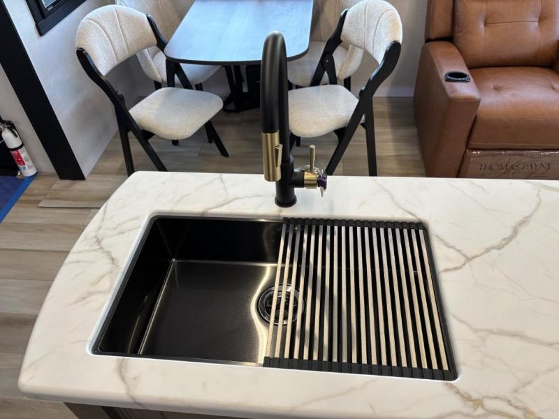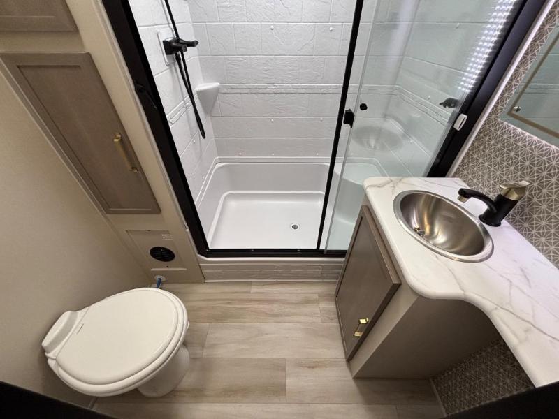 You are going to love the spacious private bedroom with a space-saving door, custom king bed slide, a dresser, and a full-width wardrobe with washer and dryer prep. If you ever decide to get out of bed, you can enjoy a relaxing shower in the residential shower with a skylight and a wide-open kitchen and living area with dual opposing slide outs. The cook will love having a kitchen island, a hutch, a large pantry, plus a 12V refrigerator. There is an entertainment center with a 50" TV and fireplace plus plenty of seating on the furniture. You can dine at the booth dinette or choose to add the free-standing dinette option if you prefer having your own seat. And don't forget about the natural lighting and views you will receive from the panoramic windows.