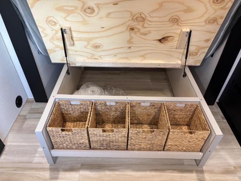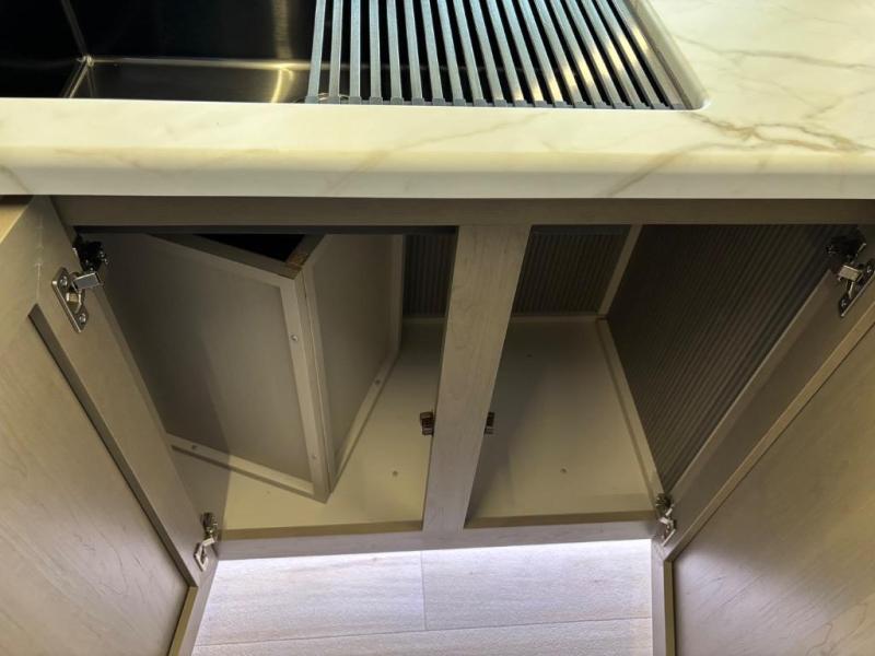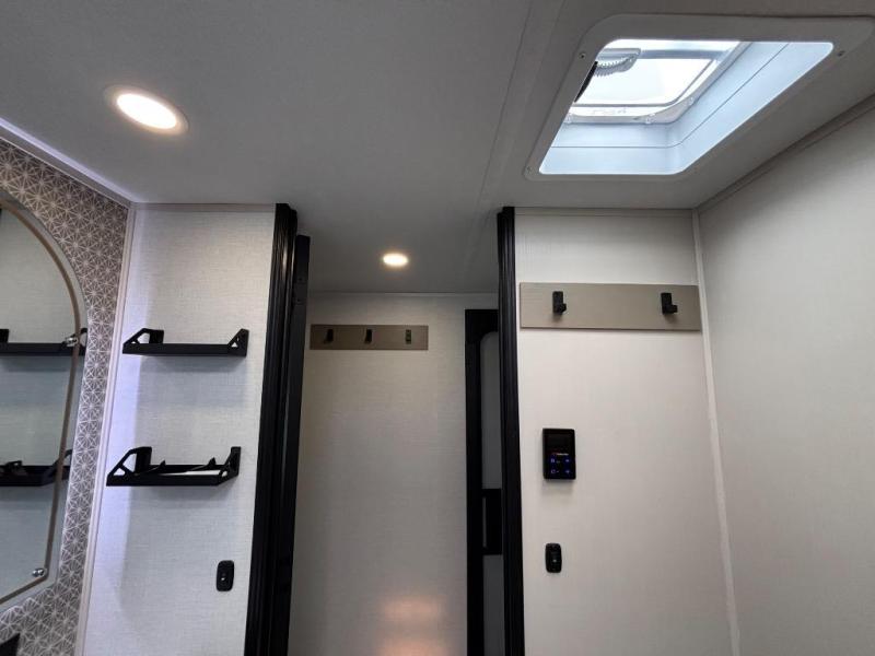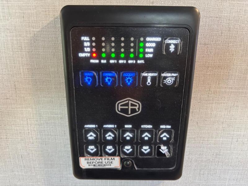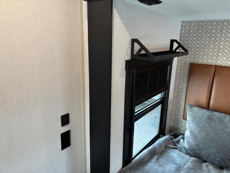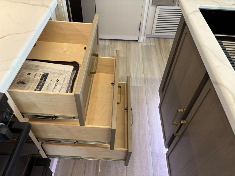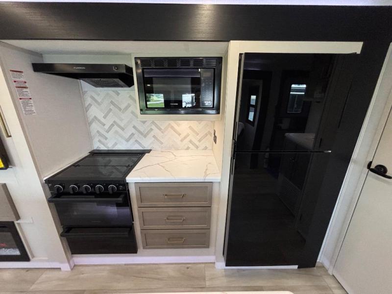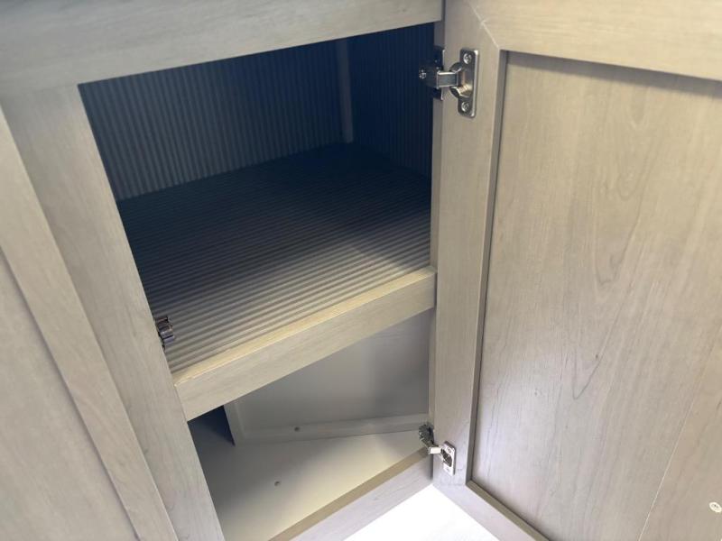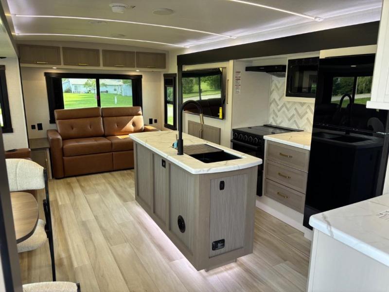 You are going to love the spacious private bedroom with a space-saving door, custom king bed slide, a dresser, and a full-width wardrobe with washer and dryer prep. If you ever decide to get out of bed, you can enjoy a relaxing shower in the residential shower with a skylight and a wide-open kitchen and living area with dual opposing slide outs. The cook will love having a kitchen island, a hutch, a large pantry, plus a 12V refrigerator. There is an entertainment center with a 50" TV and fireplace plus plenty of seating on the furniture. You can dine at the booth dinette or choose to add the free-standing dinette option if you prefer having your own seat. And don't forget about the natural lighting and views you will receive from the panoramic windows.