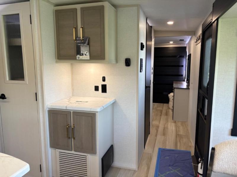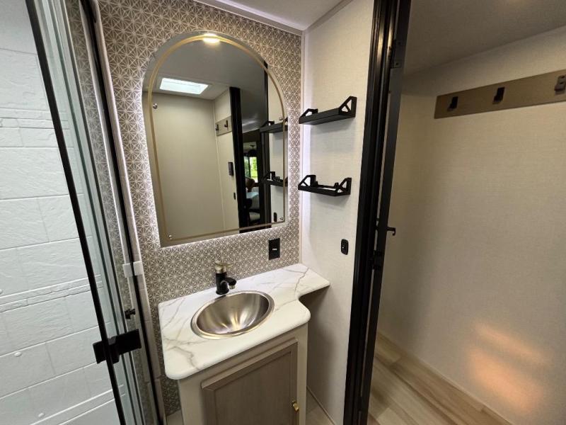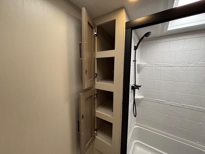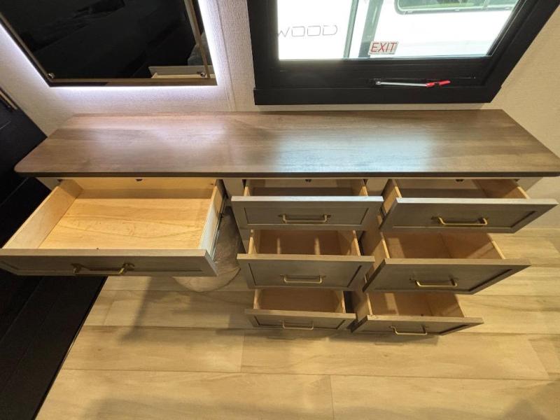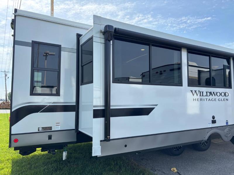 With any Wildwood Heritage Glen travel trailer by Forest River, the quality construction, attention to detail and design along with a bright and welcoming interior allows you to relax in comfort with conveniences while exploring outdoors. Each model includes a WeatherShield one piece fiberglass roof, Maxxis radial tires, and an enclosed underbelly with 12V tank heaters on all holding tanks for added protection. You will appreciate the on-demand tankless water heater, along with the 15K BTU Quite Cool A/C and 50 Amp service with a brace for a second A/C. There is an outside shower with hot and cold water, solar prep, a power tongue jack, plus many more exterior conveniences. Head inside to enjoy matte gold hardware, wood door casings in place of plastic door casings, and full length barreled ceilings for additional head room.