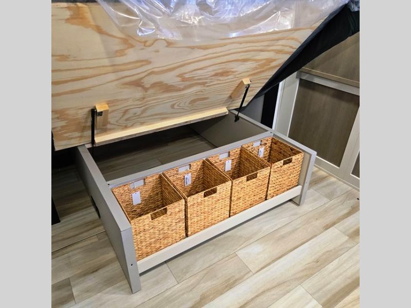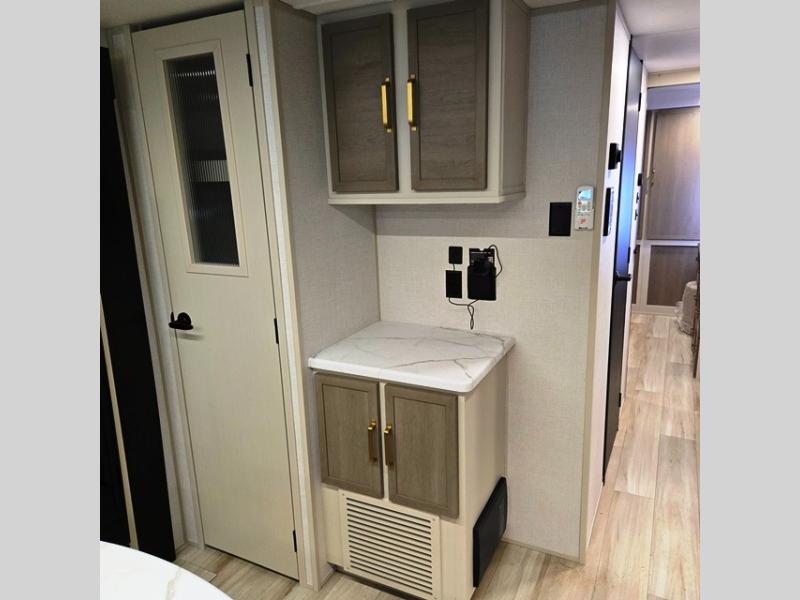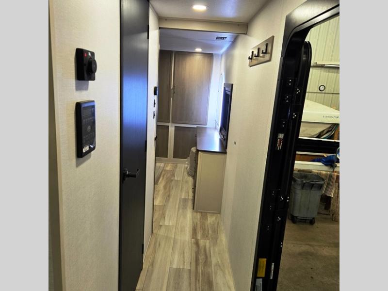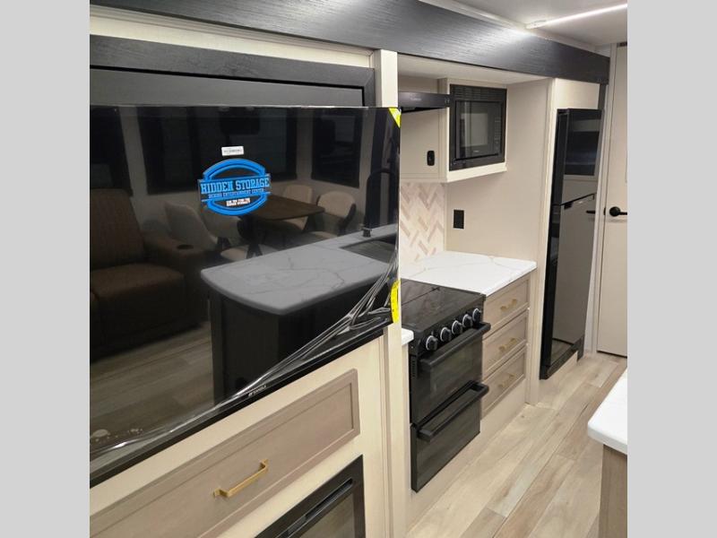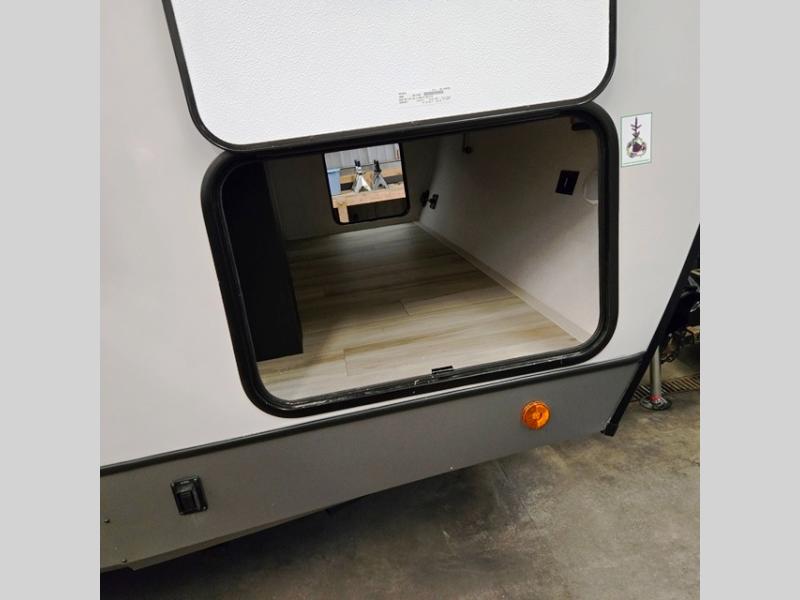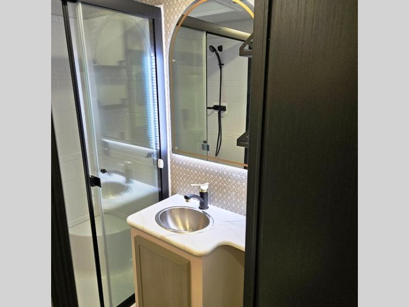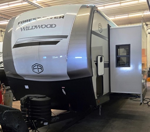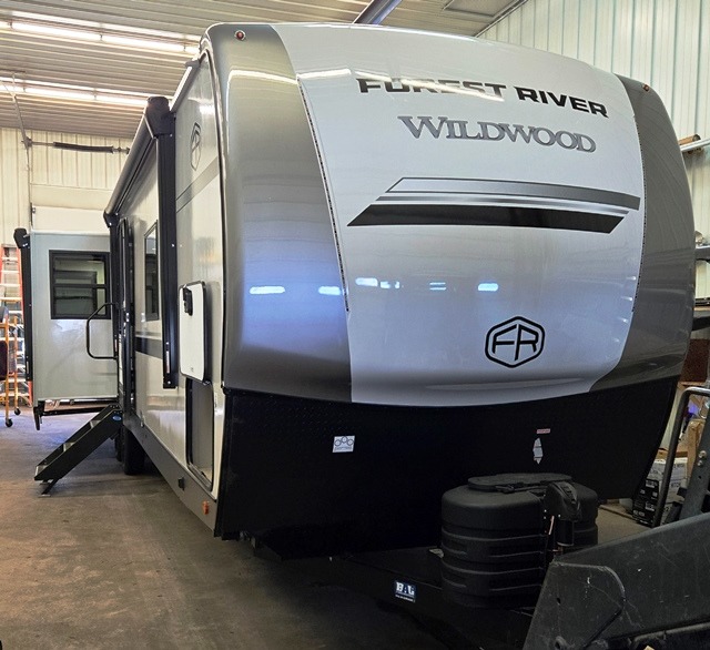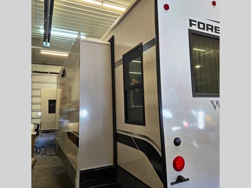 With any Wildwood Heritage Glen travel trailer by Forest River, the quality construction, attention to detail and design along with a bright and welcoming interior allows you to relax in comfort. Each model includes a WeatherShield one piece fiberglass roof, nitrogen-filled radial tires, and an enclosed underbelly with 12V tank heaters on all holding tanks for added protection. You will appreciate the on-demand tankless water heater, along with power stabilizer and tongue jacks, and an extra-large pass-thru storage with slam latch baggage doors. Head inside to enjoy matte gold hardware, wood door casings in place of plastic door casings, and an ultimate interior lighting upgrade with 4k puck/strip lights and a stylish LED back-lit bath mirror!