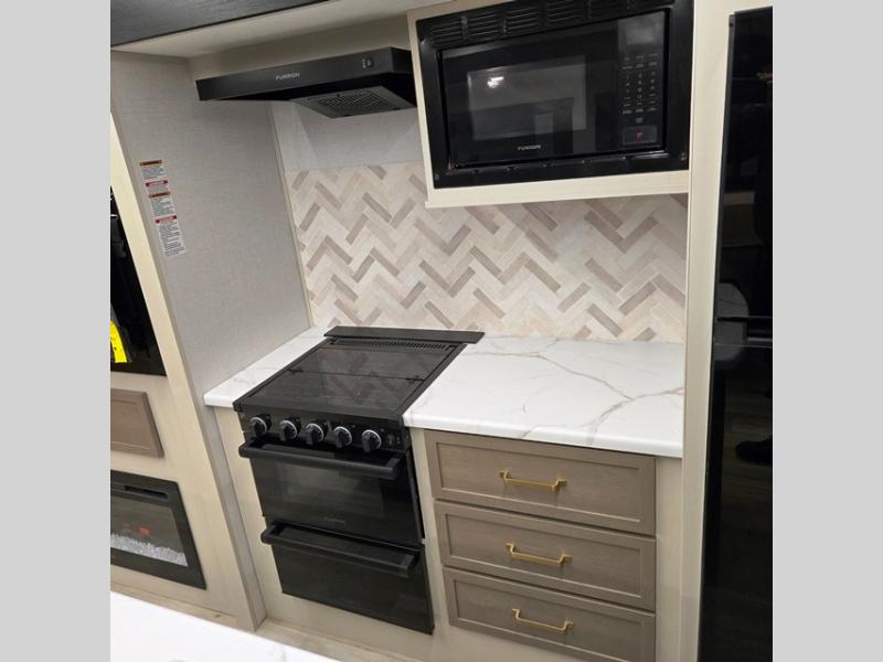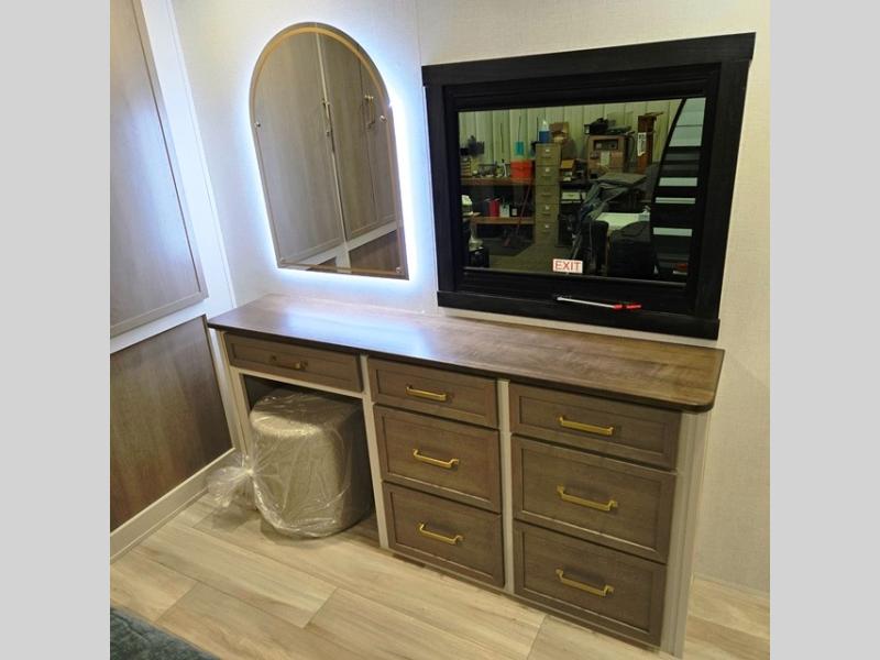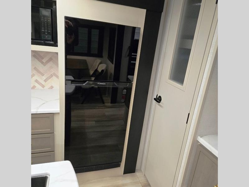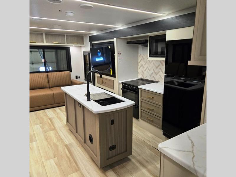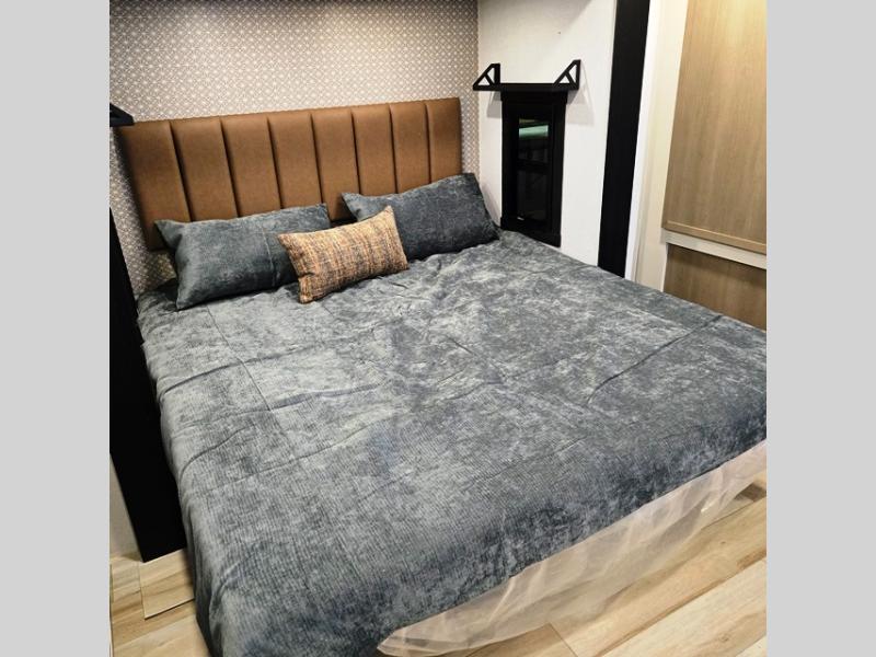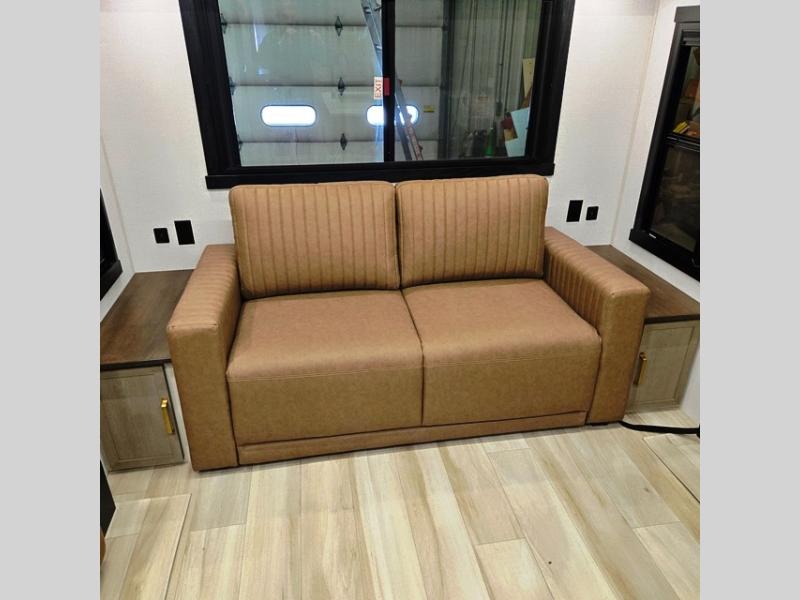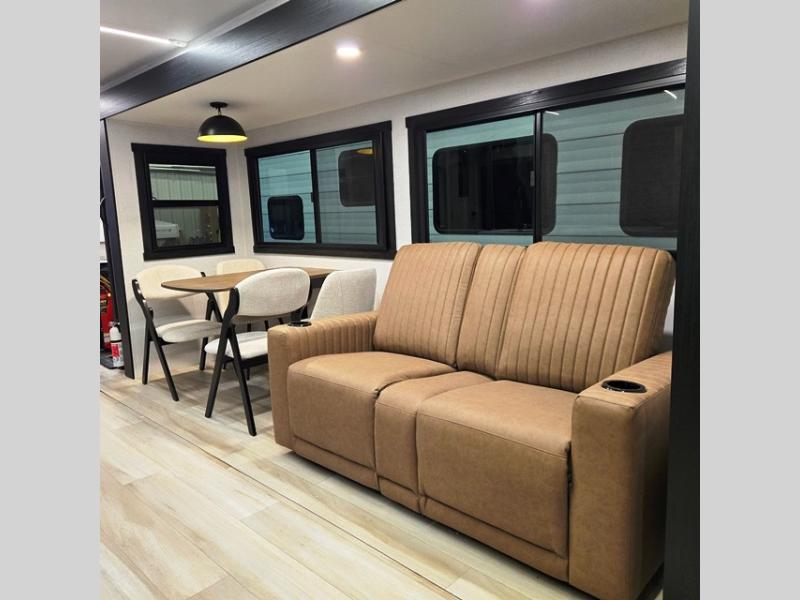 You are going to love the spacious private bedroom with a space-saving door, king bed slide, a dresser, and a full-width wardrobe with washer and dryer prep. If you ever decide to get out of bed, you can enjoy a relaxing shower in the residential shower with a skylight and a wide-open kitchen and living area with dual opposing slide outs. The cook will love having a kitchen island, a hutch, a large pantry, plus a 12V refrigerator. There is an entertainment center with a 50" TV and fireplace plus plenty of seating on the furniture. You can dine at the booth dinette or choose to add the free-standing dinette option if you prefer having your own seat. And don't forget about the natural lighting and views you will receive from the panoramic windows.