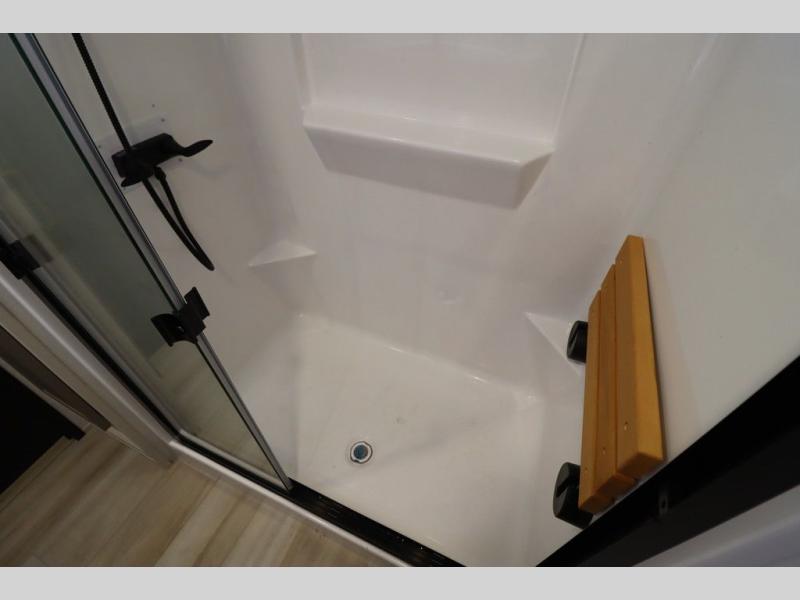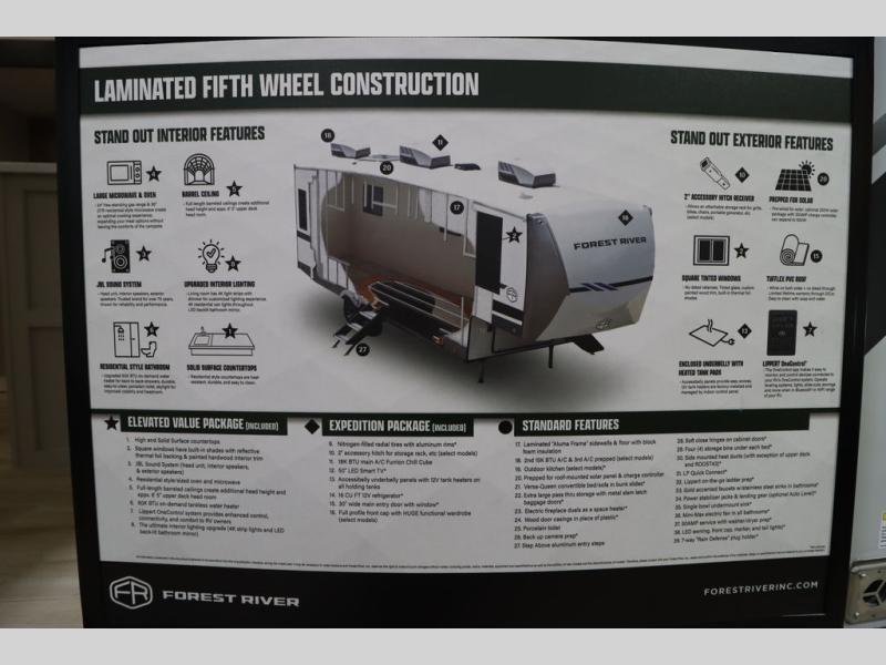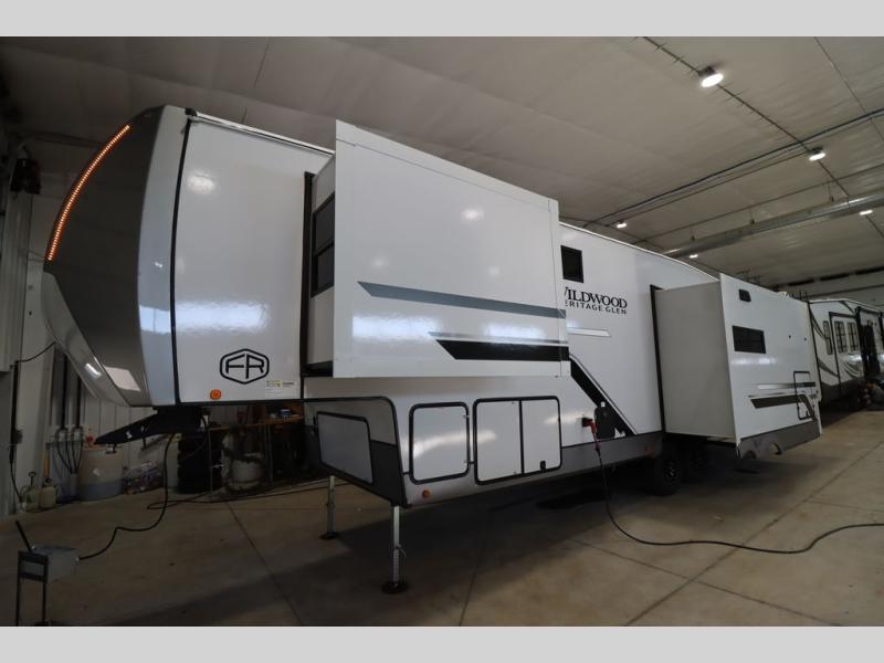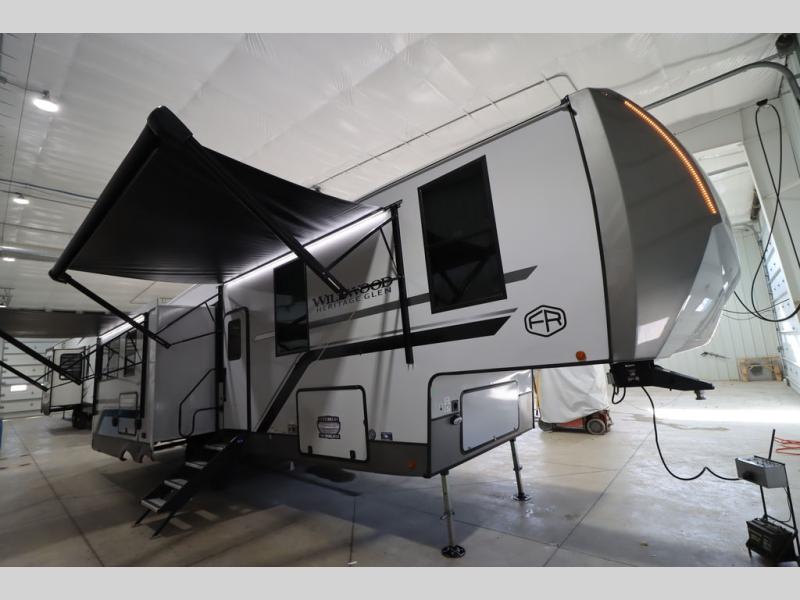 With any Wildwood Heritage Glen fifth wheel by Forest River, the quality construction, attention to detail and design along with a bright and welcoming interior allows you to relax in comfort. You'll love the high-end solid surface countertops included in the Elevated Value Package, along with a JBL sound system, full-length barreled ceilings, and an ultimate interior lighting upgrade. The included Expedition Package features an Accesibelly underbelly panel with 12V tank heaters, nitrogen-filled tires with aluminum rims, and a spacious 30" wide main entry door with a window. The Lippert On-The-Go ladder prep and back-up camera prep let you customize your fifth wheel even more, and the LED awning, front cap, marker and taillights will make it easier than ever to set up camp!